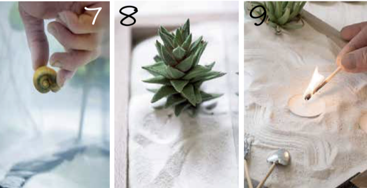 Javansku mahovinu omotajte oko grančica pomoću flaksa. Tako pripremljeno stabalce utisnite u pijesak u vodi tako da lončić ne bude vidljiv ispod pijeska. Potom prstima otisnite stazicu s vanjske strane, a zatim posložite kamenčiće u obliku stazice koja će spajati unutarnji i vanjski segment. Stazicu povucite skroz do stabalca.