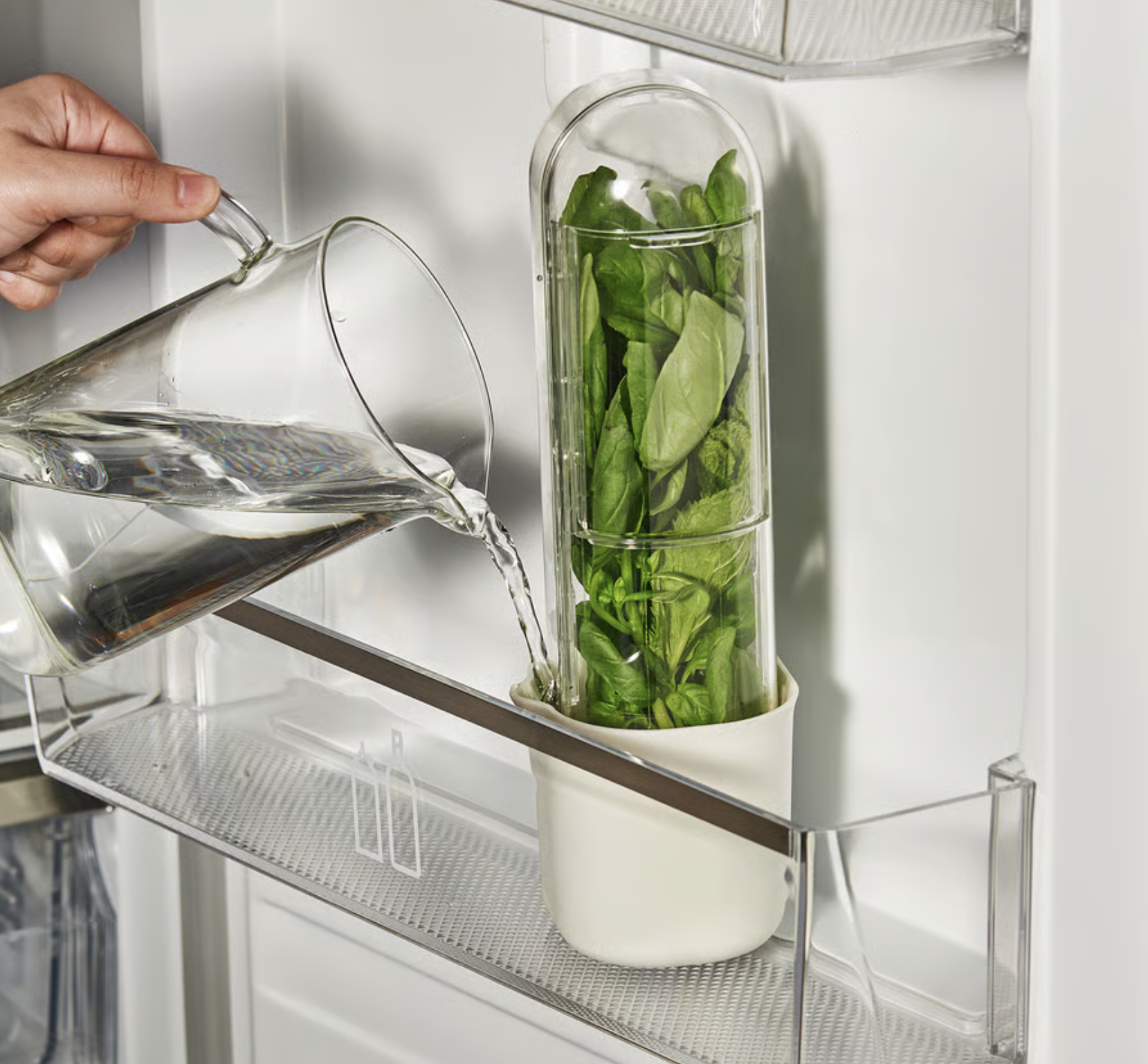 Sve što trebate učiniti jest ubaciti vlasac, kopar, mentu ili čak nekoliko mladih šparoga te pratiti njihovu svježinu kroz prozirni poklopac. Budući da se posuda može pohraniti uspravno, umjesto zgužvanog bilja na dnu ladice, začini će dulje zadržati i svoju strukturnu čvrstoću.