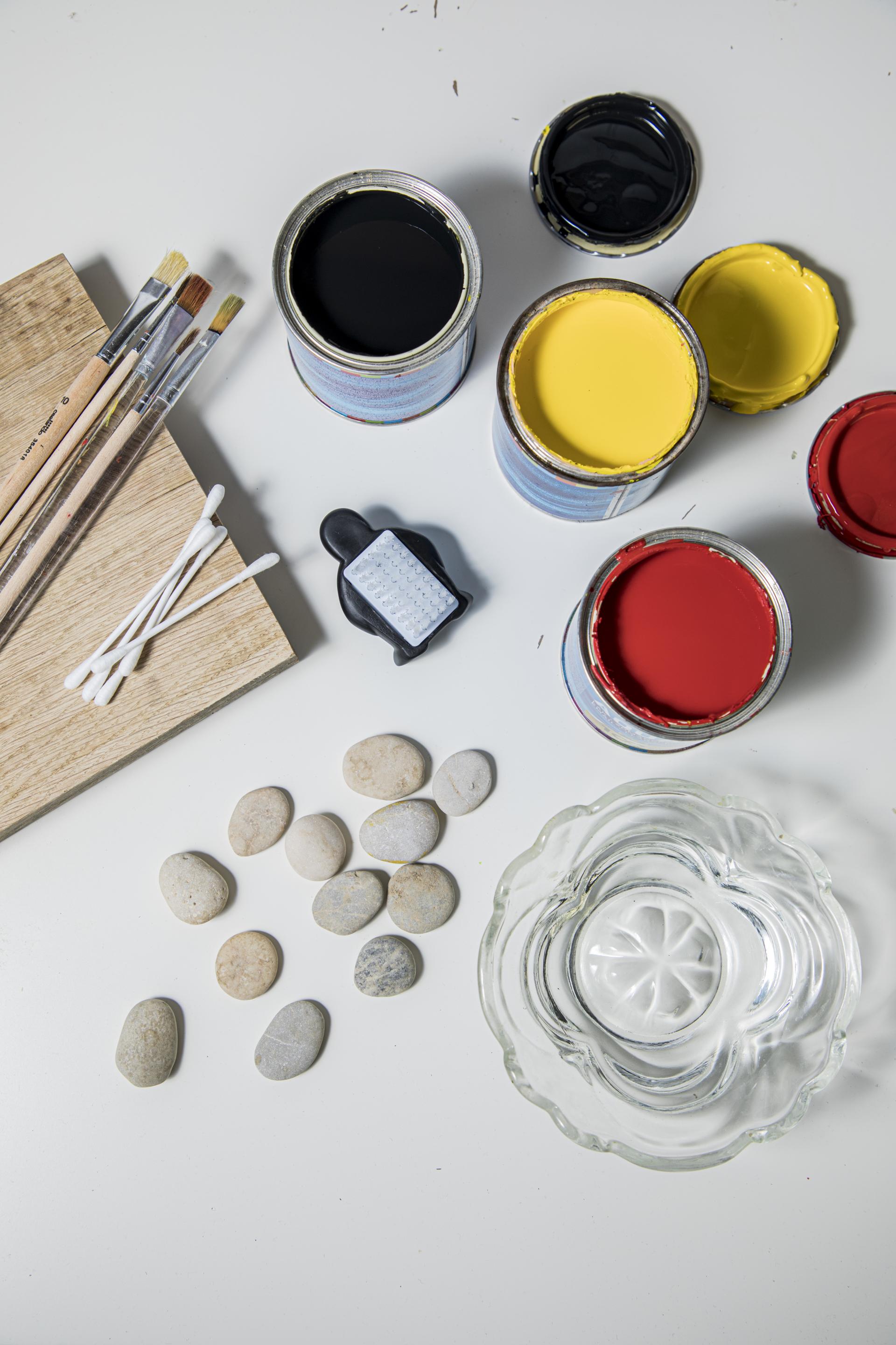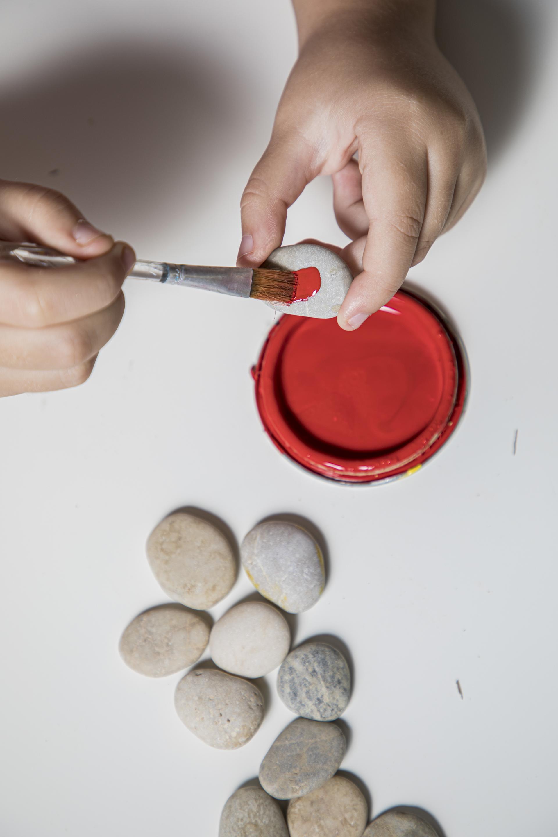 Potrebni materijal: drvena podloga, 14 kamenčića ovalnog oblika, crveni, žuti i crni lak na bazi vode (lakše se ispire s dječjih prstića), nekoliko kistova i štapići za uši.