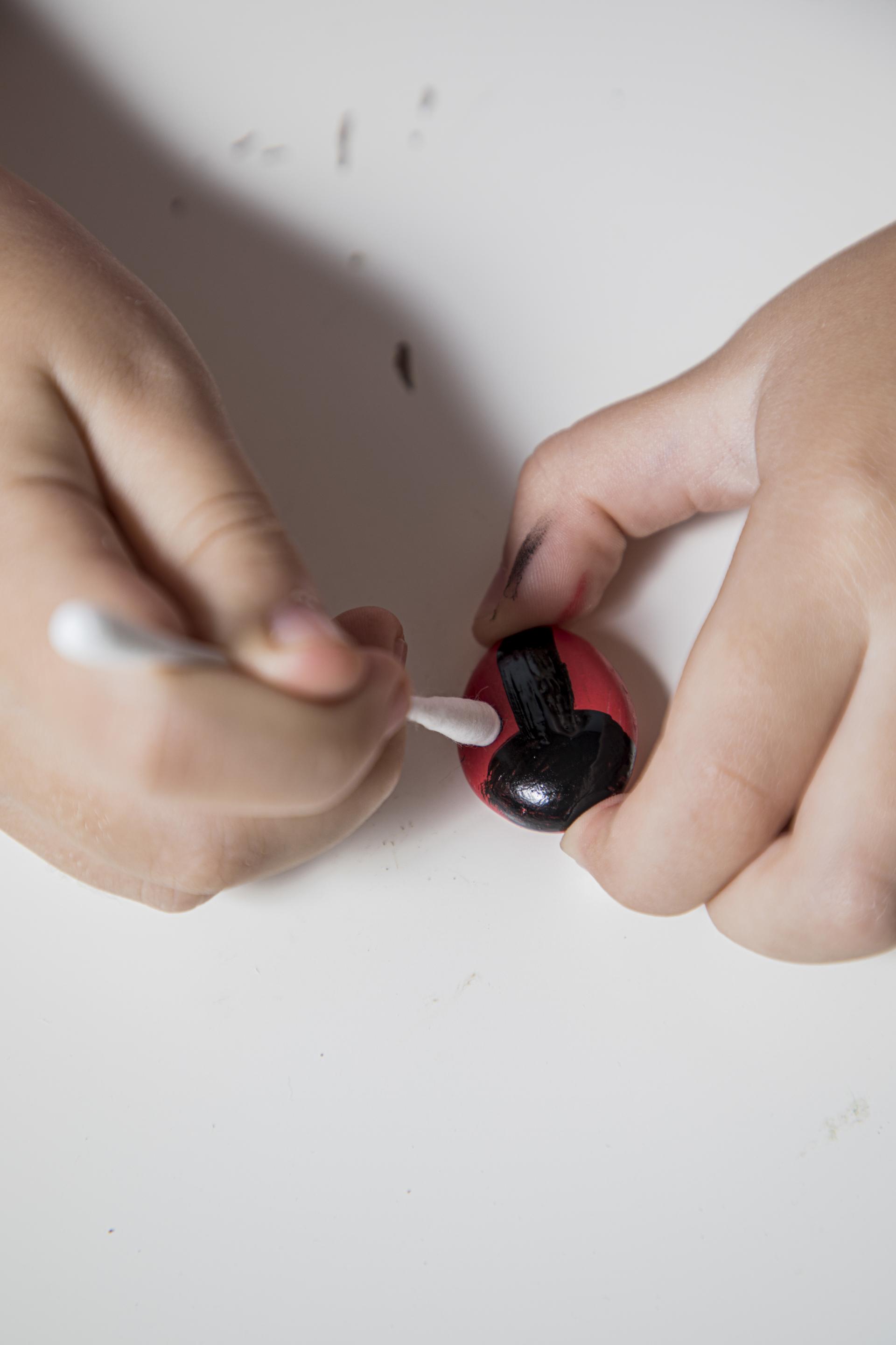 2. Jednak broj kamenčića boja se u crvenu i u žutu boju. Bubamarama je, nakon što se crvena boja osušila, crnom bojom iscrtana glava, krila, a štapićem za uši točkice na krilima i oči.