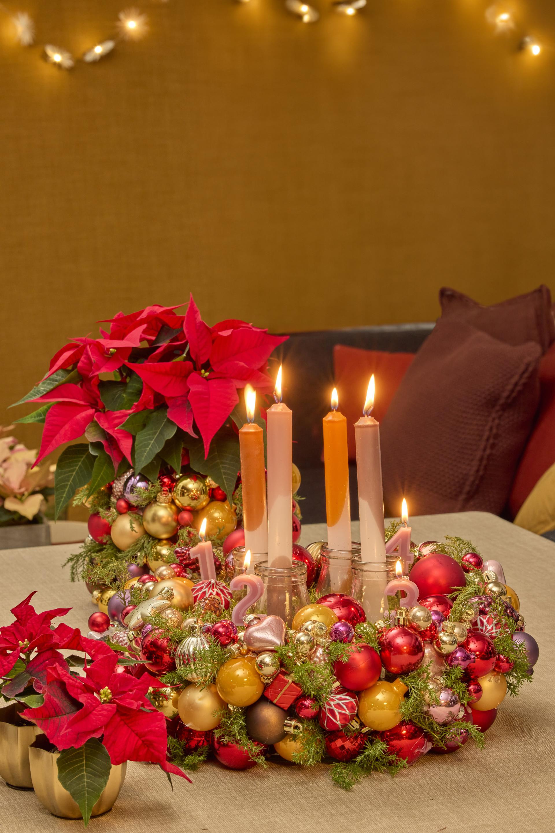 U središtu vijenca nalaze se četiri stupa svijeća u staklenkama ispunjenim pijeskom. Dvije crvene mini božićne zvijezde u zlatnim posudama upotpunjuju blagdanski izgled.