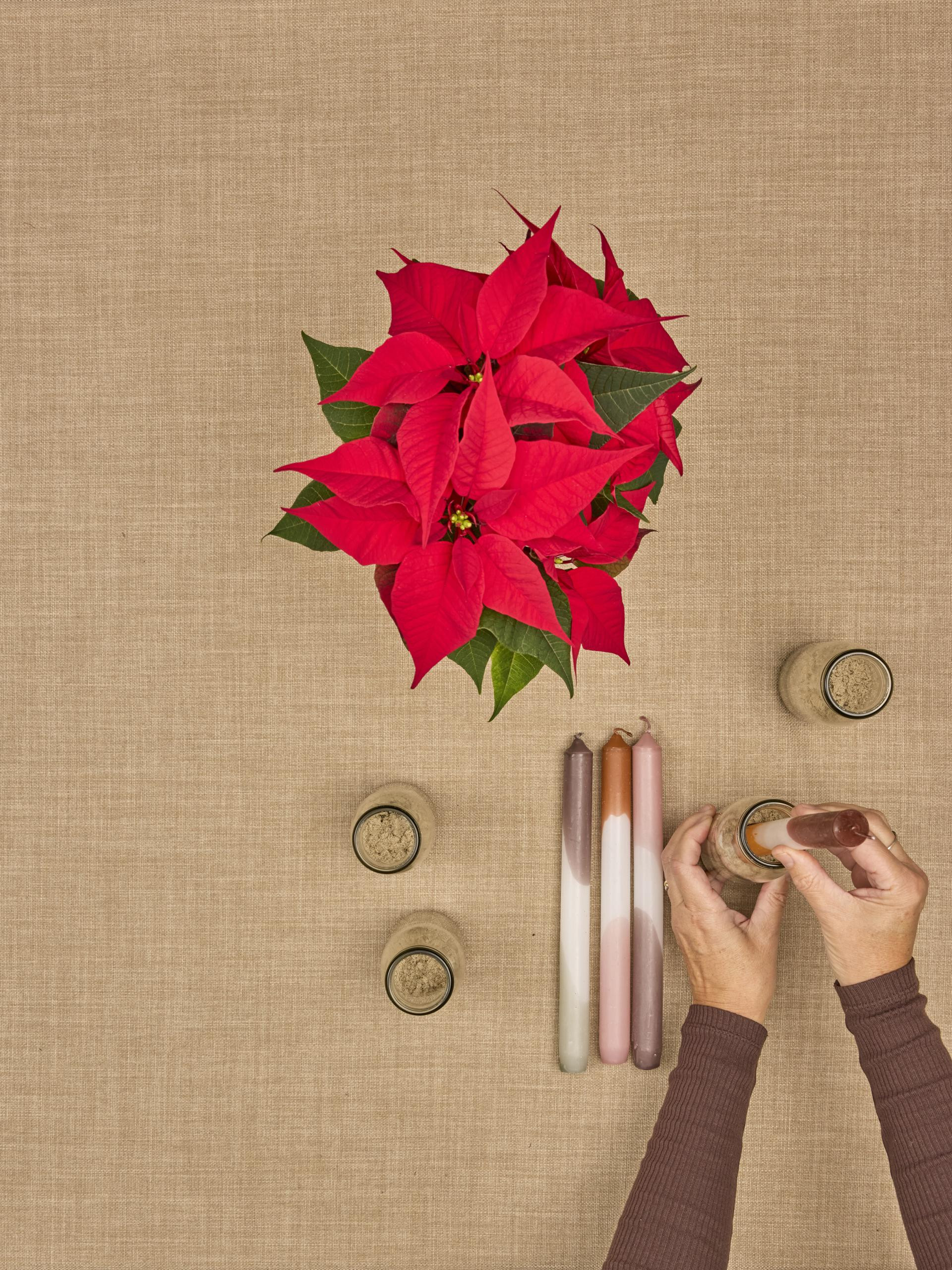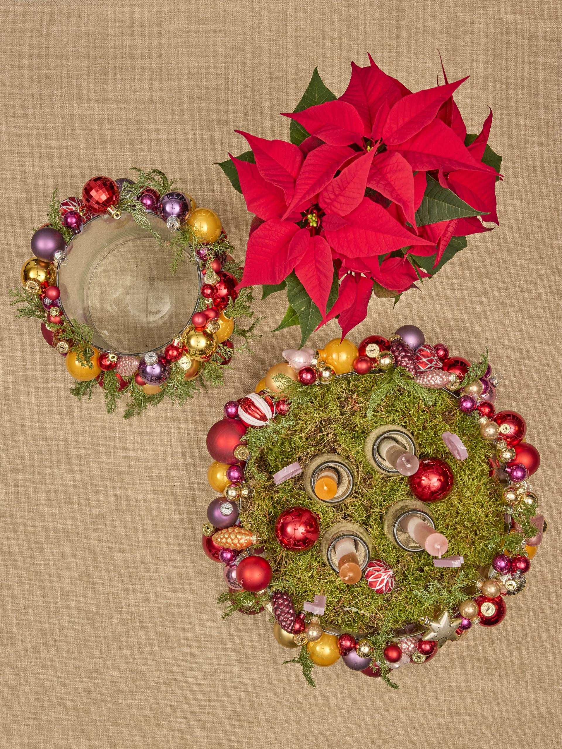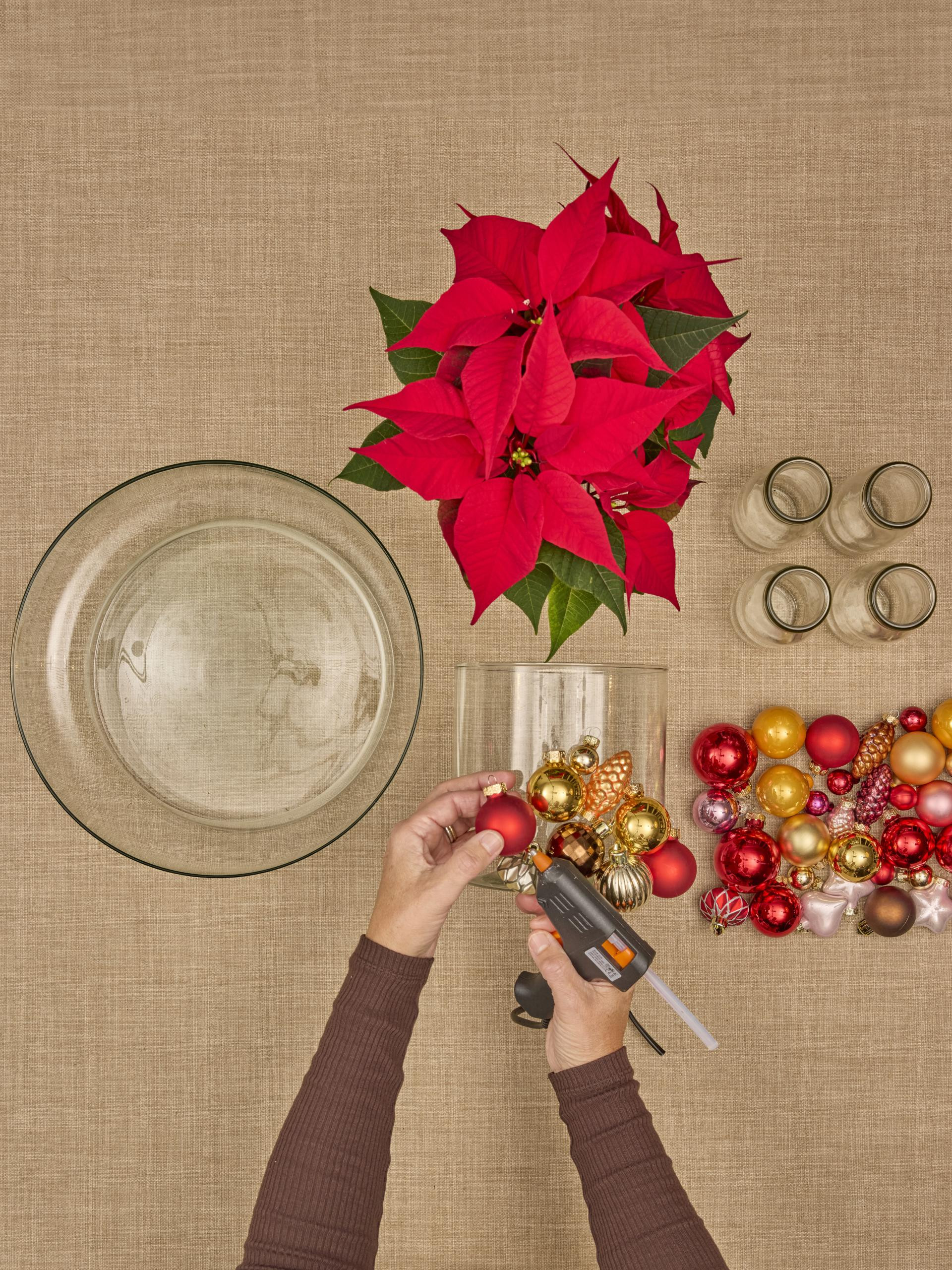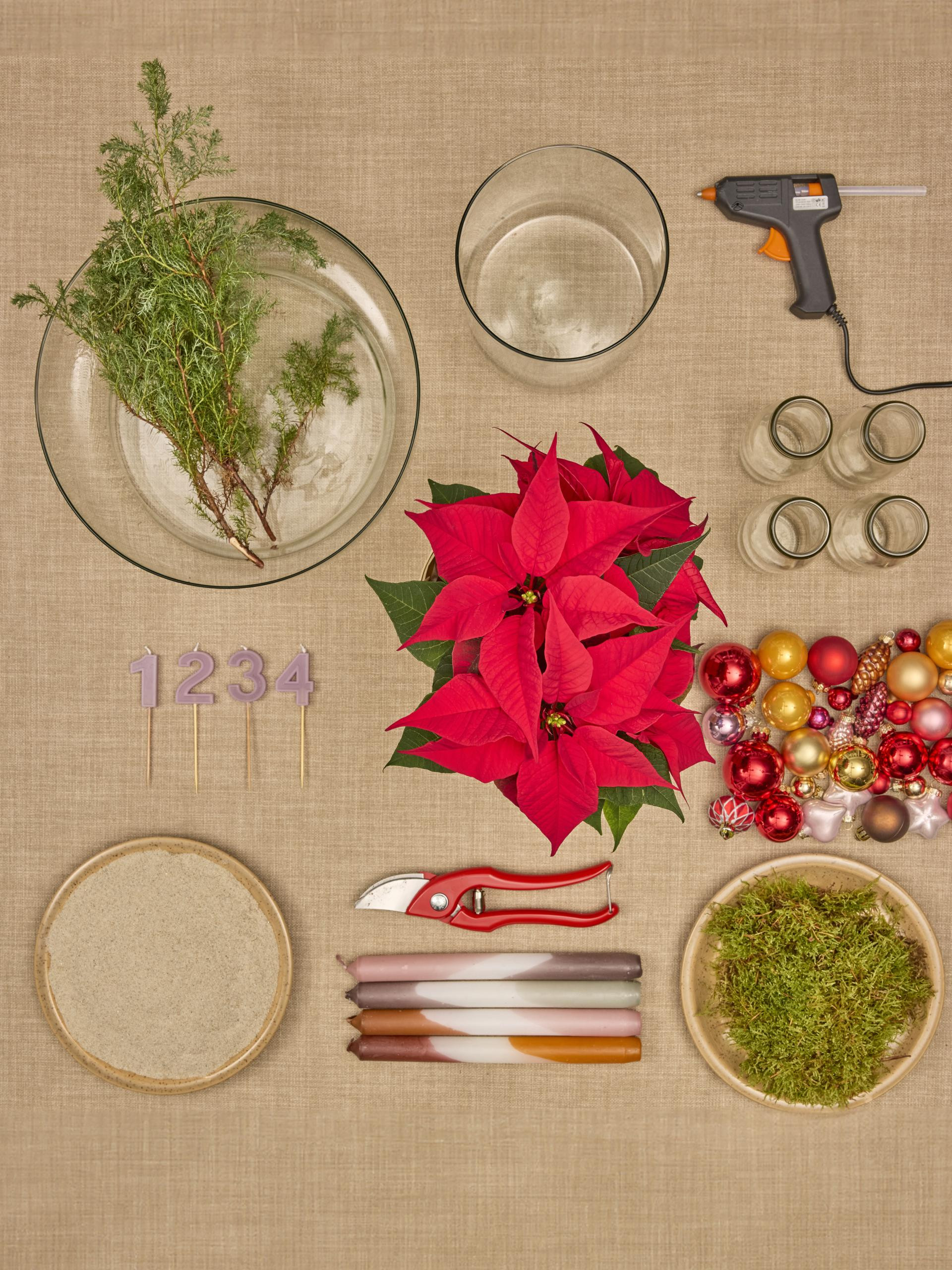 Za izradu ovih dekoracija trebat će vam: crvena božićna zvijezda, plitka staklena zdjela, cilindrična staklena vaza, četiri svijeće u ombré ili dvobojnim toplim tonovima, četiri male, širokovrate staklene boce za držanje svijeća, šarene kuglice (sjajne i mat) raznih veličina, ostali ukrasi poput češera, grančica kleka, konzervirana mahovina, fini pijesak, pištolj za vruće ljepilo i patrone, škare za grane, četiri numerirane svijeće na štapićima (od 1 do 4).