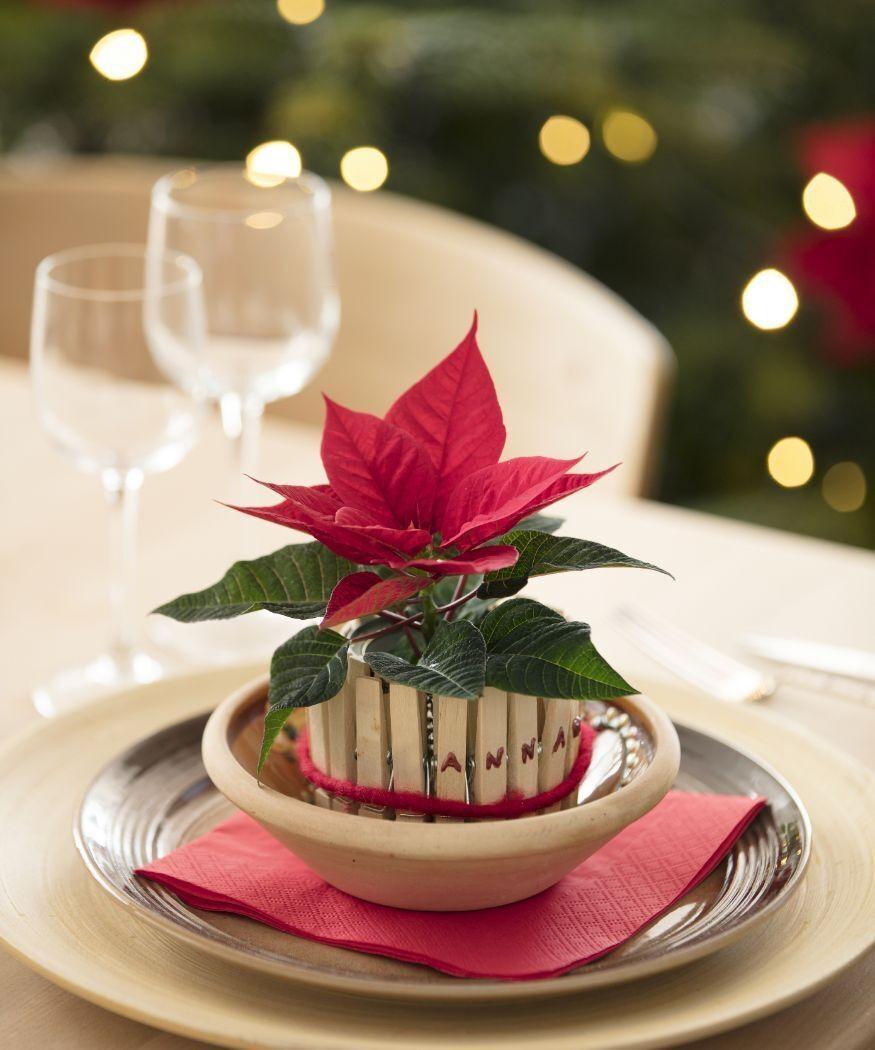 Spoj prirodnih materijala i klasičnih božićnih boja stvara toplu i ugodnu atmosferu. Za ovu simpatičnu DIY dekoraciju trebat će vam: raskošna crvena božićna zvijezda, četiri čvrste, velike drvene kvačice, četiri epruvete, zlatni karton, šablona u obliku zvijezde, drveni štapići, škare, pištolj za vruće ljepilo, crveni marker, olovka, mahovina i bočica s vodom na pritisak.