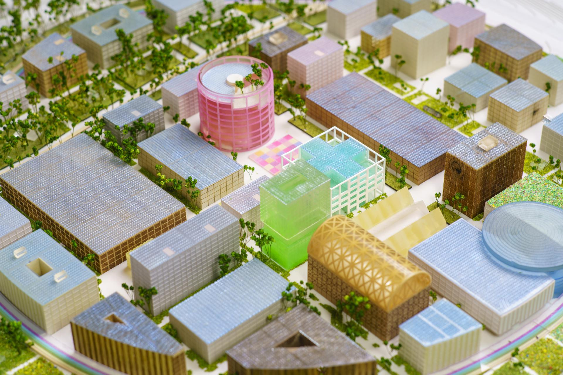 Svaka zgrada ima svoj jedinstveni karakter i prostornu logiku prilagođenu funkciji. Cilindrični komunikacijski centar s reflektirajućom fasadom bit će javno središte kampusa, s izložbama, konferencijama i seminarima. Nasuprot, restoran krem boje oblikovan je uvučenim narančastim nišama koje stvaraju terase za druženje. Mobilnosni centar pozdravlja posjetitelje svijetlim atrijem, dok living lab otvara pogled prema središnjem trgu kroz panoramske prozore, pružajući prolaznicima uvid u istraživanja u tijeku.