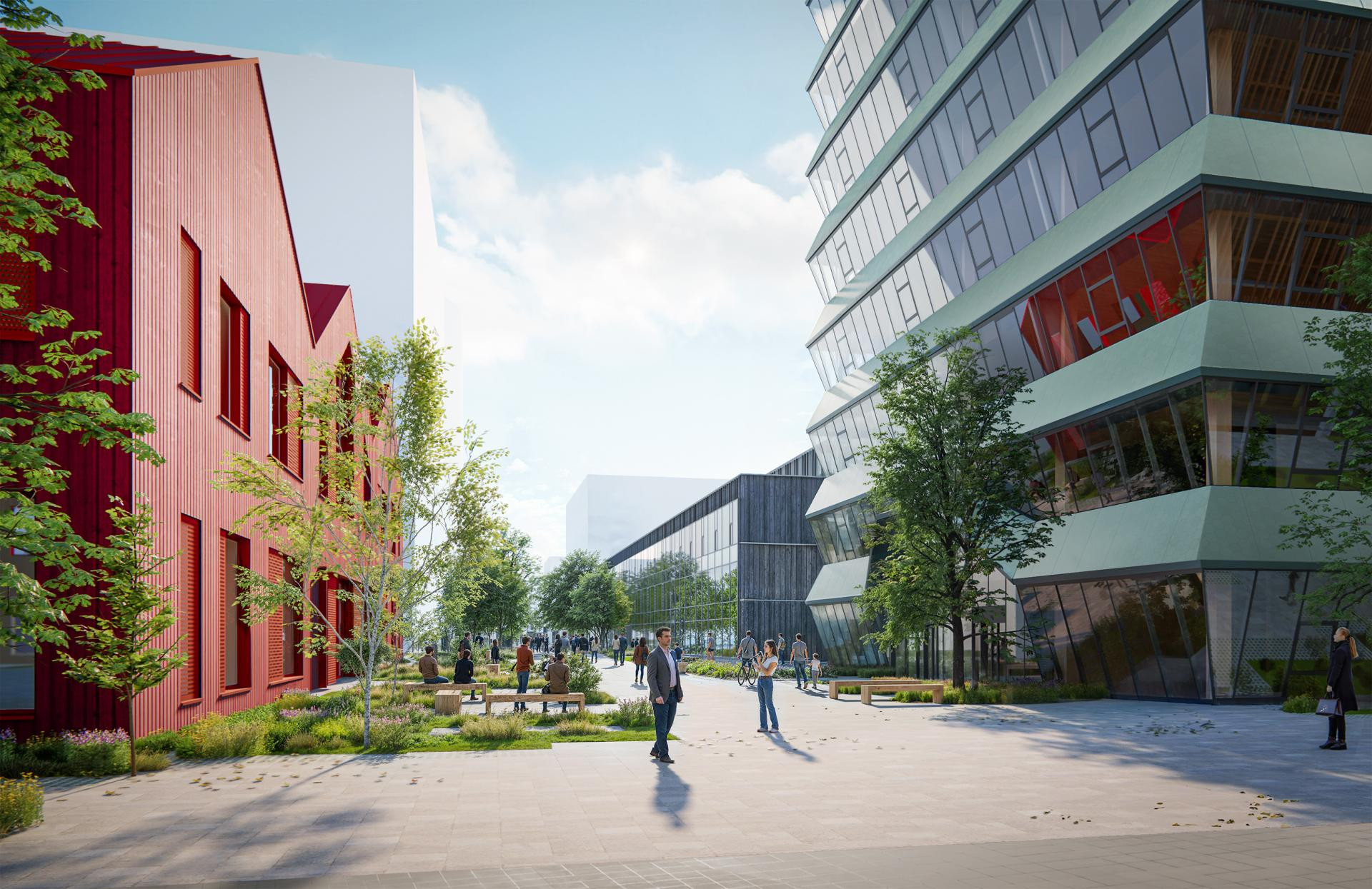 Centar za start-upove i inovacije, prepoznatljiv po jarko crvenoj boji i kosim krovovima, potiče neformalne suradnje oko zelenog središnjeg dvorišta. Desetkatna uredska zgrada s naboranom fasadom integrira fotonaponske panele, stvarajući dinamičnu igru svjetla na svojoj površini. Unutarnji prostori uključuju dvokatne zajedničke „dnevne boravke“ koji potiču odmor, interakciju i spontane susrete zaposlenika.