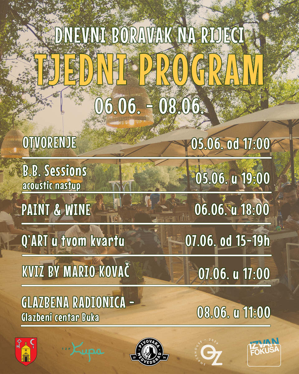 U svom petom izdanju Dnevni boravak na rijeci donosi akustične svirke uz rijeku, radionice, pričaonice i predstave za djecu, izložbe i predstavljanja knjiga, stand up nastupe, kulinarske radionice kao i kvizove by Mario Kovač, ali i organizirane sportske programe, pokazne sportske treninge, škole plivanja i izlete kajacima. Iz programa u lipnju svakako valja izdvojiti gostovanje Q‘ART u tvom kvartu u subotu 7. lipnja i OZ Craft Beer Festival koji će se održati od 13. do 15. lipnja.
