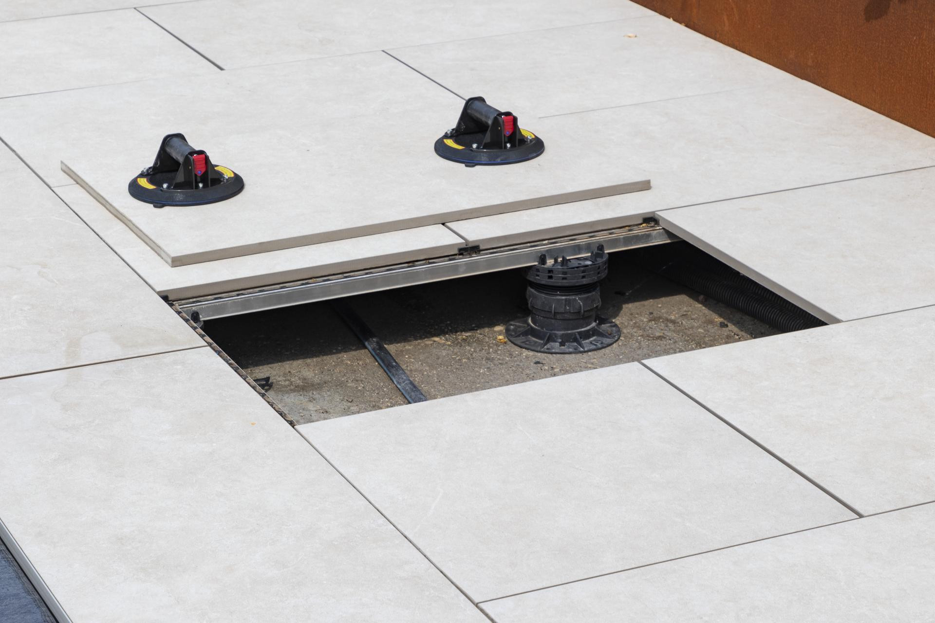 Još jedna prednost Corte Gardena je sustav podignutog popločavanja, koji omogućuje brzo postavljanje, lakši pristup instalacijama i veću fleksibilnost. Takvo rješenje posebno je korisno u projektima novogradnje, ali i kod renovacija, jer osigurava dugotrajnost, stabilnost i održavanje bez napora. Polipropilenska postolja, na kojima leže ploče, osiguravaju iznimnu mehaničku čvrstoću i nosivost, što ih čini pogodnima i za intenzivno korištene površine.