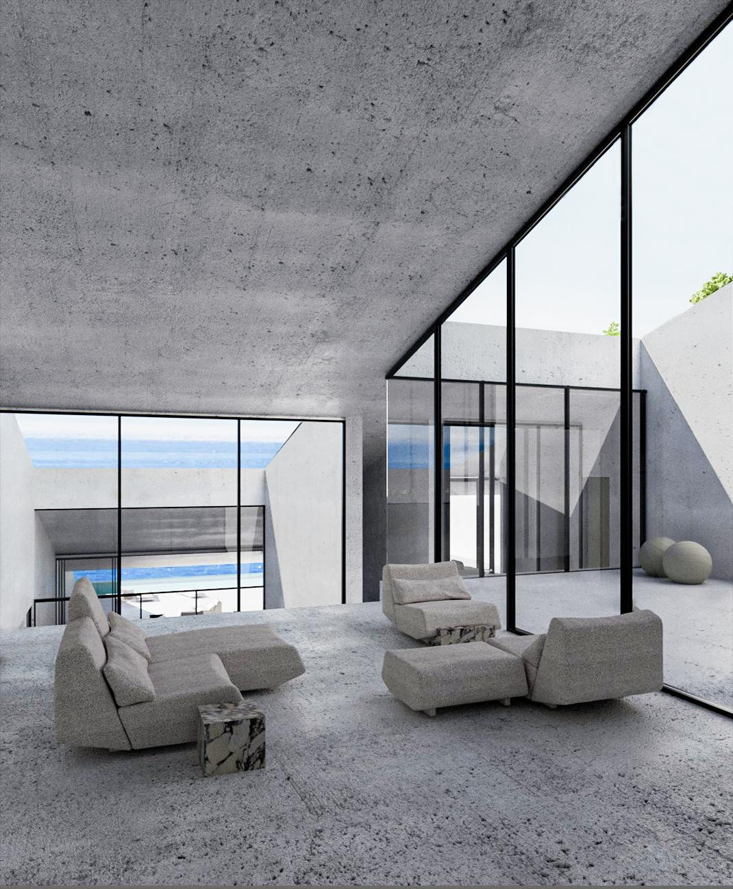 Minimalistički dizajn u interijeru dodatno podupire ovu filozofiju. Betonski materijali, koji su ostali nezaštićeni i neuredni, koriste se za podove i zidove, stvarajući sirov, industrijski ugođaj koji ne preuzima previše pažnje, ali usmjerava pozornost na sam prostor. Takav pristup omogućuje da se zadrži fokus na jednostavnosti i funkcionalnosti, a sve u skladu s okolinom.