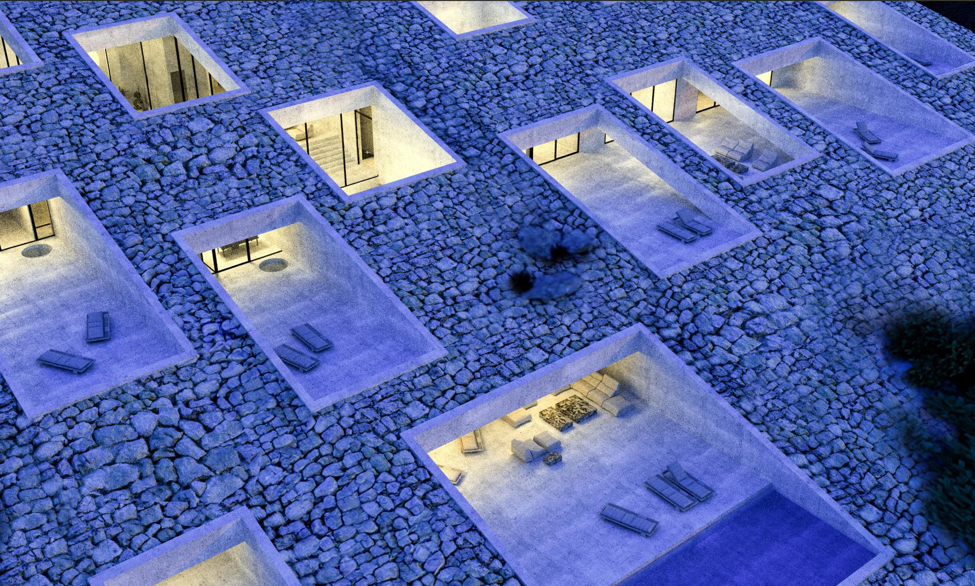 Jedna od najzanimljivijih karakteristika Vile Subterram jest njezina arhitektura koja je gotovo potpuno ukopana u padinu pa izgleda kao da je dio stjenovitog krajolika. Gruba kamena površina koristi se kao krov objekta, koji se stapa s okolnim stijenama, čuvajući prirodnu estetiku otoka. Ovakav pristup omogućava da objekt gotovo neprimjetno nestane u svom okolišu, dok istovremeno čini snažnu izjavu o harmoničnom suživotu sa Zemljom.