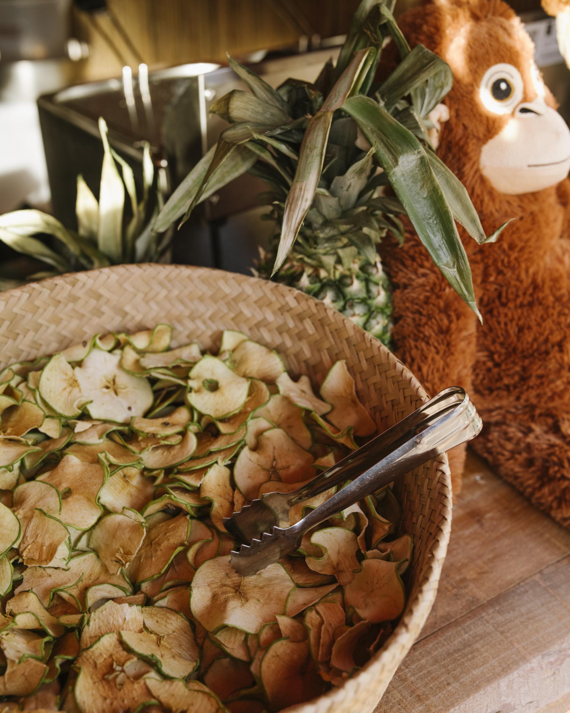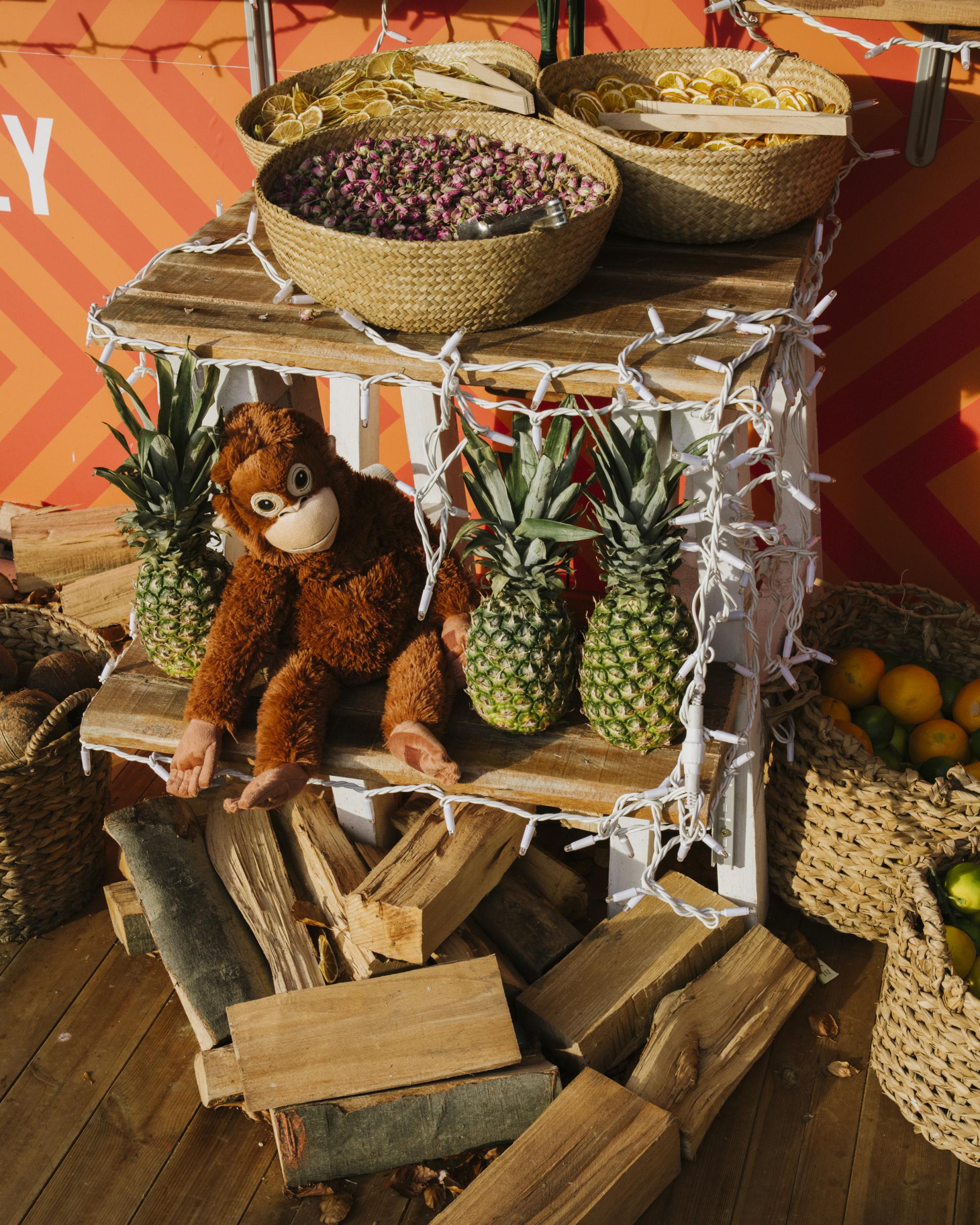 Ova zanimljiva kućica ne može proći neopaženo - jarkonarančaste je boje, s dekoracijama od svježeg i sušenog voća te agruma te plišanim majmunčićima koji se skrivaju na krovu i između voća, a ponuda koja se nalazi na njoj jednako je
