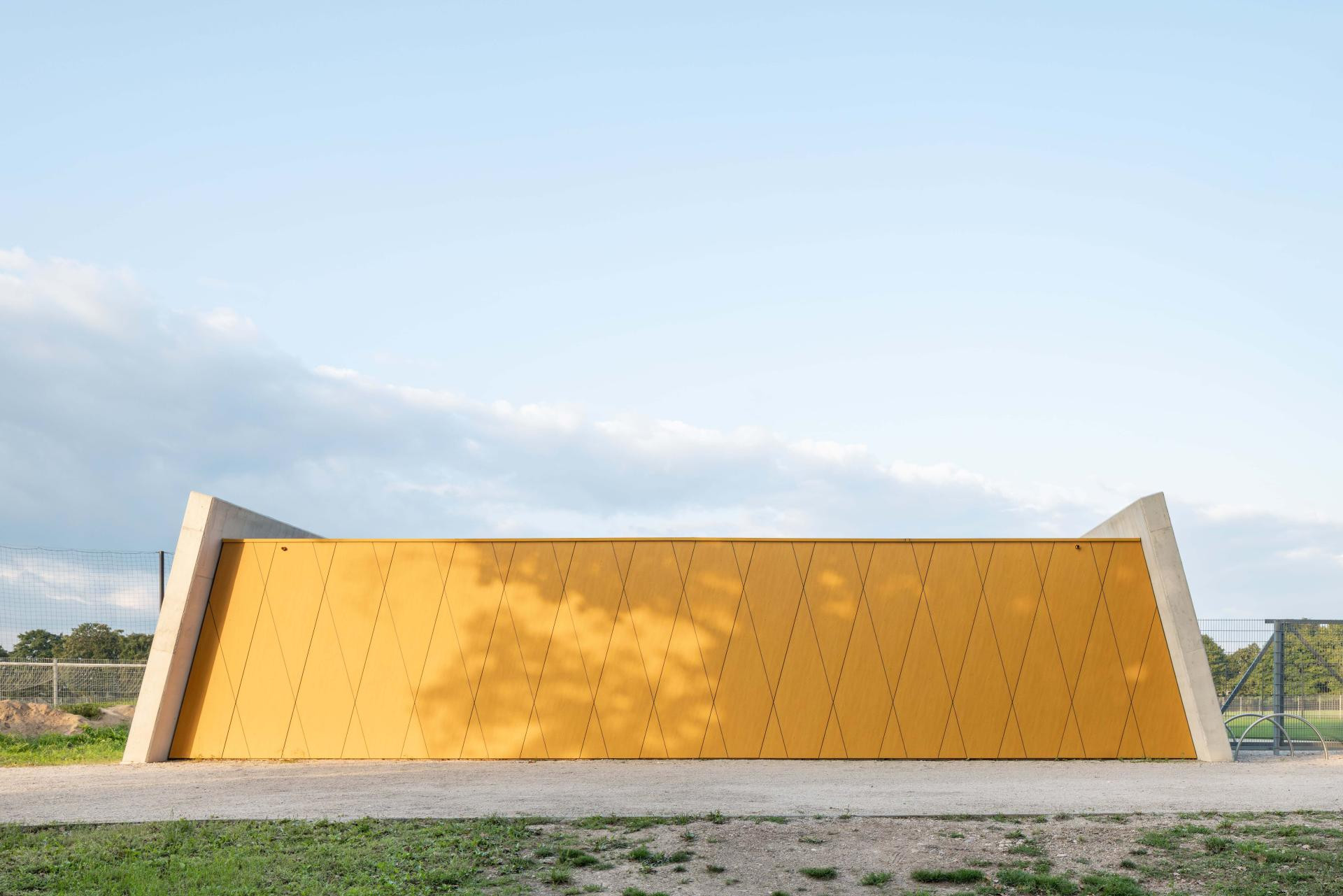 Paviljon obavija ventilirana fasada od laminiranih ploča, čiji ritmični raspored stvara razigrani vizualni dojam. Kad se promatrač kreće, linije se lome, usklađuju ili preklapaju, pa se dojam neprestano mijenja. Ta igra daje paviljonu osjećaj stabilnosti koja nikada nije potpuno statična, već odražava pokret i energiju sporta u njegovu okruženju.
