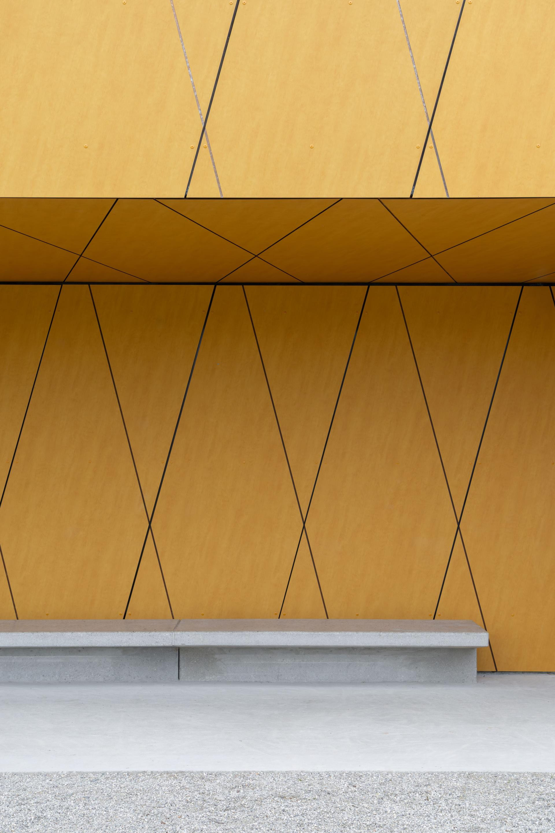 Središnja ideja oblikovanja priziva sliku pomicanja Zemljinih ploča - dva betonska bloka razmaknuta su kao da ih je podzemna sila razdvojila, a između njih uokviren je drveni volumen, poput dragocjenog otkrića razotkrivenog na samom prijelomu. Ta pukotina, istodobno snažna i precizna, daje paviljonu jednostavan, ali dojmljiv karakter.