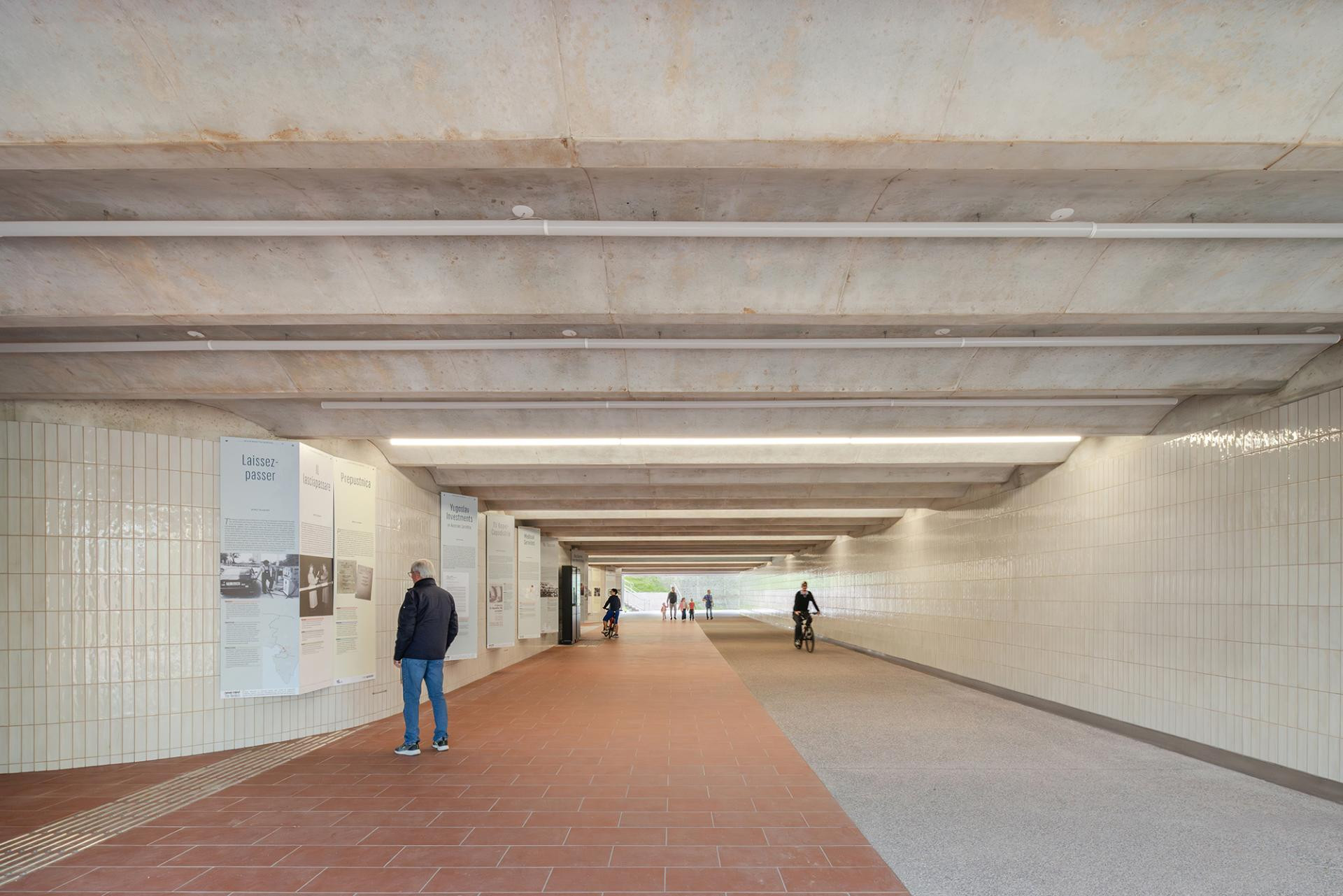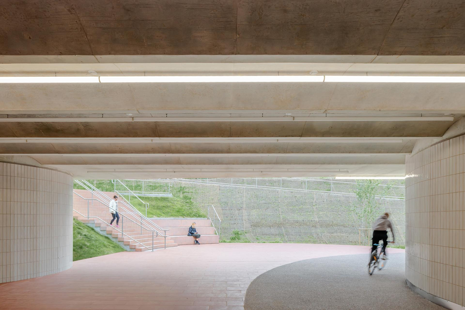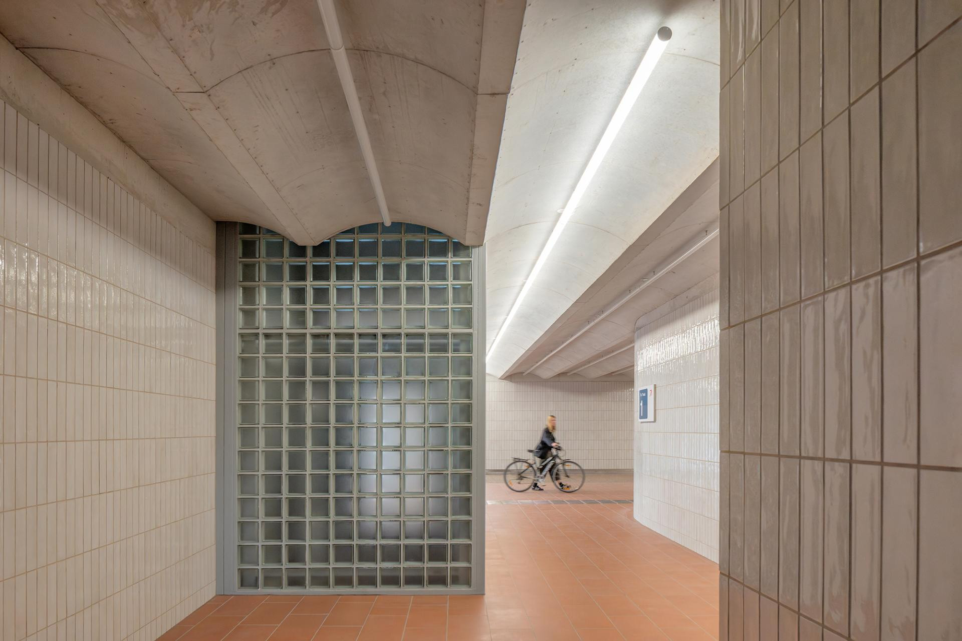 Posebna je pažnja posvećena i materijalima. Cilj je bio stvoriti svijetao, ugodan i pristupačan prostor. Prirodna svjetlost, reflektirajuće bijele pločice i živopisno popločavanje jasno odvajaju pješačku i biciklističku zonu. Opekom u boji popločene površine nastavljaju se iz prolaza prema vanjskim vrtačama, gdje jarke boje rampi i stubišta stvaraju kontrast naspram zelenim površinama. Tako se stvara dojam bliskosti s prirodom, unatoč građevinskom zahvatu.