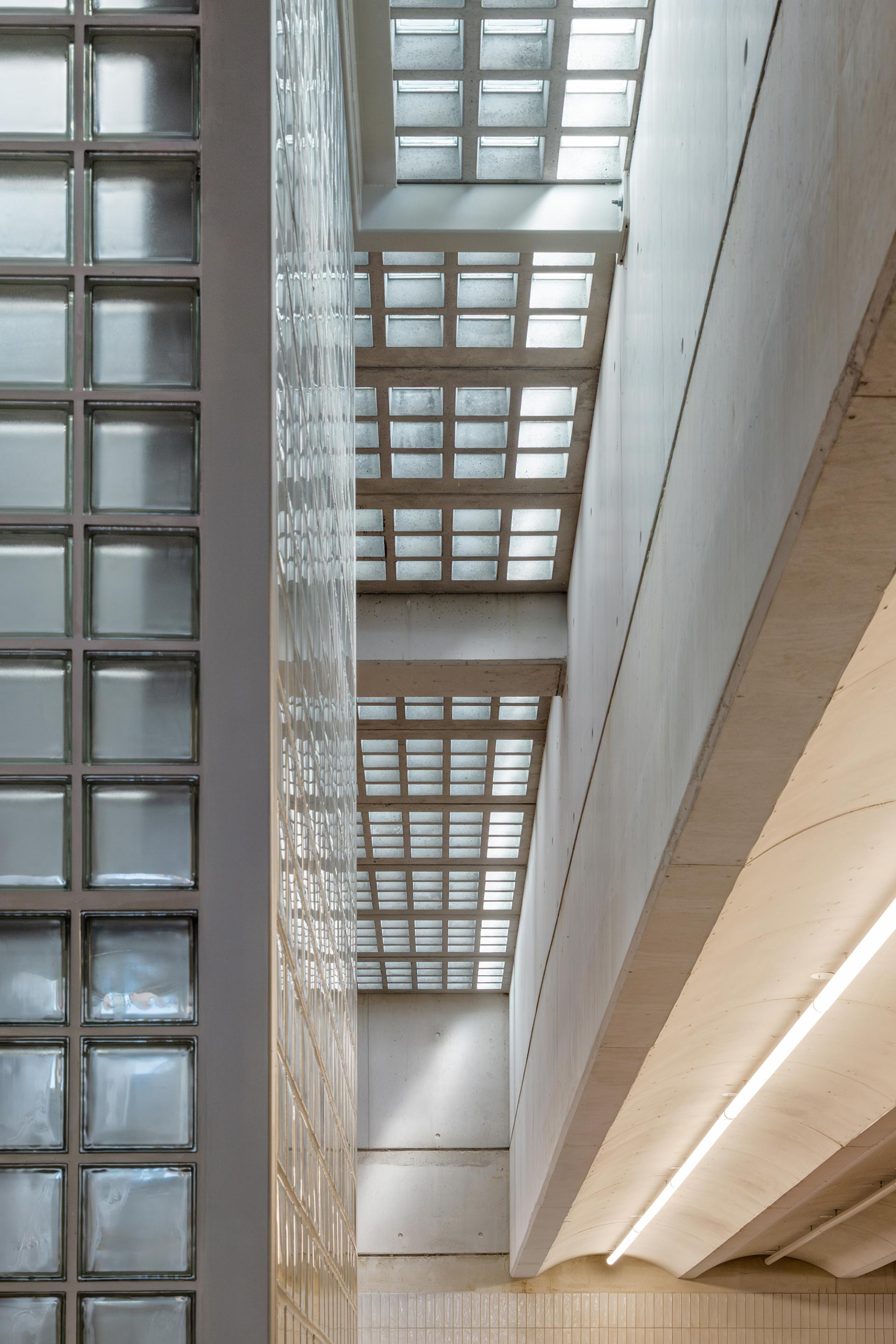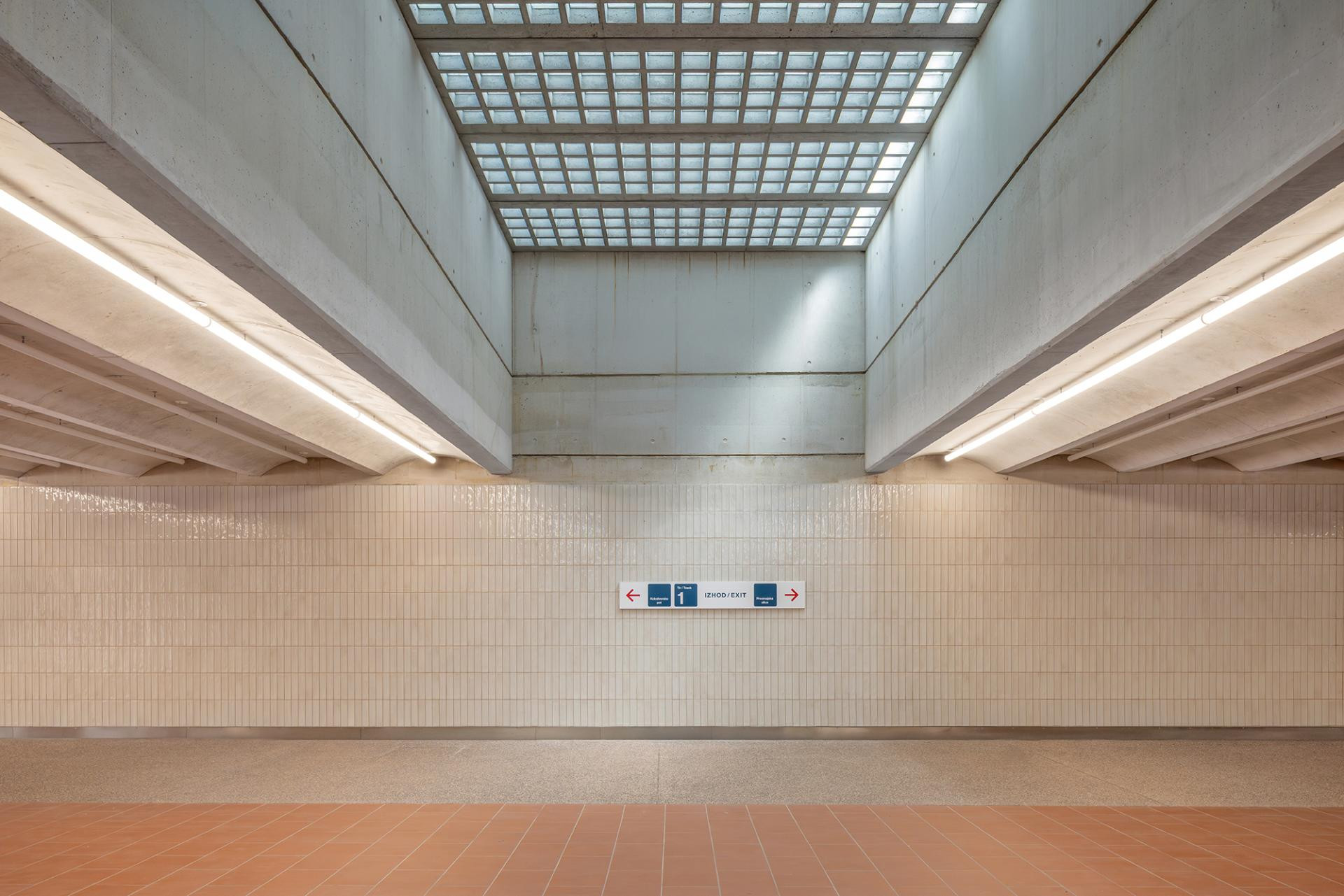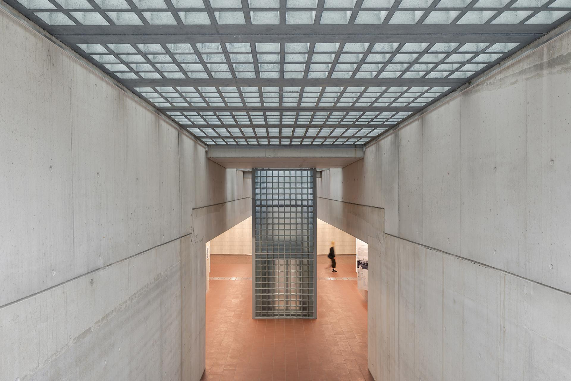 Posebna je pažnja posvećena i materijalima. Cilj je bio stvoriti svijetao, ugodan i pristupačan prostor. Prirodna svjetlost, reflektirajuće bijele pločice i živopisno popločavanje jasno odvajaju pješačku i biciklističku zonu. Opekom u boji popločene površine nastavljaju se iz prolaza prema vanjskim vrtačama, gdje jarke boje rampi i stubišta stvaraju kontrast naspram zelenim površinama. Tako se stvara dojam bliskosti s prirodom, unatoč građevinskom zahvatu.