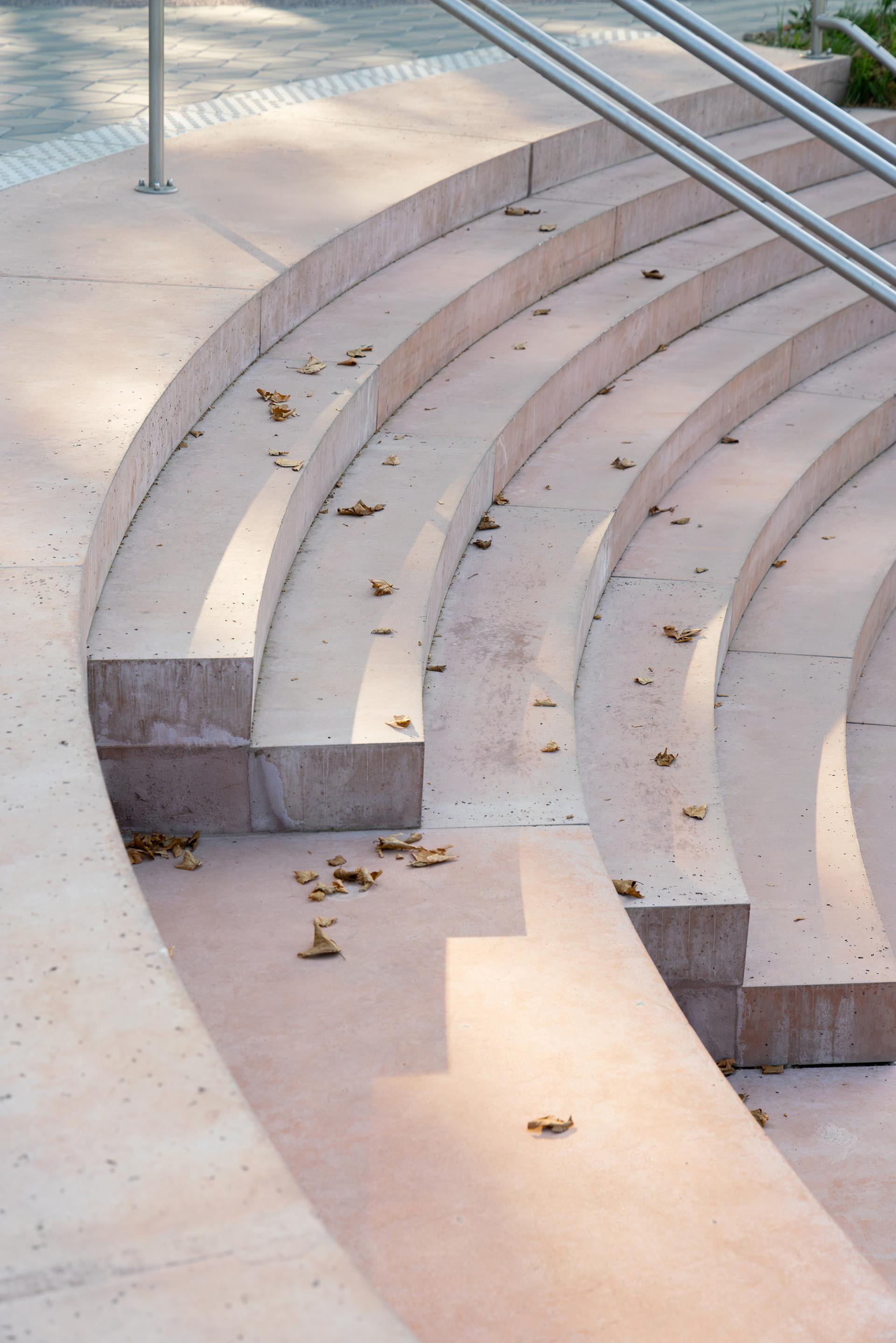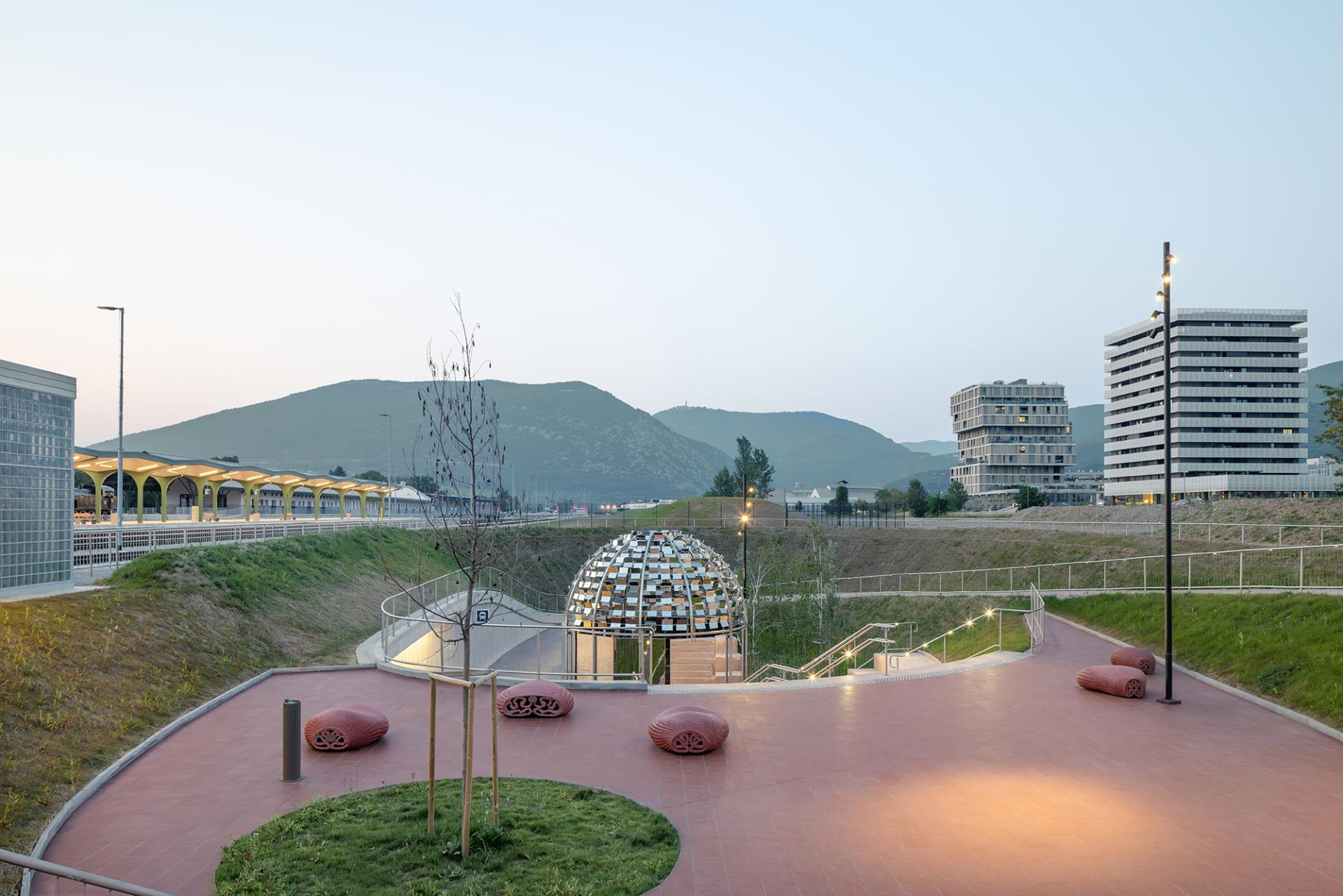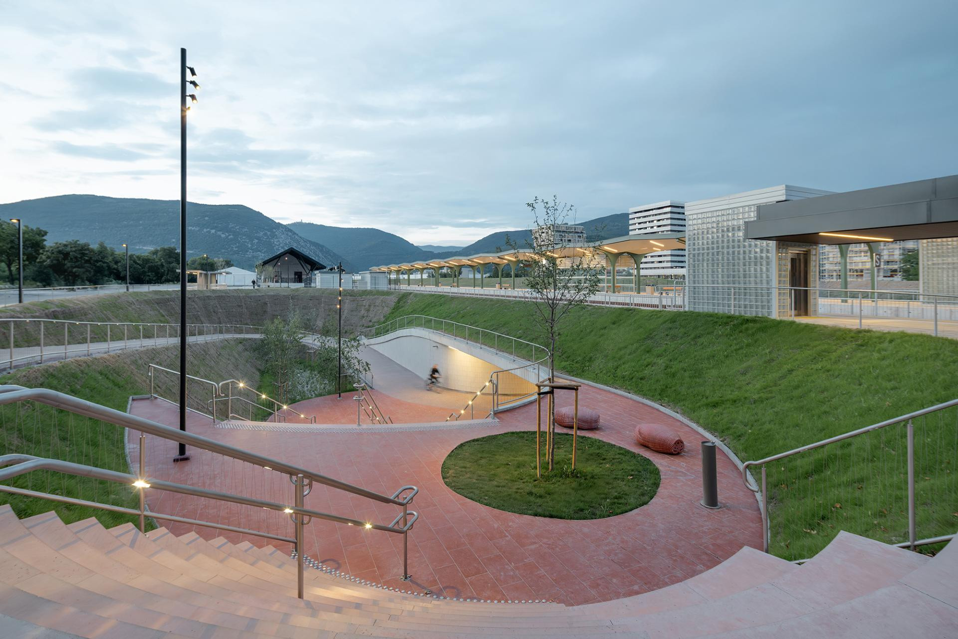 Poseban arhitektonski pečat daju dva udubljena eliptična kvadrata, tzv. vrtače, koji definiraju prostorni identitet cijelog projekta. Pristup s prolaza prema površini omogućen je širokim stubištima i spiralnim rampama uz obod vrtača, prilagođenim i biciklistima.