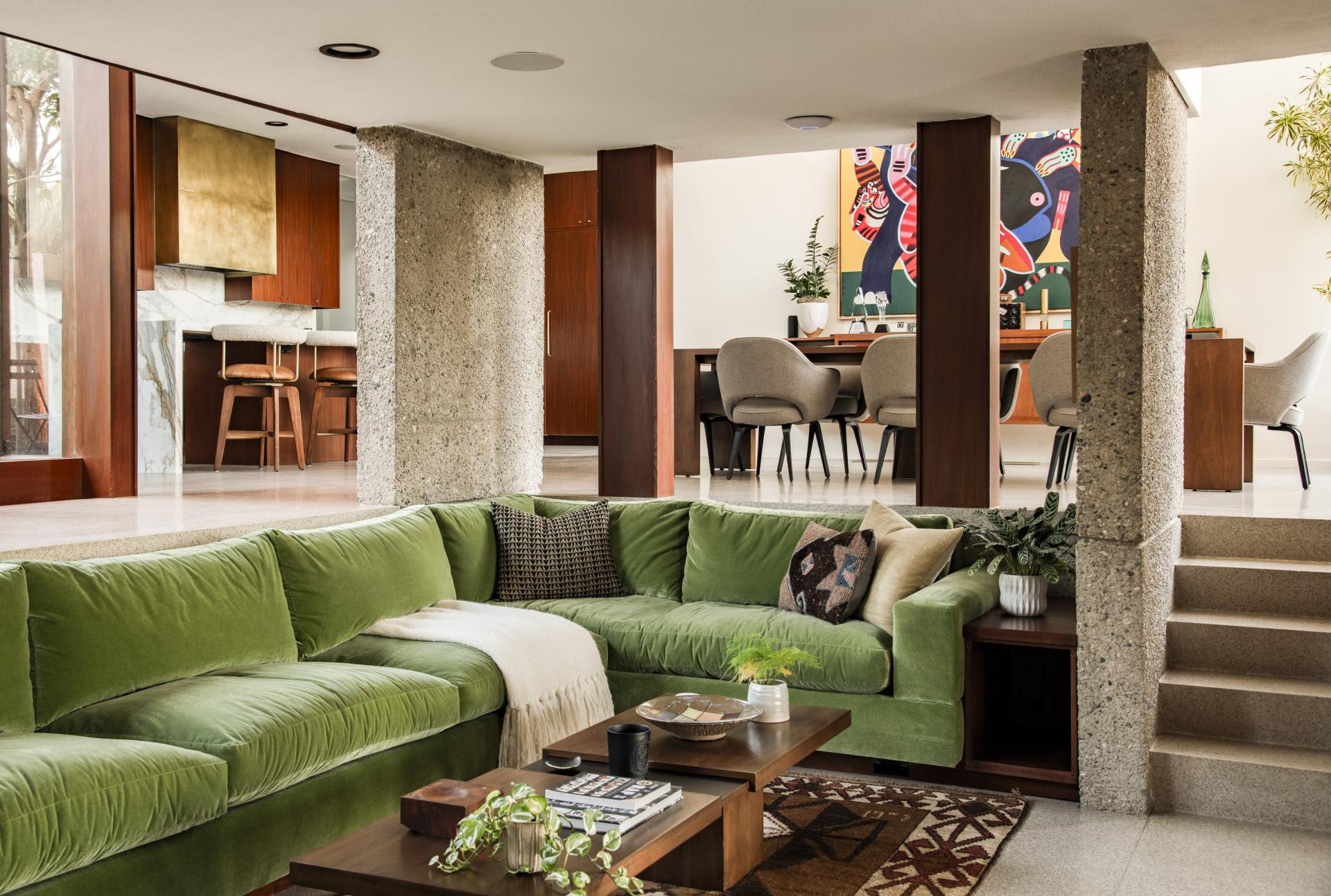Za one koji bi željeli doživjeti čar jame za razgovor, ali bez skupih građevinskih zahvata, postoji niz kreativnih rješenja. Kelly predlaže korištenje modularnih sofa i kutnih garnitura koje stvaraju osjećaj zatvorenog kruga, a dodavanje mekog tepiha i po podu razbacanih jastuka dodatno pojačava dojam ležernog druženja. Uključivanjem vintage elemenata - poput baršuna, čupavih tepiha i geometrijskih uzoraka - možete unijeti dašak 70-ih bez renovacije. A ako vam se ne razgovara u svojoj jami, slobodno ponovno pogledajte zgode i nezgode Austina Powersa...
