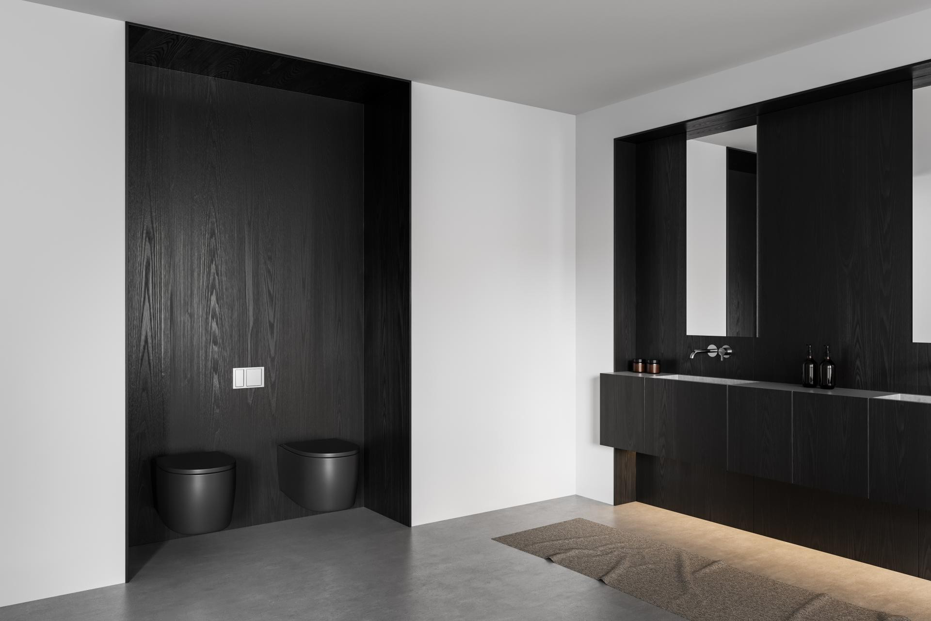 Crna je boja snažnog karaktera i zahtijeva promišljeno korištenje. Da prostor ne bi djelovao pretamno ili depresivno, najbolje ju je uklopiti u monokromatsku paletu. To znači da se uz crnu biraju tonovi sive i bijele, koji joj pružaju kontrast i vizualnu ravnotežu. Ako želite unijeti i toplinu, tamno drvo ili drvene teksture na frontama kupaonskog namještaja odličan su izbor; ublažavaju ozbiljnost crne i prostoru daju profinjen, ugodan dojam.