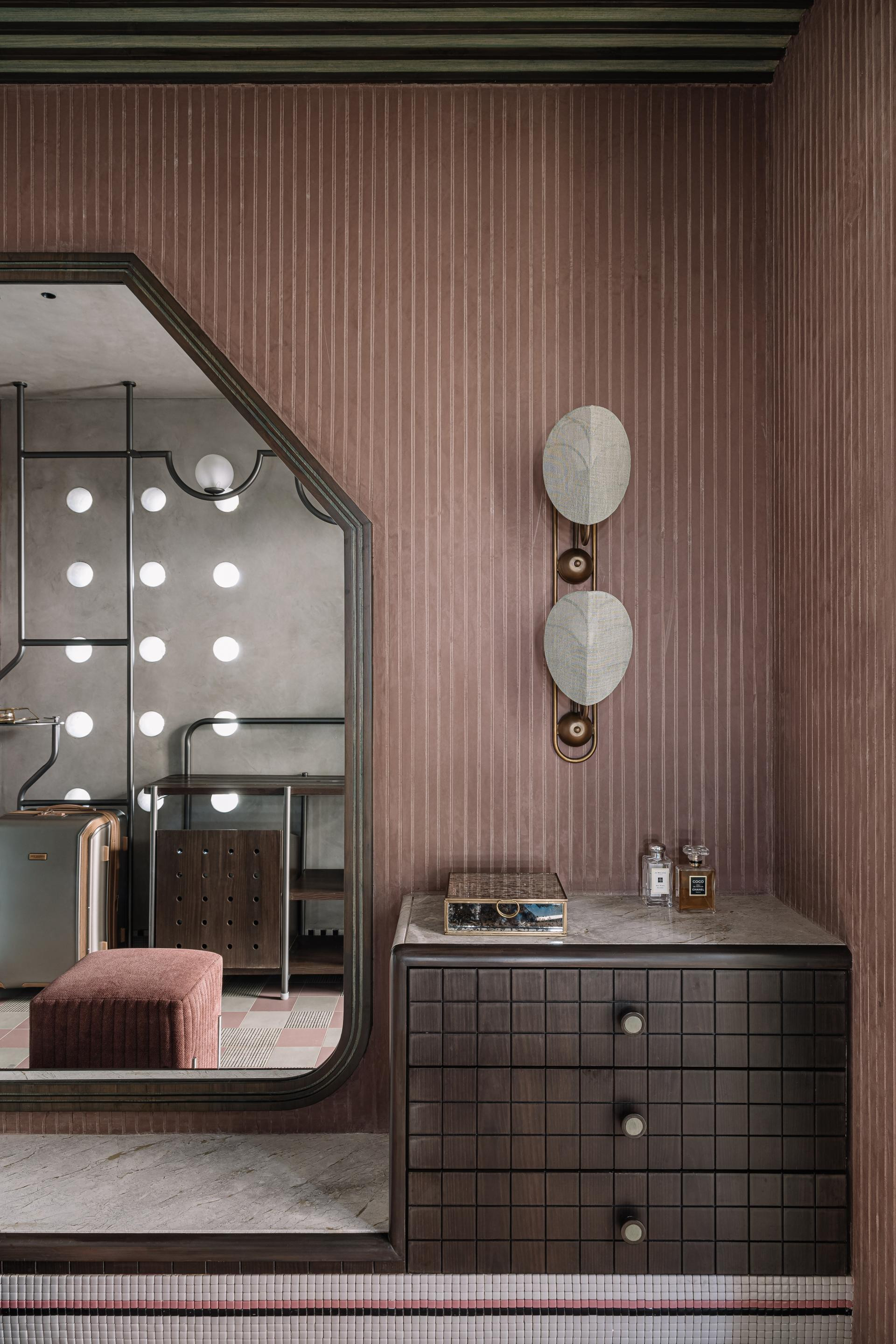 Foaje je prostran i svijetao, a njegov vizualni fokus je veliki mural u nijansama lila i mauve, koji unatoč tome što je digitalno tiskan, daje iluziju nježnih tkanina koje lebde. Perforirani ormarić u pješčano-bež tonovima, dizajniran da čuva preko 100 pari cipela, ukrašen je kožnim trakama koje na originalan način oponašaju vezice.