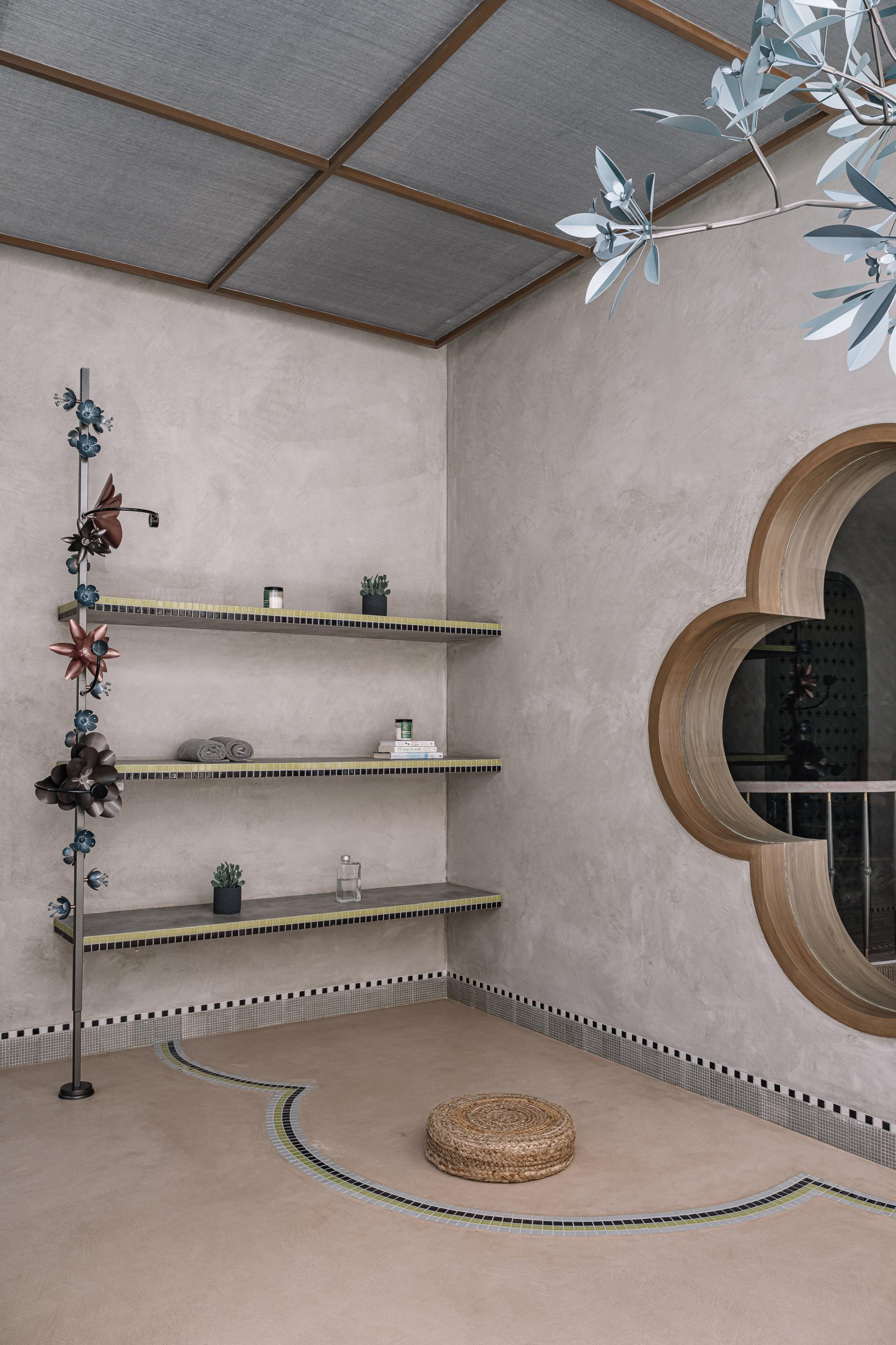Izrađeni luster od drvenih perli težak čak 400 kilograma osvjetljava prostor, a njegov dizajn nadahnut je detaljima ručno rađenih nakita. Ovaj je luster jedan od brojnih prilagođenih rasvjetnih tijela izrađenih od obrtnika iz Kerala, Rajasthana i Maharashte.