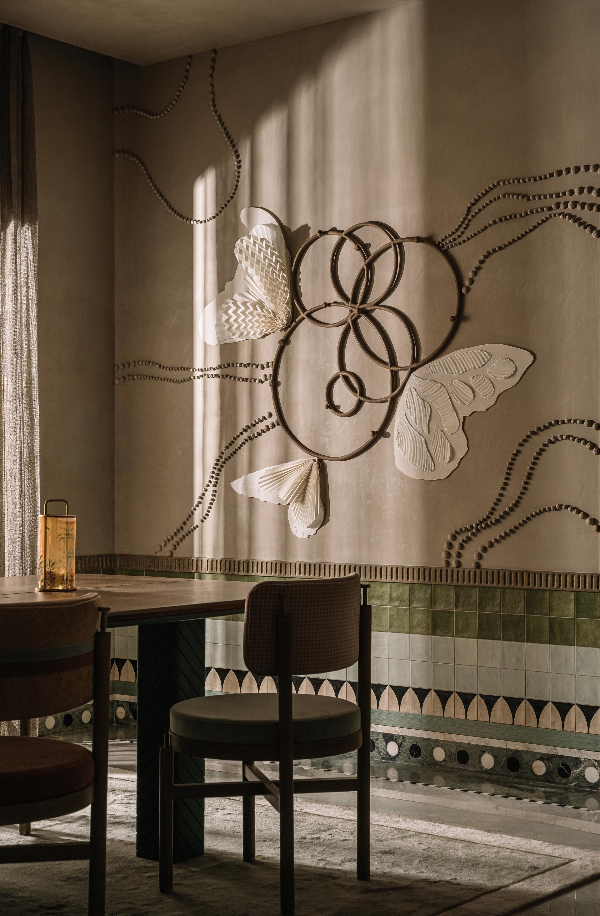 Kuhinja, prekrivena keramičkim pločicama, odiše mekim linijama i funkcionalnošću: ormari s rebrastim staklenim vratima i zakrivljenim rubovima predstavljaju spoj tradicije i modernog dizajna. Na zidovima blagovaonice nježno lebde tkanine u obliku leptira, dok je stol napravljen od dvobojnog drveta, okružen kožnim stolicama u nijansama kadulje i hrđe. Spavaće sobe pažljivo su opremljene da spoje ekskluzivne prilagođene komade s materijalima dostupnijim na tržištu.