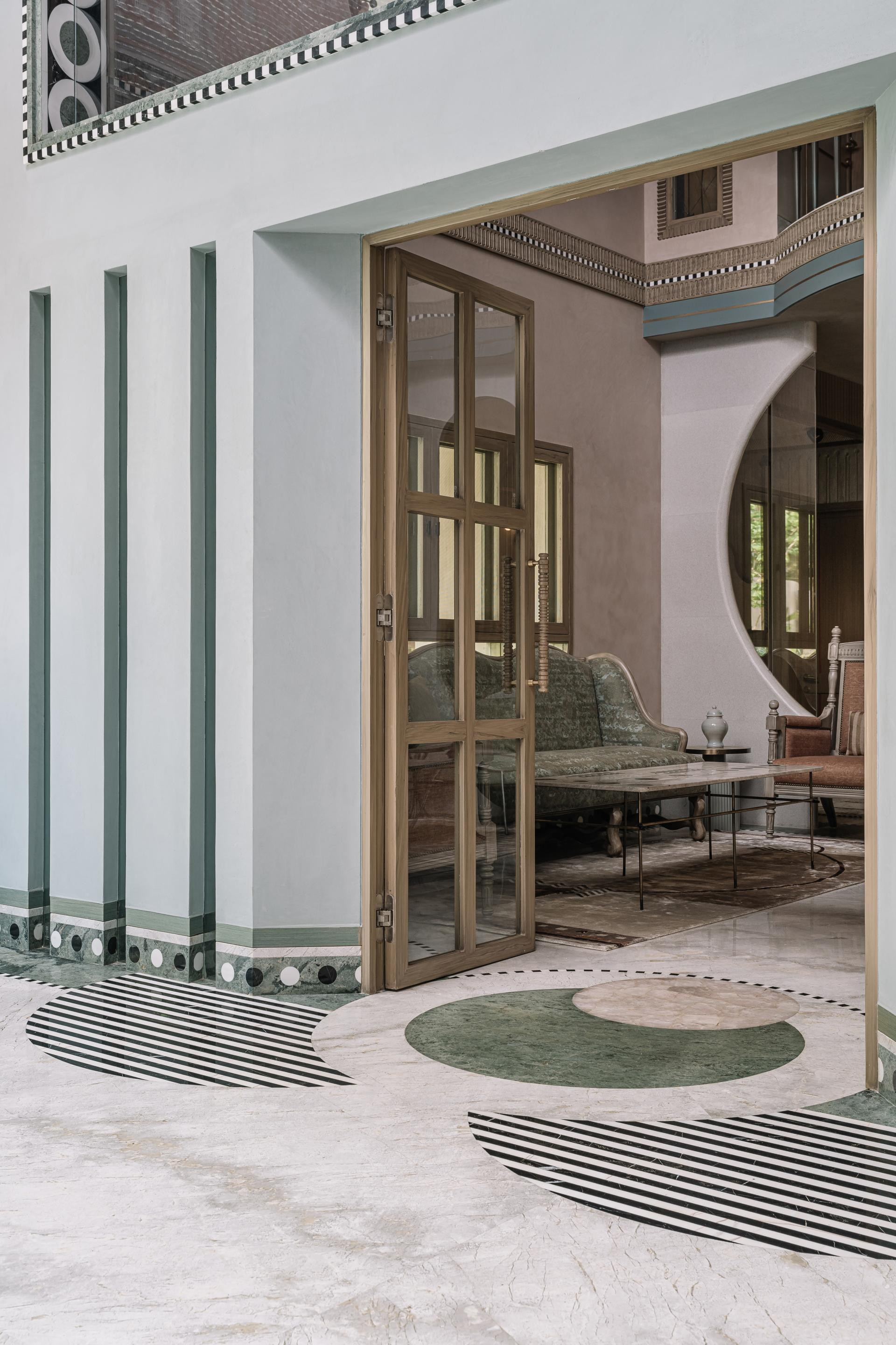 "Rezultat je dom koji ne samo da naglašava bogatstvo indijskog zanatstva, već i priču kroz vještine i pozadine uključenih obrtnika. Odlučili smo se za put koji slavi jedinstvene sposobnosti lokalnih umjetnika, umjesto masovno proizvedenih proizvoda" istaknula je u razgovoru za portal Dezeen osnivačica studija Smita Thomas. Ulaz u kuću krase impozantna drvena vrata ukrašena cvjetnim rezbarijama izrađenim od strane majstora iz Uttar Pradesha i Karantake. Ti detalji pozivaju na intimnost i toplinu, dok ih okružuje monumentalni luk u obliku božurastog portala.