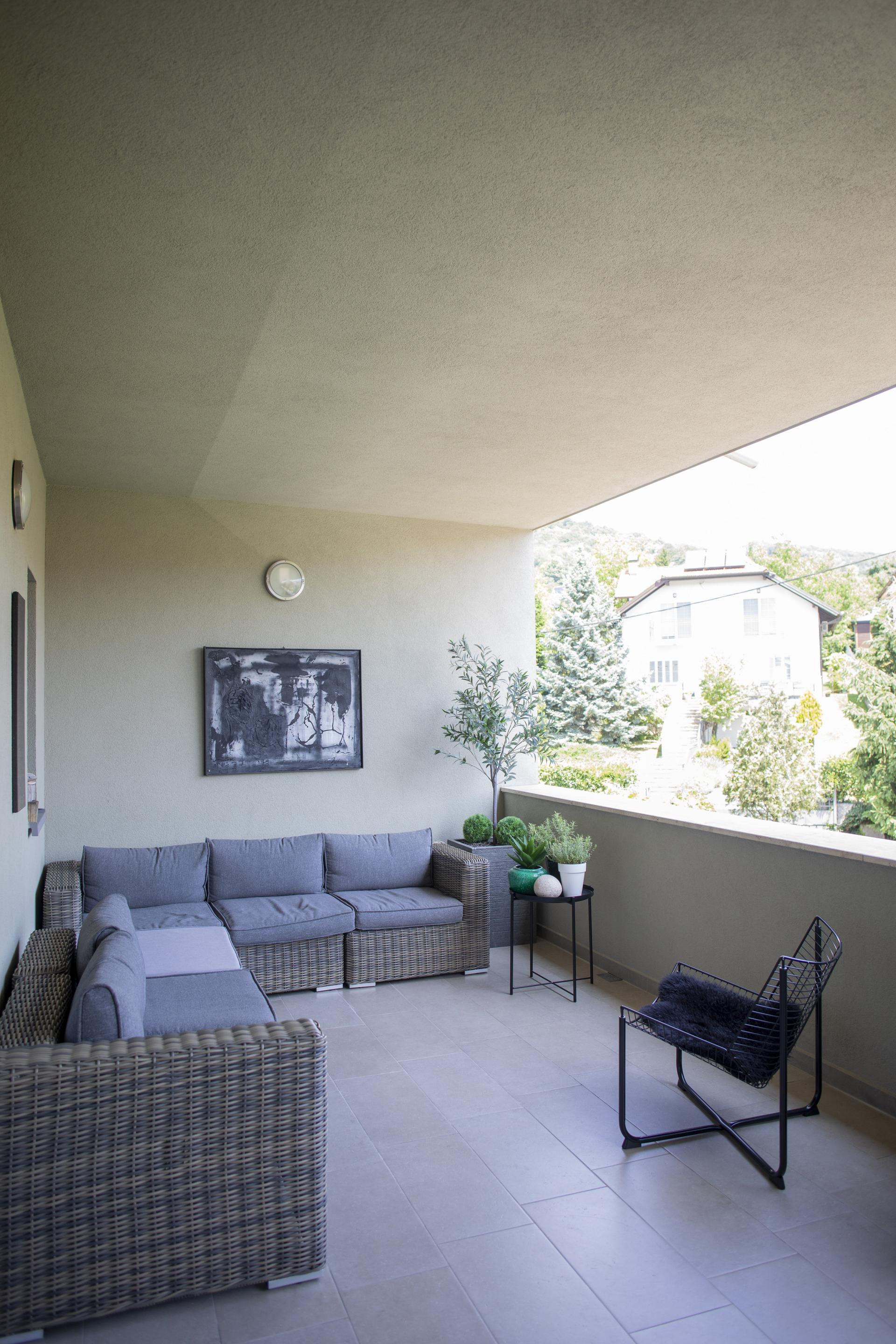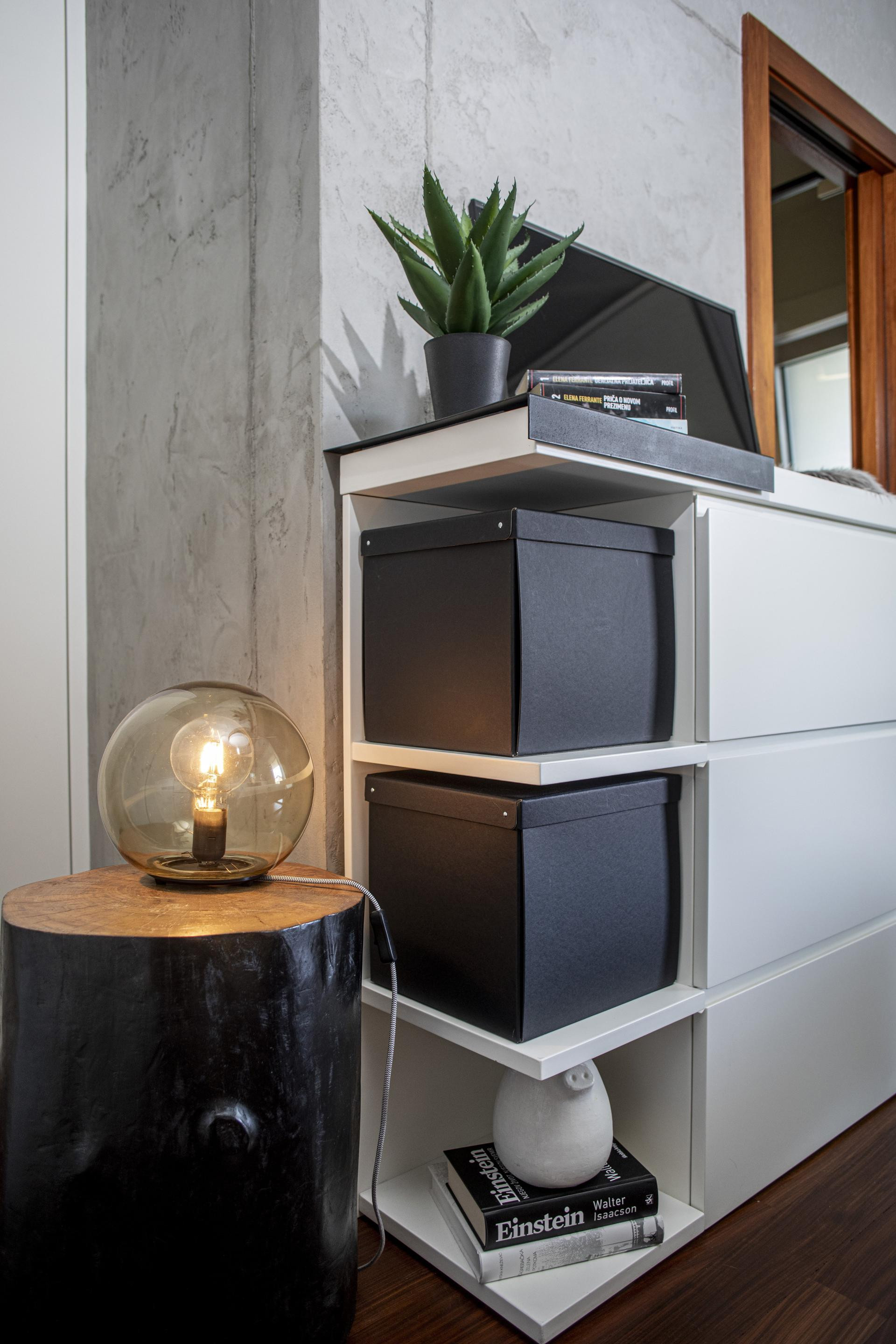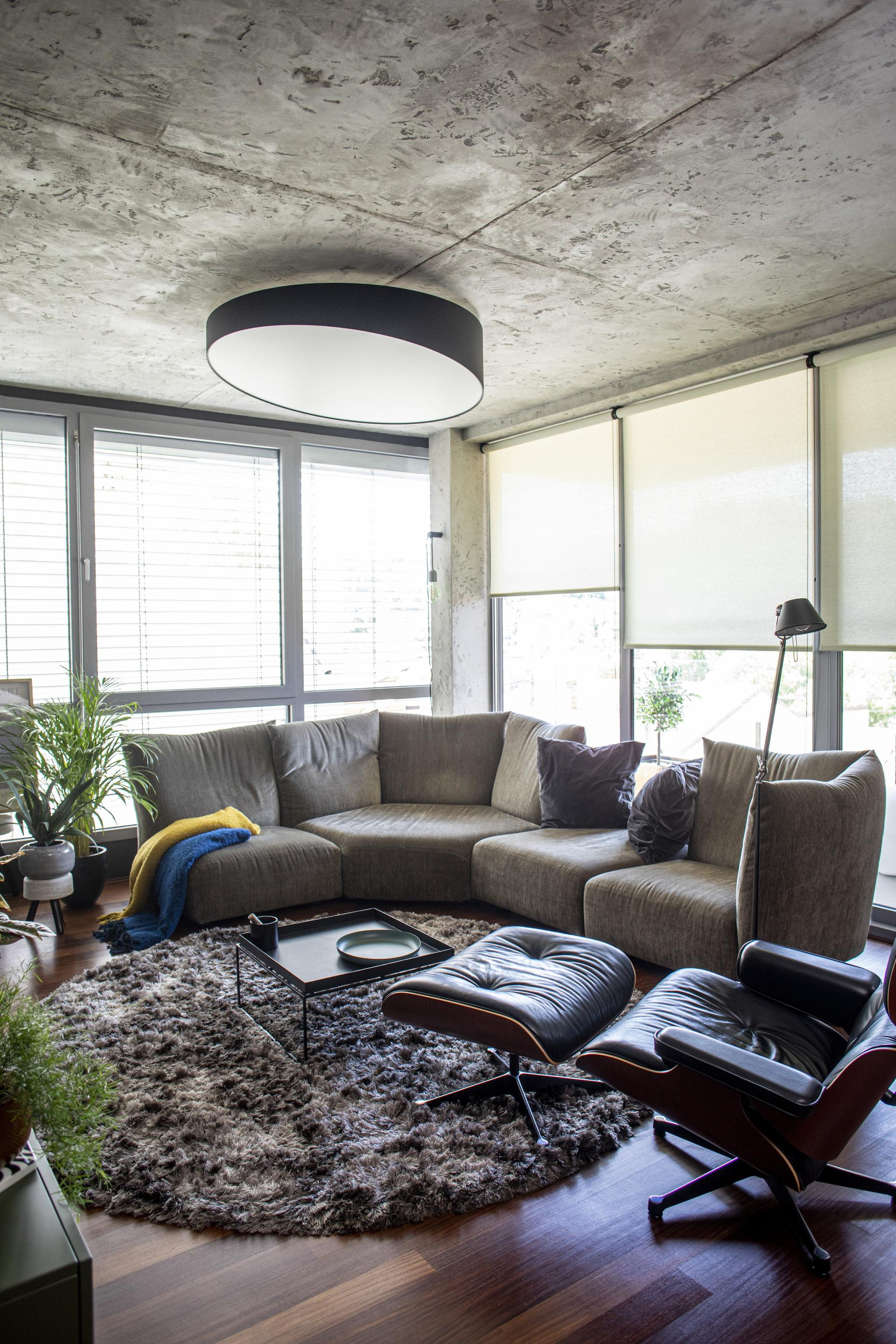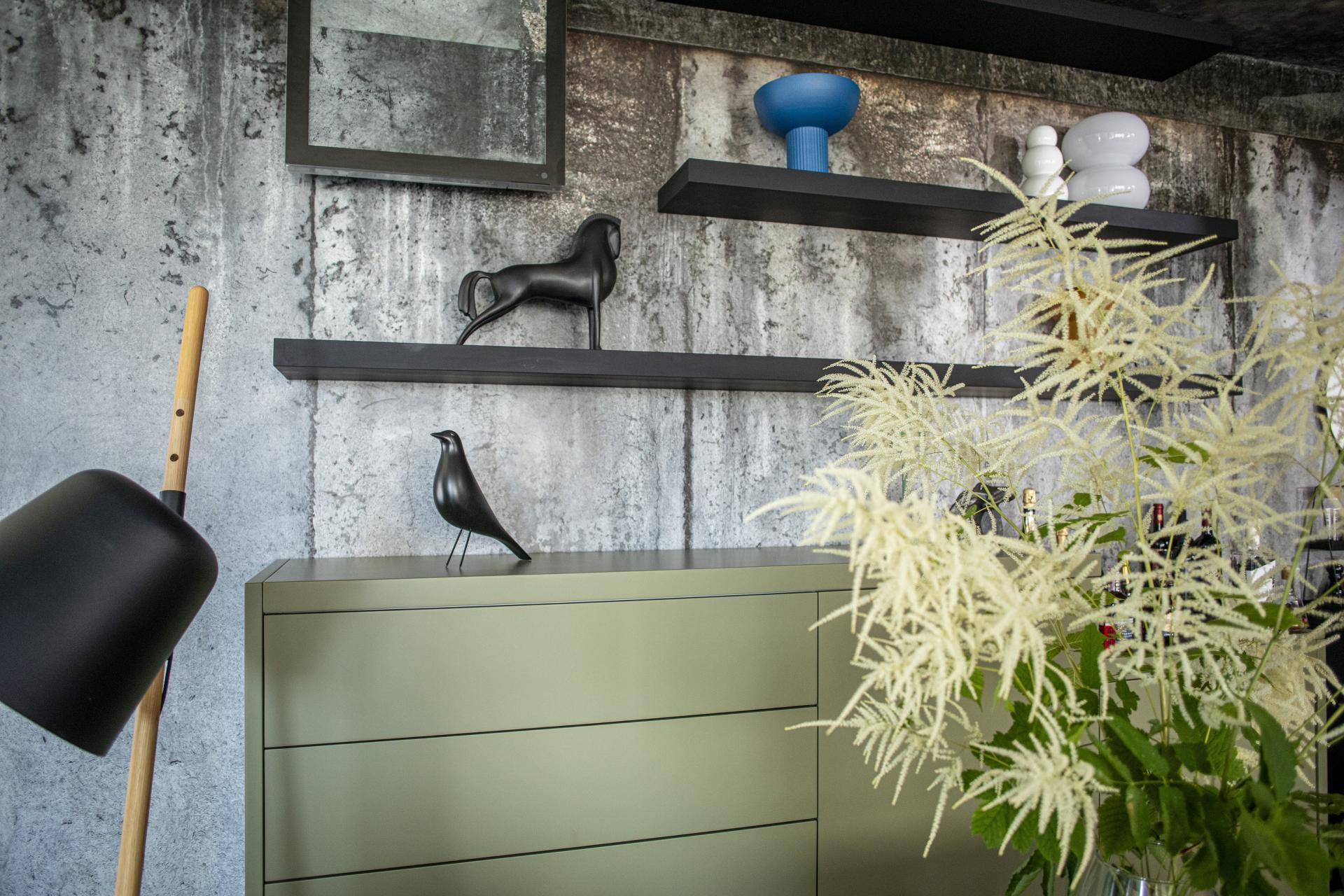 Uočavaju se i dizajnerski komadi, poput barskih stolaca Hay uz kuhinjski poluotok i sjedeće garniture Divano Standard Edra u boravku koja je, smatra Marijana, jedan od boljih komada produkt-dizajna. Tu je i poveći broj Eamesovih detalja: Lounge Chair and Ottoman, Eames House Bird, Plastic White Armchair te razne vaze i pladnjevi istog dizajnerskog dua. Rasvjeta je, pak, iz Morosinijeve PANK kolekcije, koja odlično komplementira surovom i sirovom cementu.
