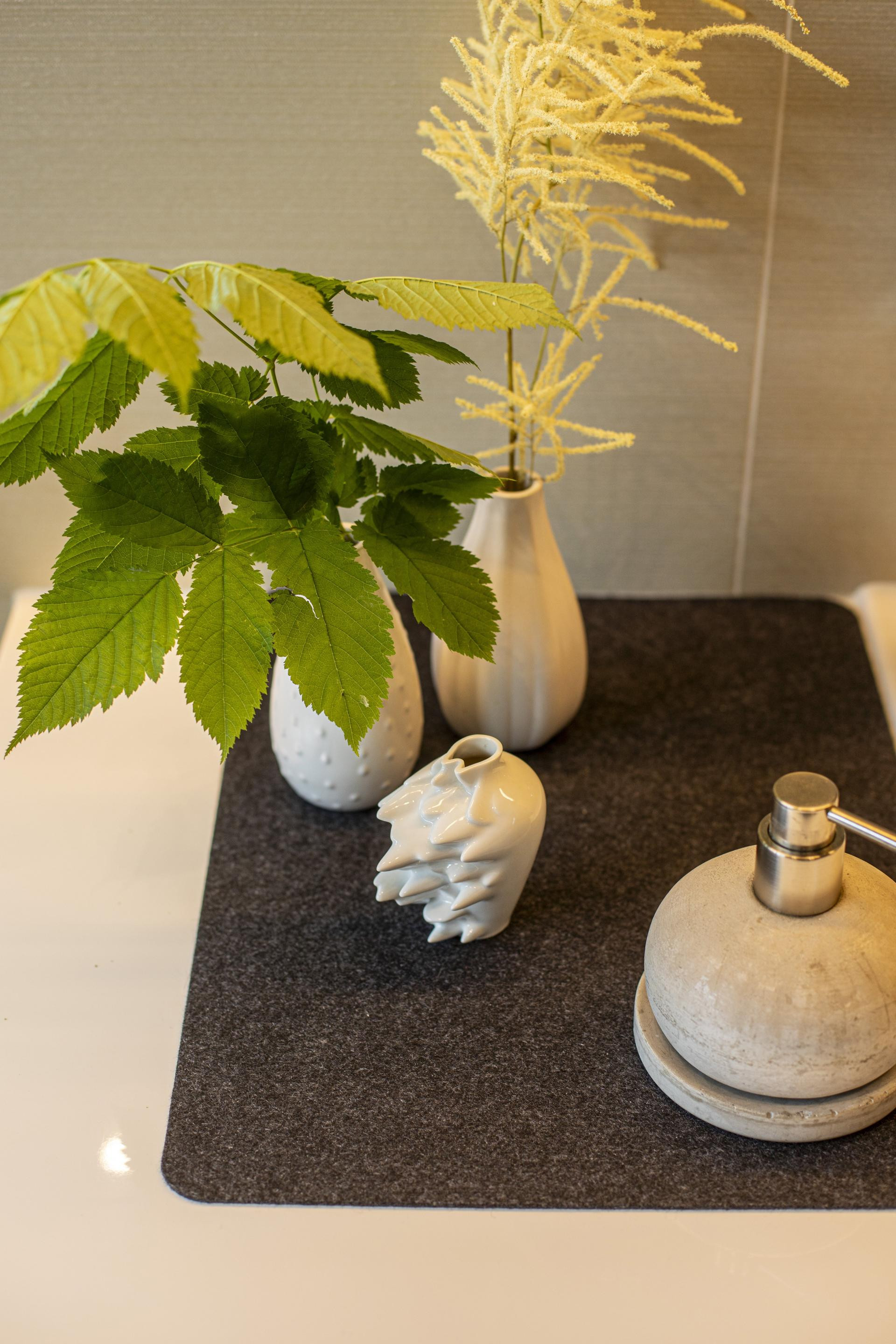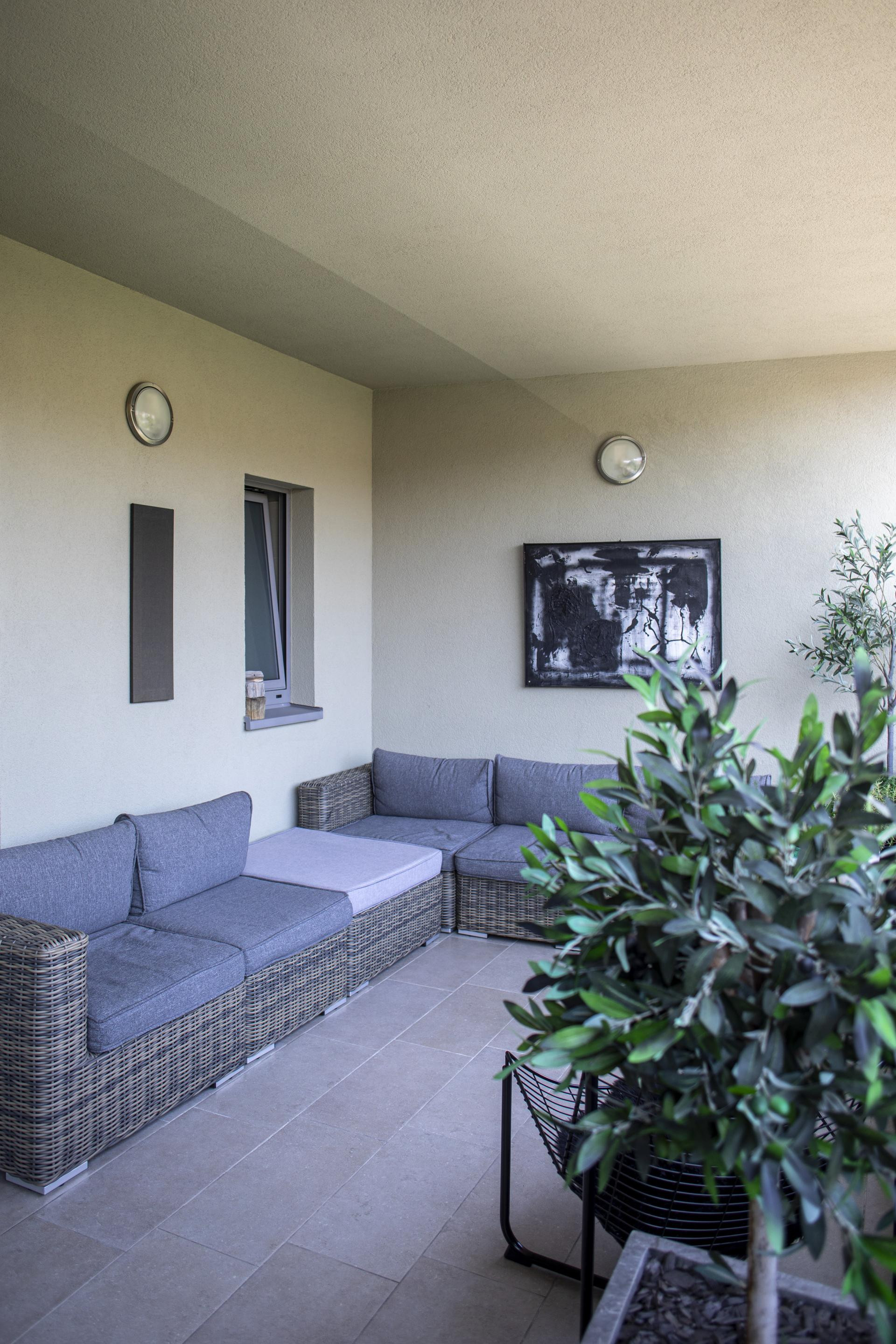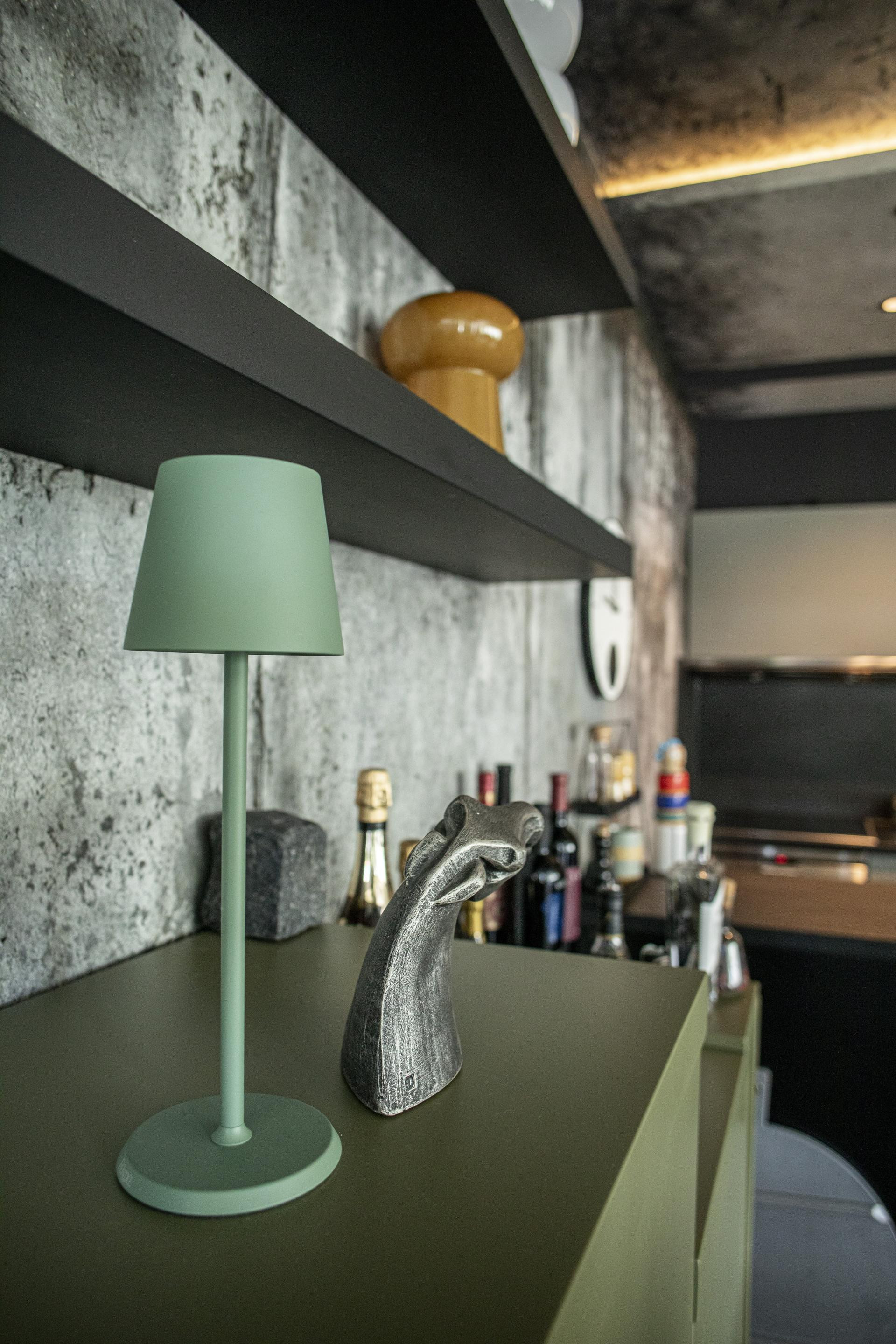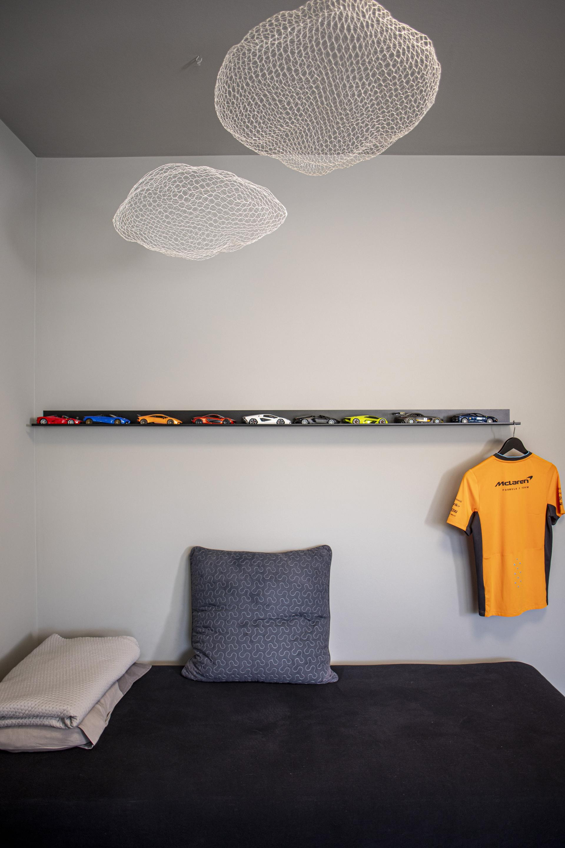 Uočavaju se i dizajnerski komadi, poput barskih stolaca Hay uz kuhinjski poluotok i sjedeće garniture Divano Standard Edra u boravku koja je, smatra Marijana, jedan od boljih komada produkt-dizajna. Tu je i poveći broj Eamesovih detalja: Lounge Chair and Ottoman, Eames House Bird, Plastic White Armchair te razne vaze i pladnjevi istog dizajnerskog dua. Rasvjeta je, pak, iz Morosinijeve PANK kolekcije, koja odlično komplementira surovom i sirovom cementu.