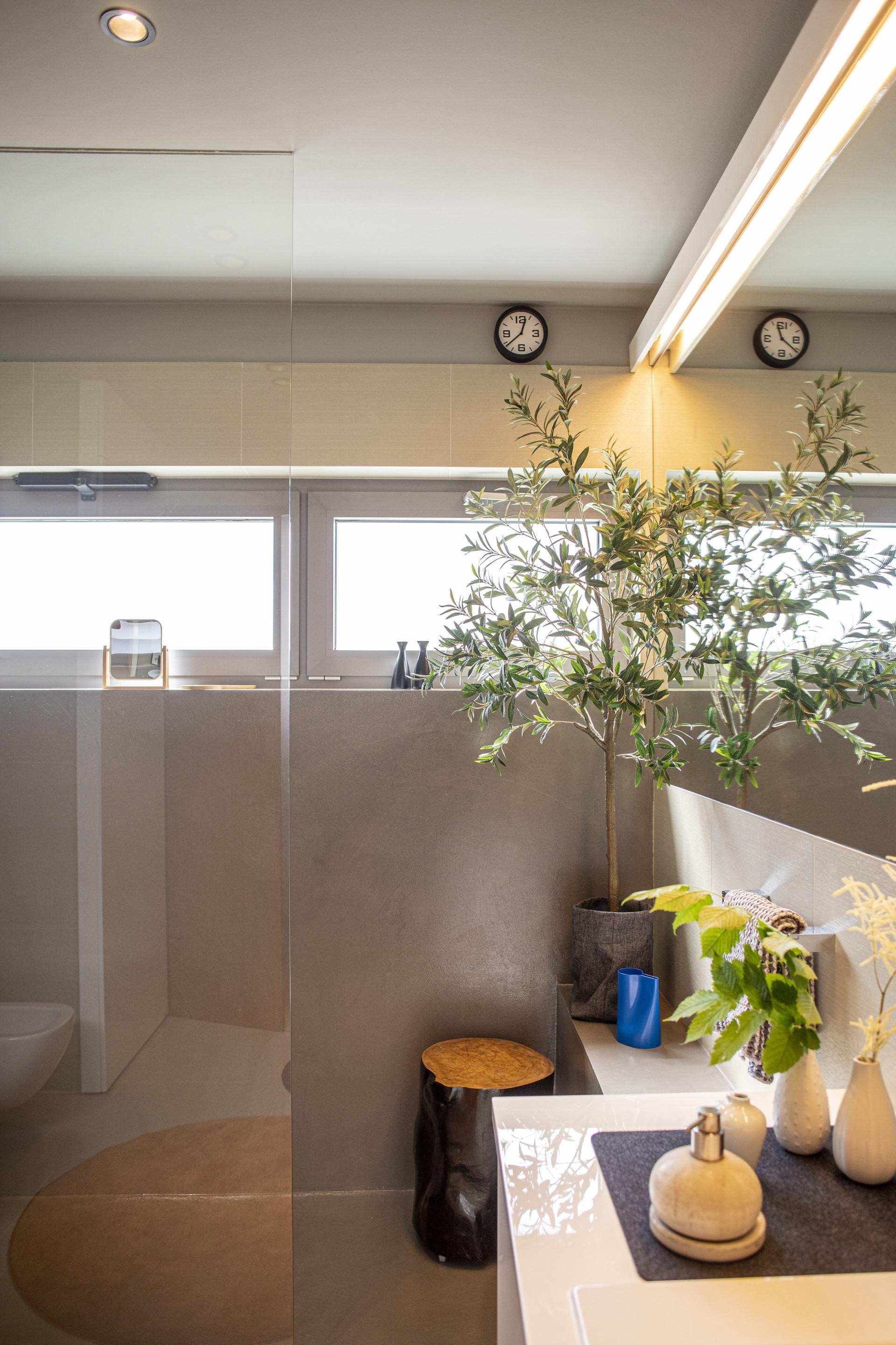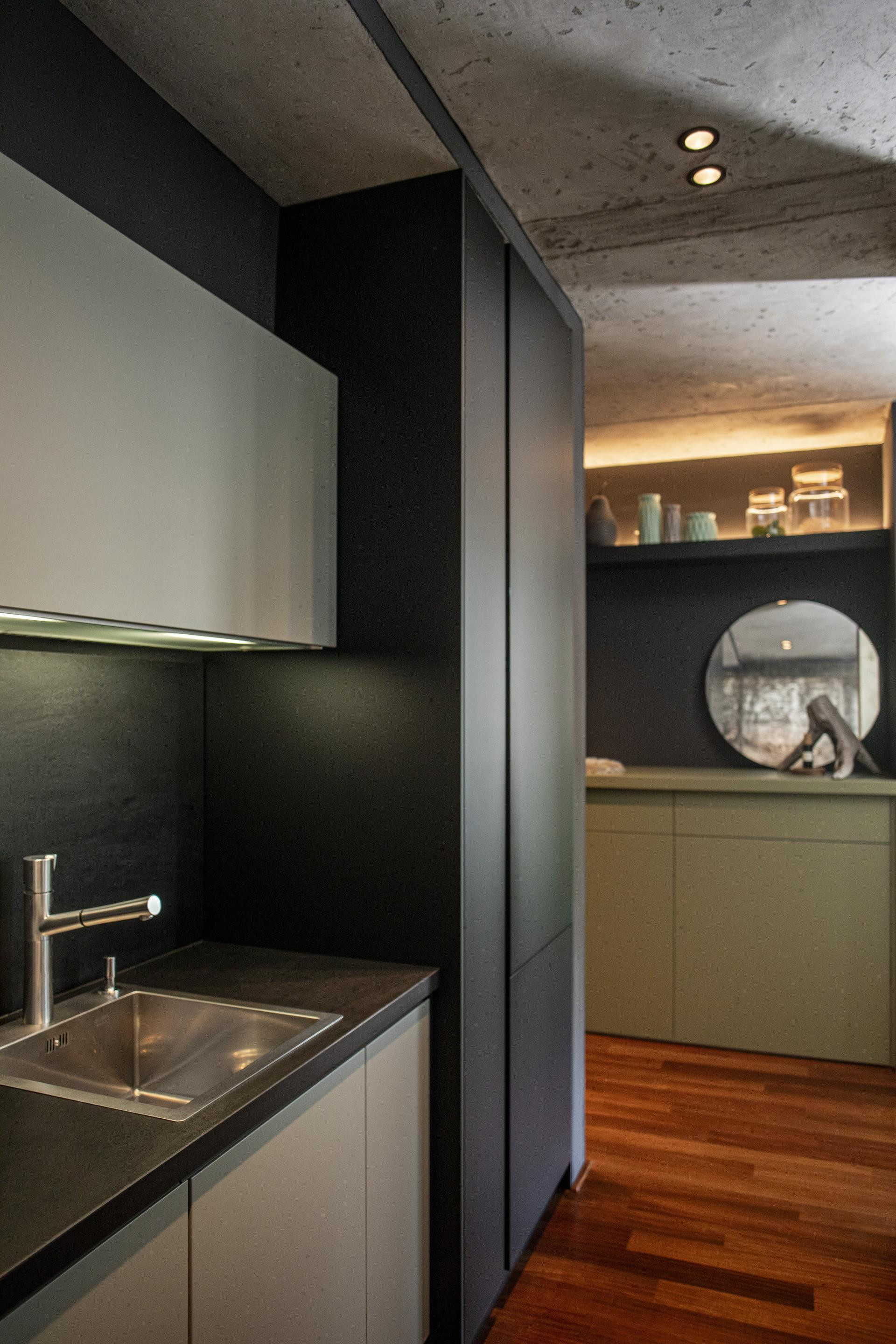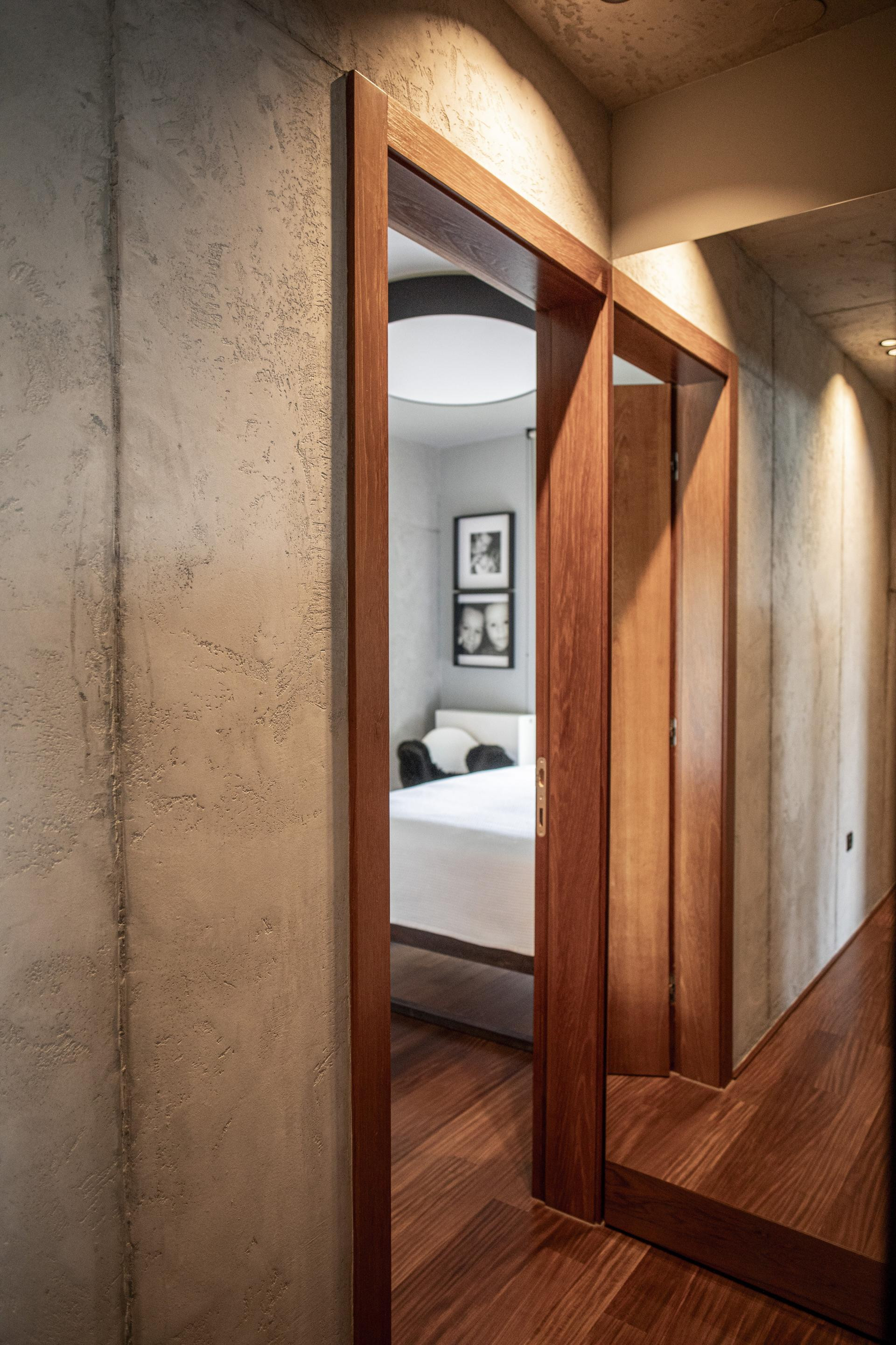 Prostorom prevladavaju hladniji tonovi u završnim obradama namještaja i vanjskoj stolariji koji izvrsno komplementiraju izuzetno toploj boji parketa i unutarnje stolarije. Specifičnost interijera svakako su stropovi i dio zidova, izvedeni kao "sirova" betonska površina.