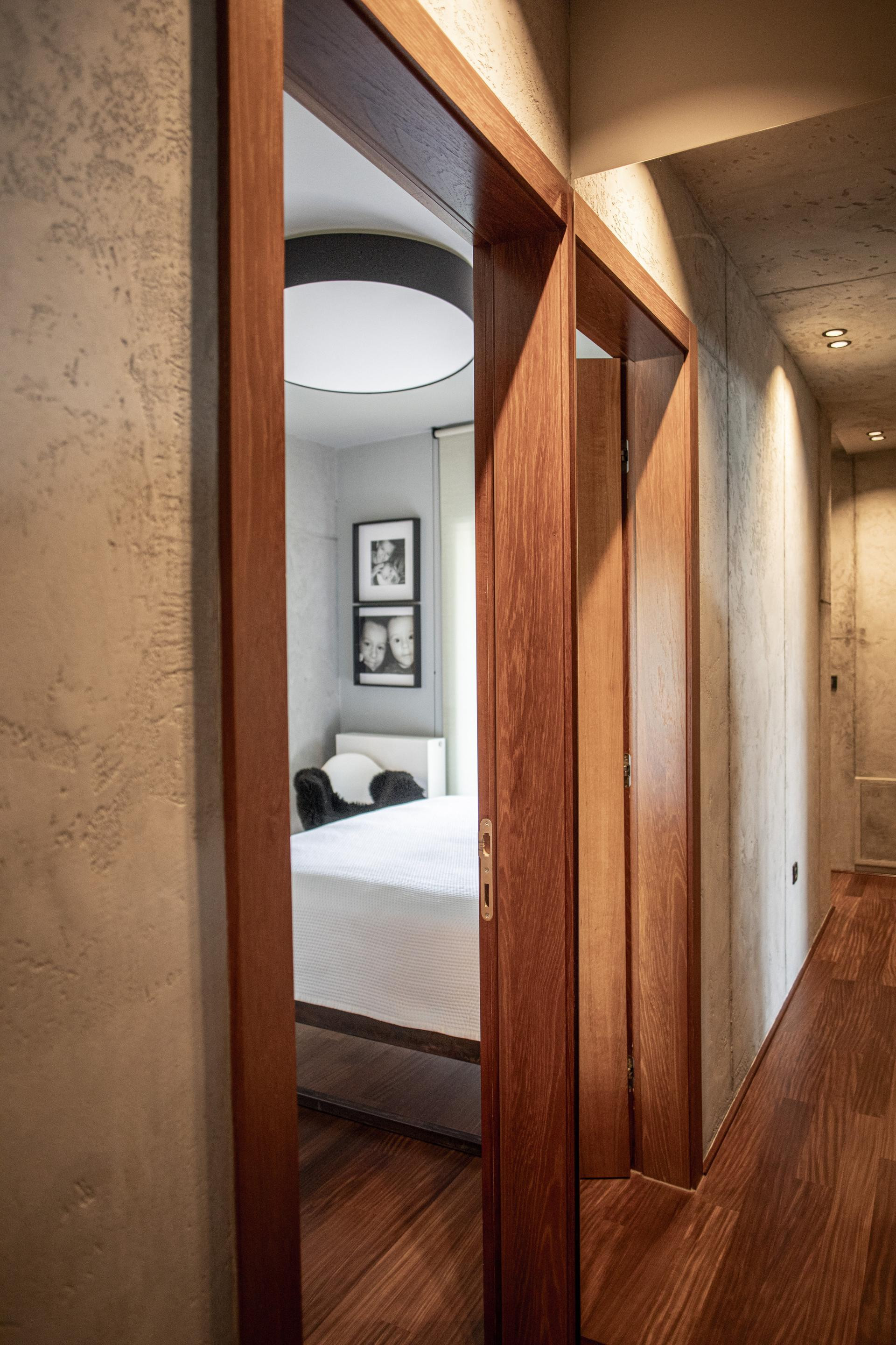 Gotovo je sve rađeno po mjeri, od unutarnje stolarije izvedene u tikovom furniru, preko kuhinje, ormara, stola, kreveta i radnih stolova do grebalice za mačke.