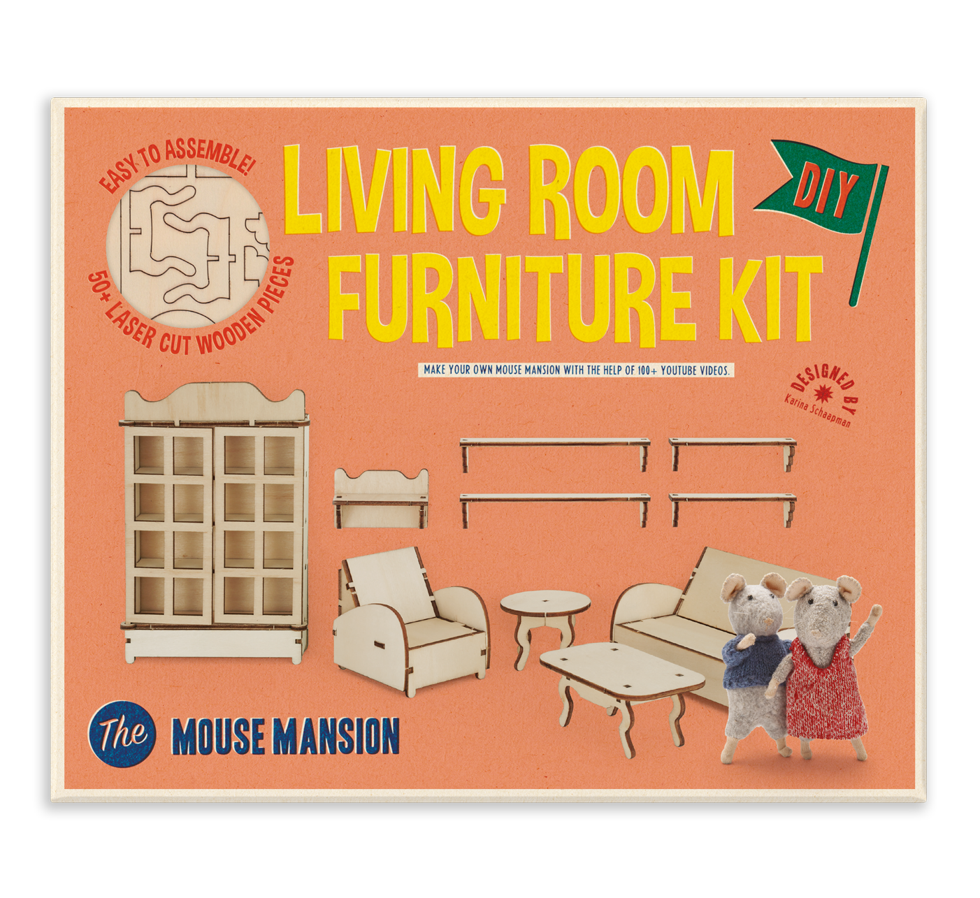 Uz pomoć ovog kompleta možete napraviti najljepši drveni namještaj za vašu vlastitu Kuću mišić u roku keks. Dijelovi namještaja se mogu jednostavno izvaditi iz četiri drvene ploče, a zatim ih složite kao 3D puzzle. Pustite svojoj mašti na volju kad dekorirate i bojate namještaj! Komplet je dizajnirala Karina Schaapman koja stoji iza izvorne Kuće mišić. Pogledajte video s uputama na www.themousemansion.com za ideje, savjete i trikove. Primjereno je za djecu stariju od šest godina. Komplet za dnevnu sobu možete kupiti u Frankturi po cijeni od 14,95 €.