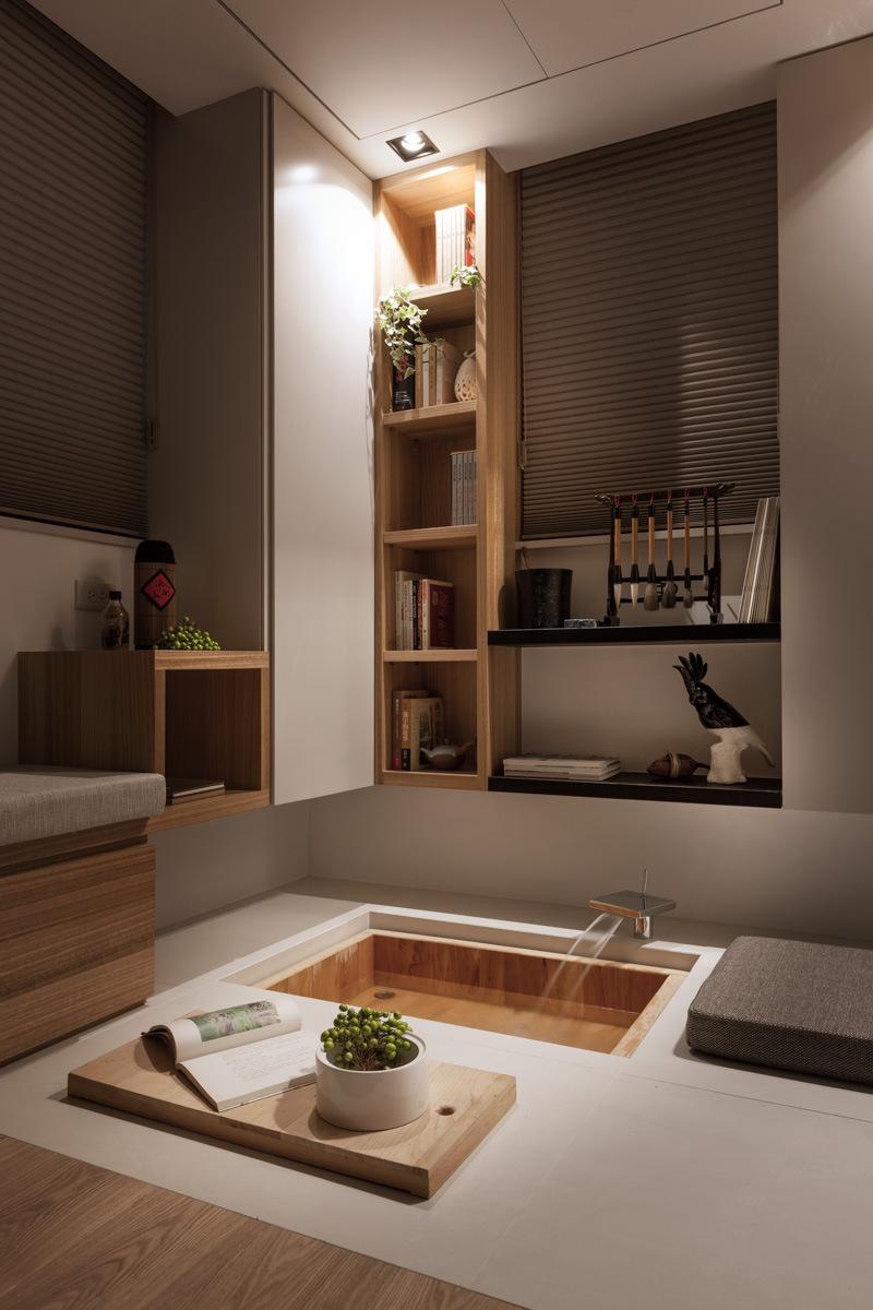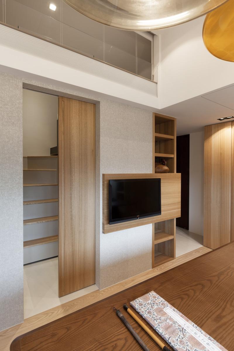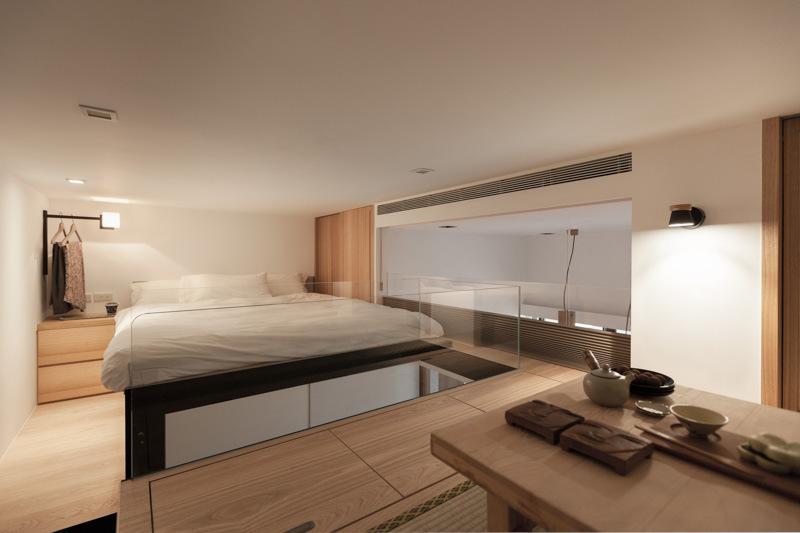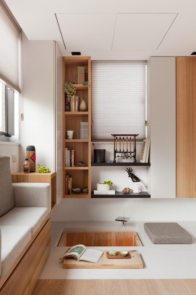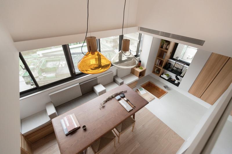Skladištenje je, naravno, uvijek problem u ovako malom domu. Dizajner je pametno ugradio spremište u inače neiskorištene prostore na stropu. Ovi klizni ormari se spuštaju kada je to potrebno i potpuno se sklapaju kada nisu u funkciji. Isto vrijedi i za skriveni prostor za meditaciju na nižoj razini koji se zatvara drvenom daskom kada se ne koristi.