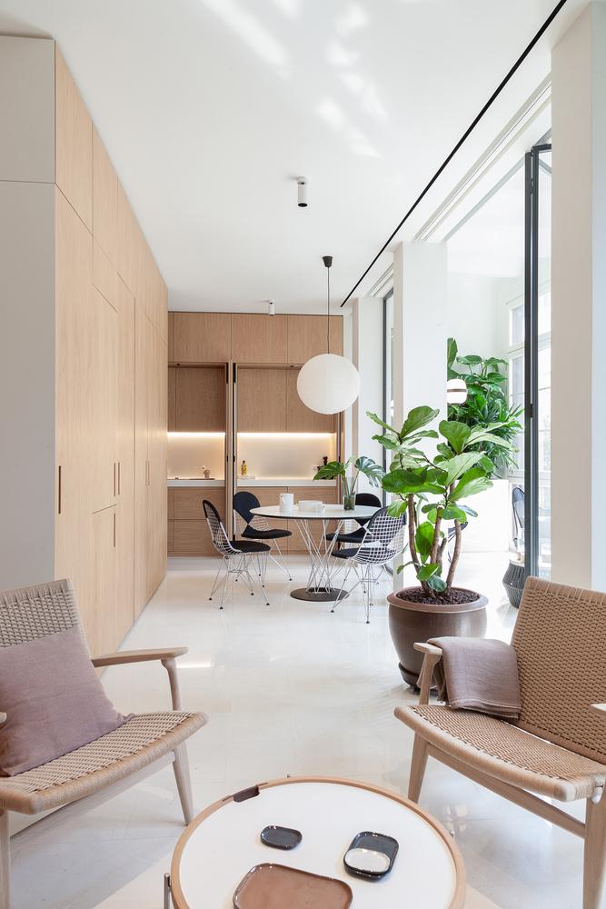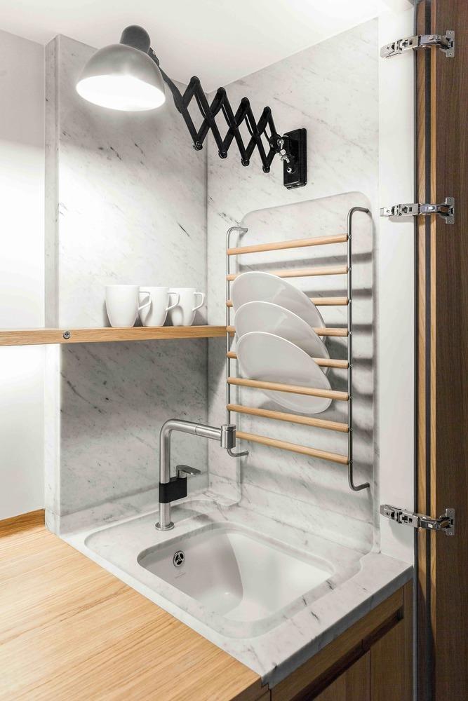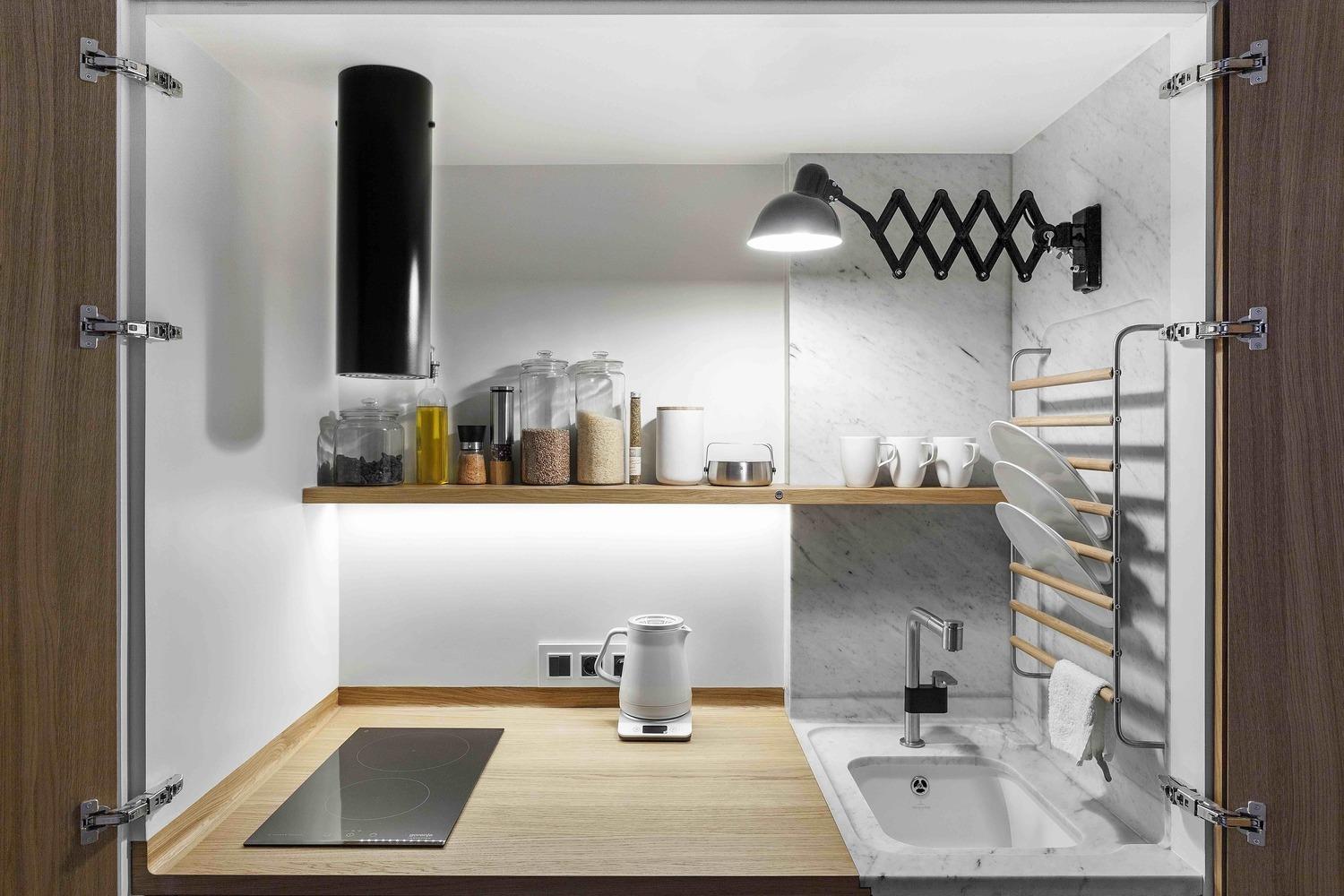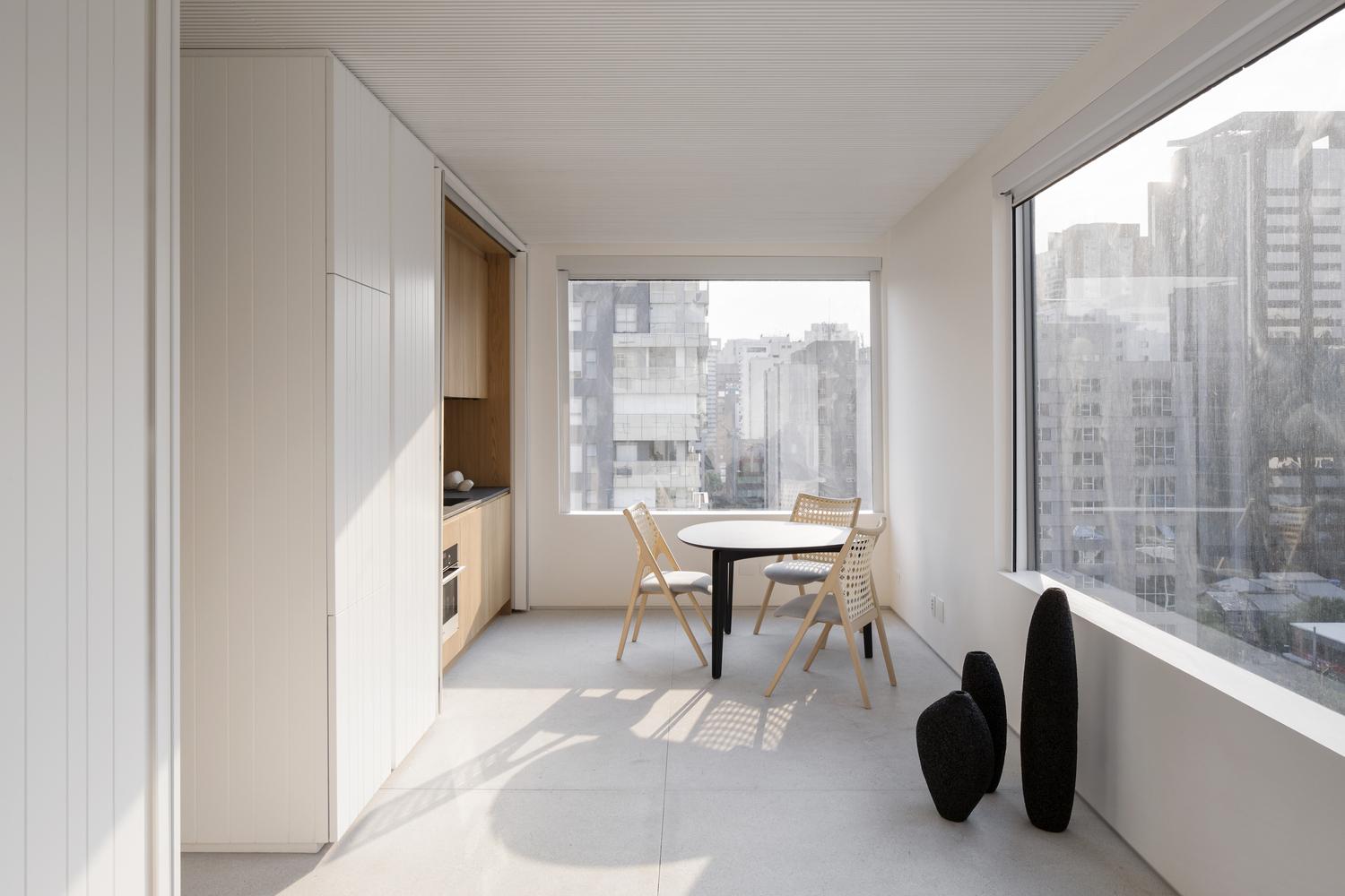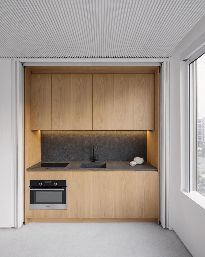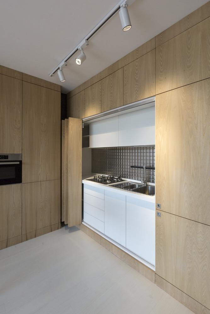 Još jedan stan od 33 četvorna metra, naziva 33 Apartment studija Soek Arquitetura, na sličan je način koristio strategiju skrivene kuhinje kako bi maksimalno iskoristio ograničeni prostor. Uvučena u zid i skrivena iza kliznih bijelih ploča, minimalistička kuhinja uključuje pećnicu, sudoper, ploču za kuhanje i više polica za odlaganje osvijetljenih zlatnim pozadinskim osvjetljenjem i prirodnim svjetlom susjednog prozora. Osim funkcionalne namjene, pomični paneli imaju i estetsku funkciju, odvajajući glatku bijelu estetiku ostatka prostora od toplih drvenih ormarića i tamnog kamenog pulta kuhinje. Štoviše, skrivena vrata namjerno su dizajnirana da uštede prostor: kada se otvore, mogu se preklopiti i gurnuti natrag u praznine s obje strane kuhinje.