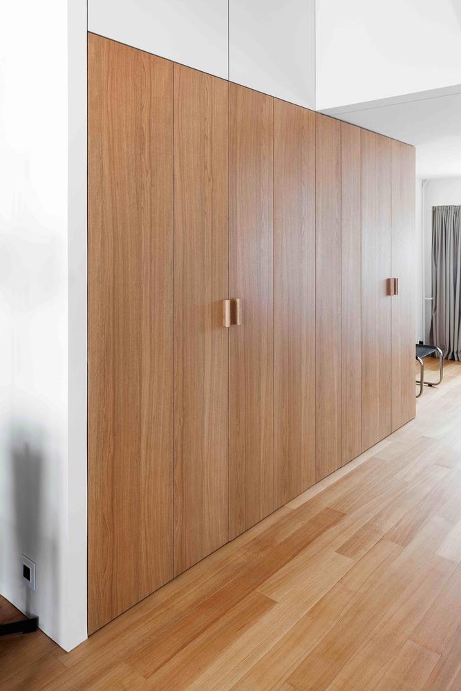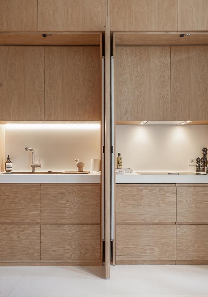 Na temelju postojećih primjera, najčešći način sakrivanja kuhinje je postavljanje u udubljenje i zatim zaklanjanje iza vrata na šarkama ili kliznih vrata. To zahtijeva rano planiranje i relativno kompaktan dizajn kuhinje, ali rezultati mogu biti fenomenalni. Na primjer, u stanu od 33 m2 studija Bazi, arhitekti su radili s ograničenim prostorom kako bi potpuno redizajnirali klijentov kompaktni stan. Komprimirajući svaku dnevnu komponentu u precizno dimenzionirane blokove, arhitekti su zbili i uvukli kuhinju iza drvenih vrata na šarkama od poda do stropa, uključujući police ispod radnog prostora za odlaganje. Svaki element kuhinje posebno je dizajniran i izgrađen, s daskom za rezanje koja može kliziti unutra i van zida i drugim pogodnostima koje se savršeno uklapaju u dodijeljeni prostor. Štoviše, skrivena vrata mogu se otvarati ili okomito prema van u prostor ili se sklopiti u stranu, dajući vlasniku mogućnost da uštedi još više prostora dok koristi kuhinju.