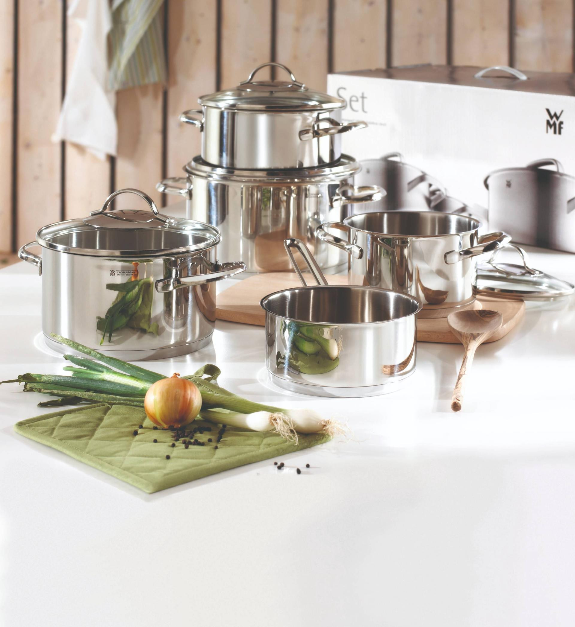 Lonci od oplemenjenog čelika omogućuju jednostavnu pripremu raznih jela zahvaljujući ravnomjernom provođenju topline i lakoći održavanja, dok pribor za jelo od nehrđajućeg čelika unosi dozu elegancije u svaki obrok, bilo da je riječ o brzom doručku ili večeri s gostima. Tave s neljepljivim premazom savršen su izbor za one koji žele pripremati jela s manje masnoće, bez zagorijevanja i uz minimalan trud pri čišćenju. Organizaciju dodatno olakšava blok s noževima, koji omogućuje da svi alati budu na jednom mjestu, uredni i lako dostupni.
