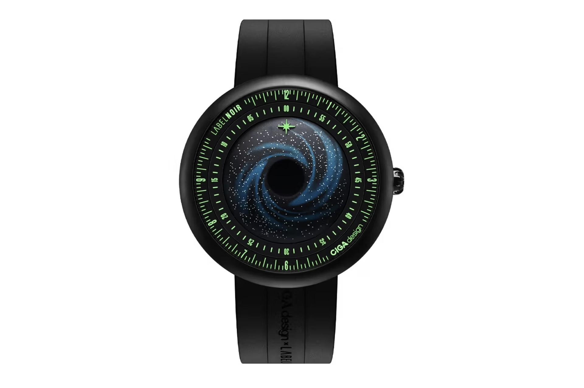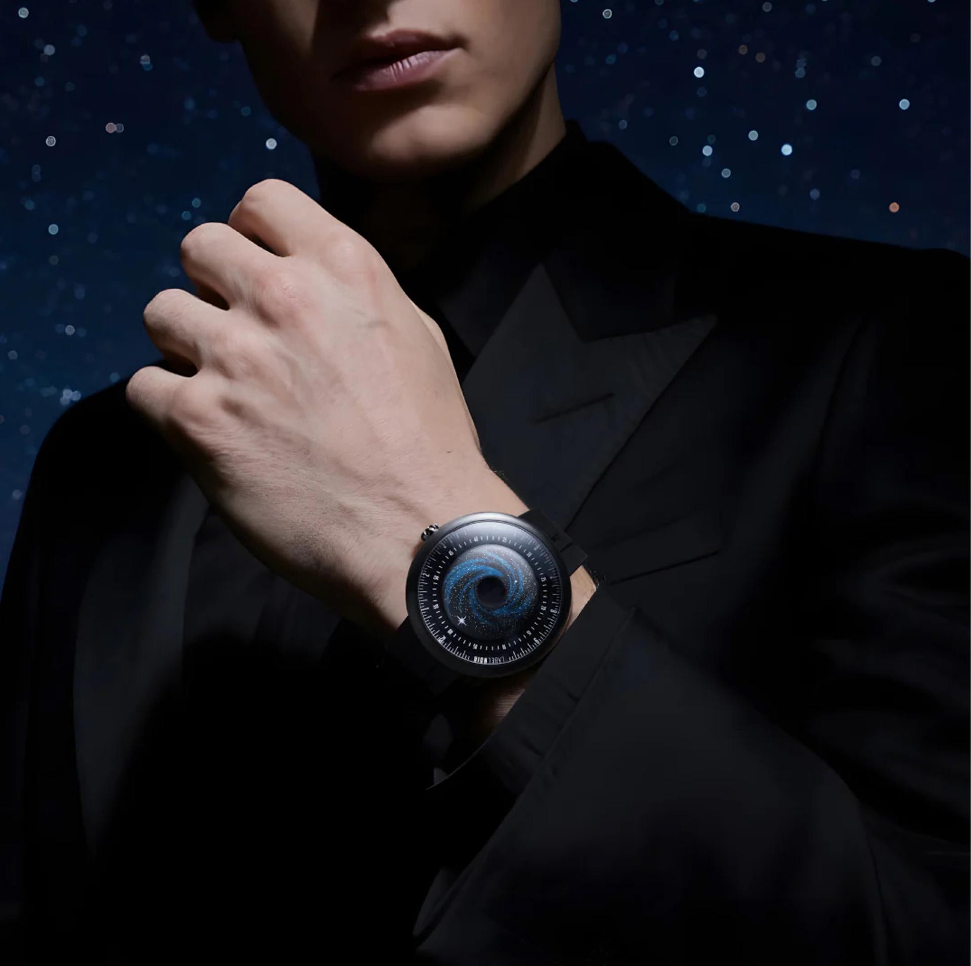 Ono što oduzima dah nalazi se ispod safirnog stakla: spiralni cifer (lice sata), inspiriran galaktičkim strukturama, čije se nijanse plave i crne stapaju u središnji vrtlog, takozvanu ‘crnu rupu‘, premazanu Super Black pigmentom koji apsorbira gotovo svu svjetlost (točnije, 99,6 posto). Umjesto kazaljki, tu je polarizirana zvijezda koja svijetli u mraku, i zajedno s rotirajućim prstenima za sate i minute prikazuje vrijeme kao da je riječ o navigaciji broda u međuzvjezdanom prostoru, a ne o klasičnom satu.