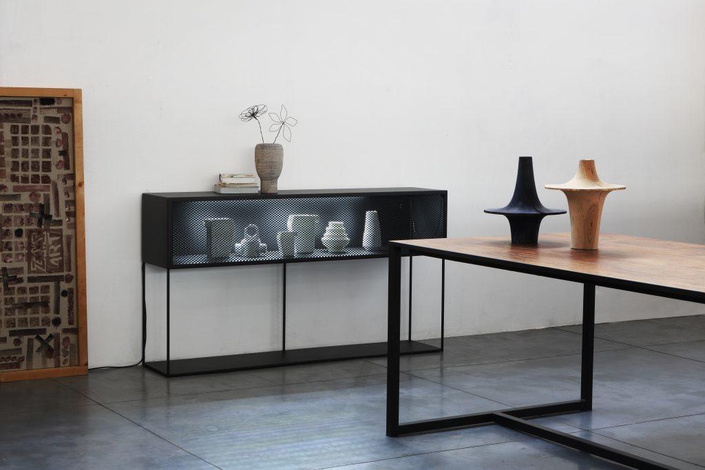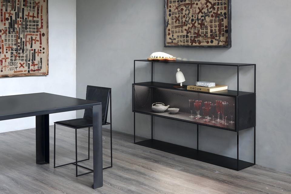 Ekspandirani metal od kojeg je izvedena fronta ormarića povezuje konstrukciju od četvrtastih metalnih cijevi, a opcionalna LED rasvjeta dodatno akcentira igru materijala i volumena. Dimenzije 150 x 33 x H 103 cm mogu ga činiti nezahtjevnim, ali i dominantnim elementom prostora, ovisno o kontekstu ambijenta i dekoracija.
