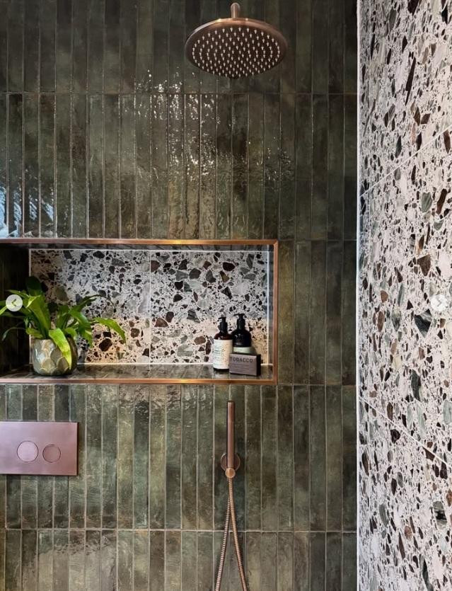 I zaista, već na prvi pogled jasno je da je riječ o prostoru u kojem je svaki detalj promišljen - od izbora pločica do rasvjete. Terrazzo površine koje su obilježile ovogodišnji pobjednički projekt ponovno su u fokusu. Ovaj put tu je kombinacija Rialto San Polo terrazzo obloga koje cijelom prostoru daju prepoznatljivu teksturalnu dinamiku s bež pločicama Brit Stone Pennant na podu i tamnozelenim pločicama Foundry Smeraldo u zoni tuša.