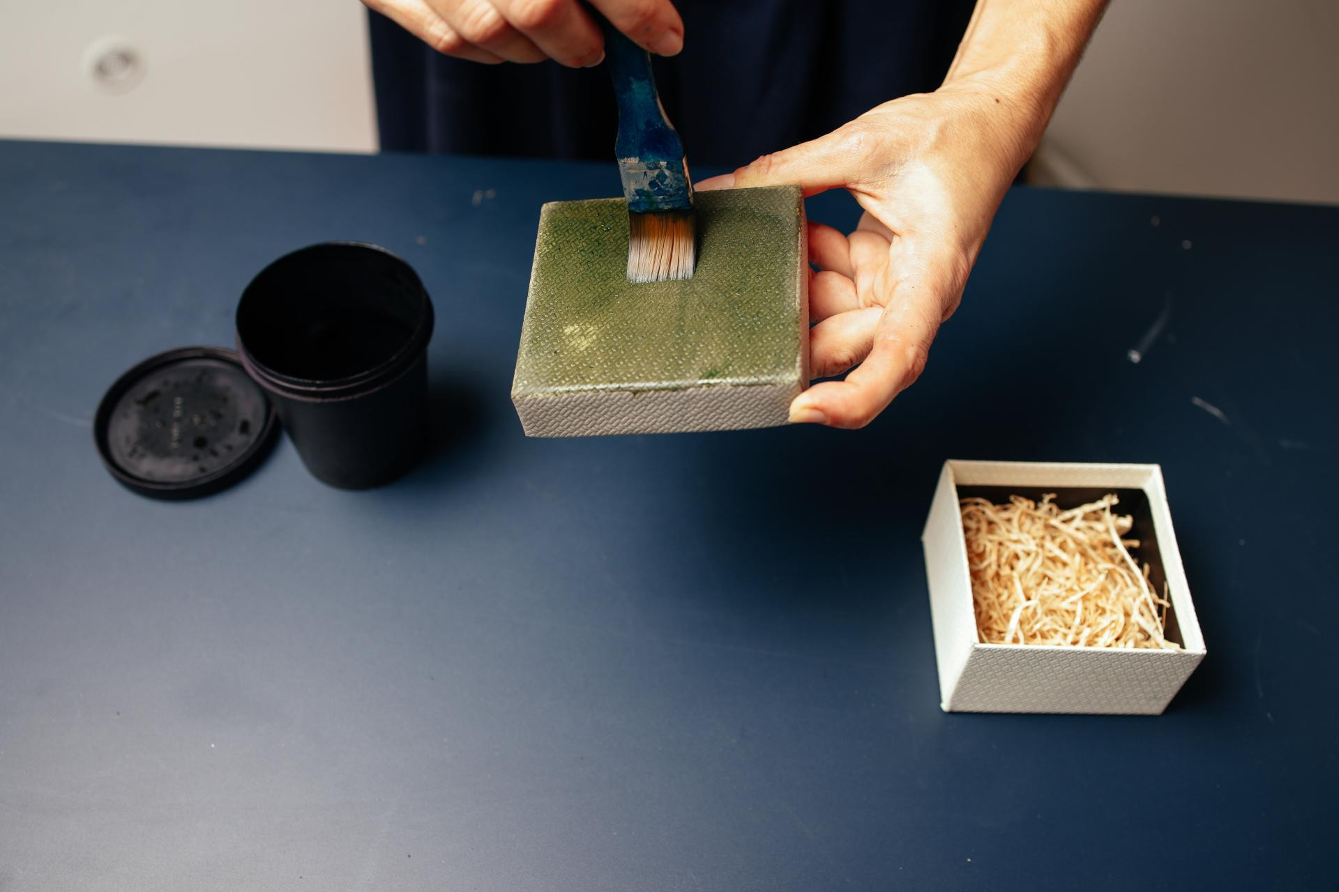 Emulzija se ravnomjerno nanosi na poklopac kutije. Premazana površina se suši na tamnom mjestu nekoliko minuta