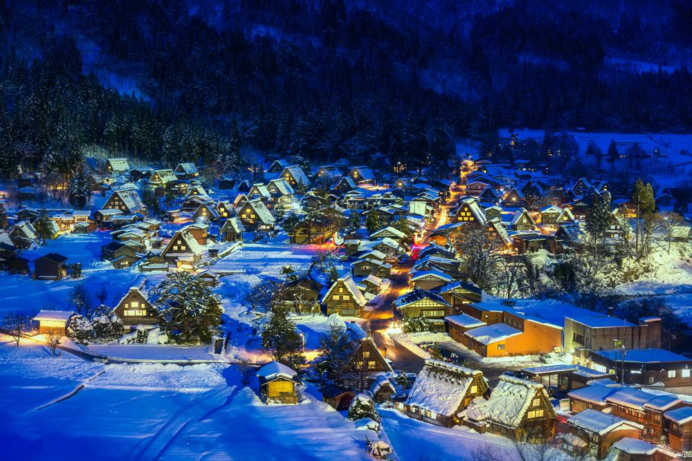 Uvučeno u snježne planine prefekture Gifu, japansko selo Shirakawa-go je na UNESCO-ovom popisu svjetske baštine u kojem vladaju tradicija i mir. U prosincu poznate gassho-zukuri kuće na imanjima izgledaju kao prizori iz japanske narodne priče, strmih krovova od slame, osobito kad su prekrivene snijegom i noću osvijetljene fenjerima. Posjetitelji mogu šetati tihim ulicama, diviti se stoljećima starim domovima i otkrivati malena svetišta skrivena među drvećem.