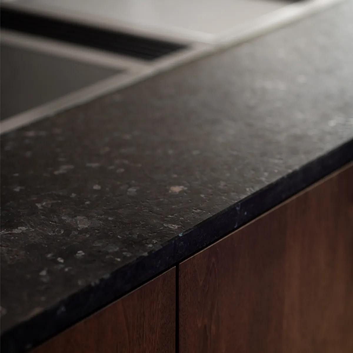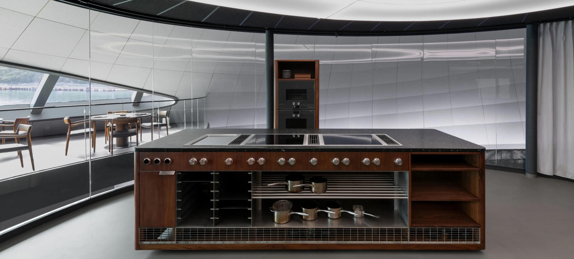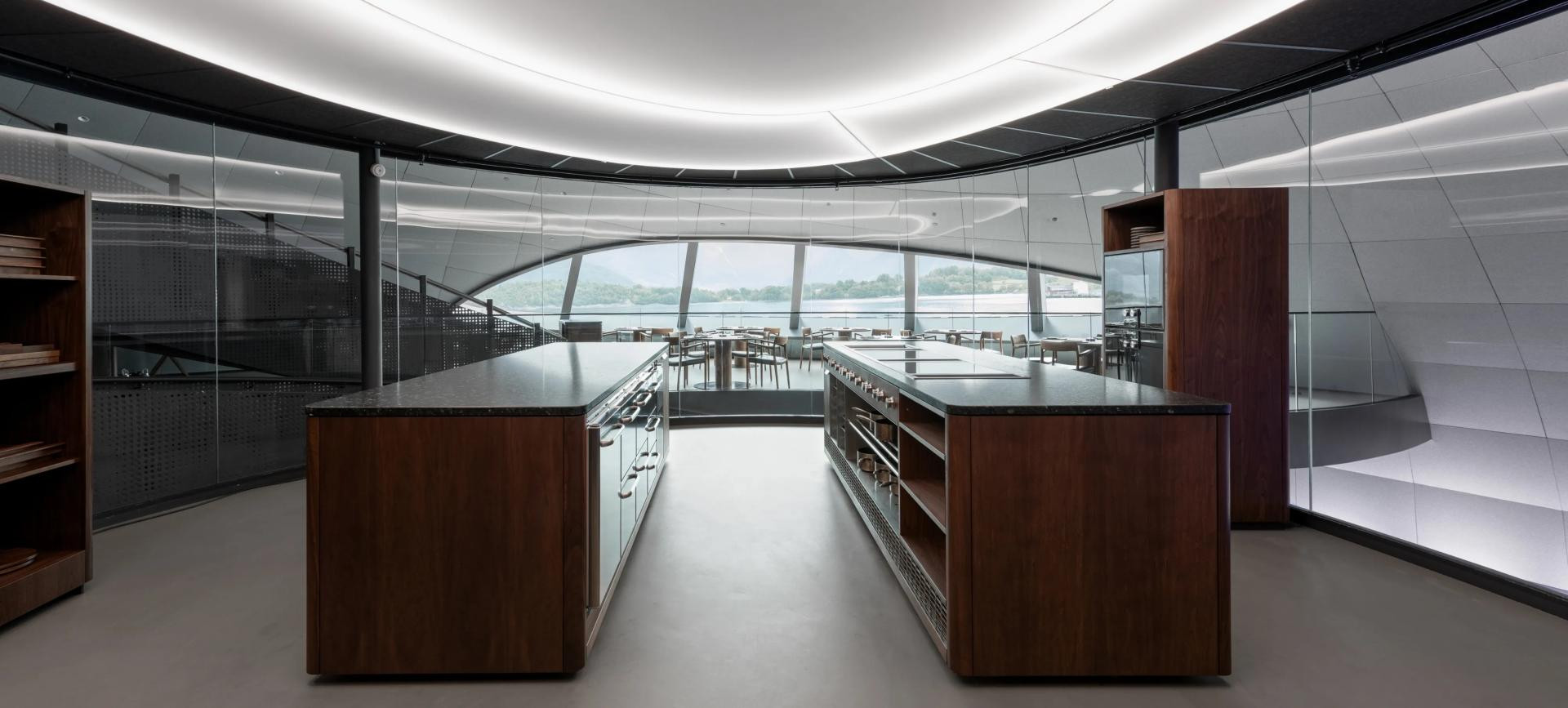 Kuhinja, koju je dizajnirao Tjerand, bila je tehnički zastrašujuća: radna, vidljiva, zatvorena kuhinja, u lebdećoj, i stoga pokretnoj strukturi. Unutar staklene elipse, Tjerand Gjerde i Kjartan Vagle radili su s prirodnim materijalima: od drva, kamena i metala (u ovom slučaju oraha i norveškog granita) kako bi izradili dva ogromna kuhinjska otoka, od kojih se na jednom nalazi golema indukcijska ploča za kuhanje serije Gaggenau Vario 400, Teppan Yaki i ventilacija koja struji prema dolje. Dva velika ormara pametno smještaju opremu i pećnice serije 200. Svi otoci i ormarići su pokretni, nudeći potpunu fleksibilnost glavnoj kuharici Aniki Madsen. S obzirom na fokus Tjeranda i Kjartana na materijalnost i njihovu težnju za "jasnim dizajnom s prekrasnim detaljima", ne čudi što smatraju da je ‘prirodno raditi s Gaggenauom‘.