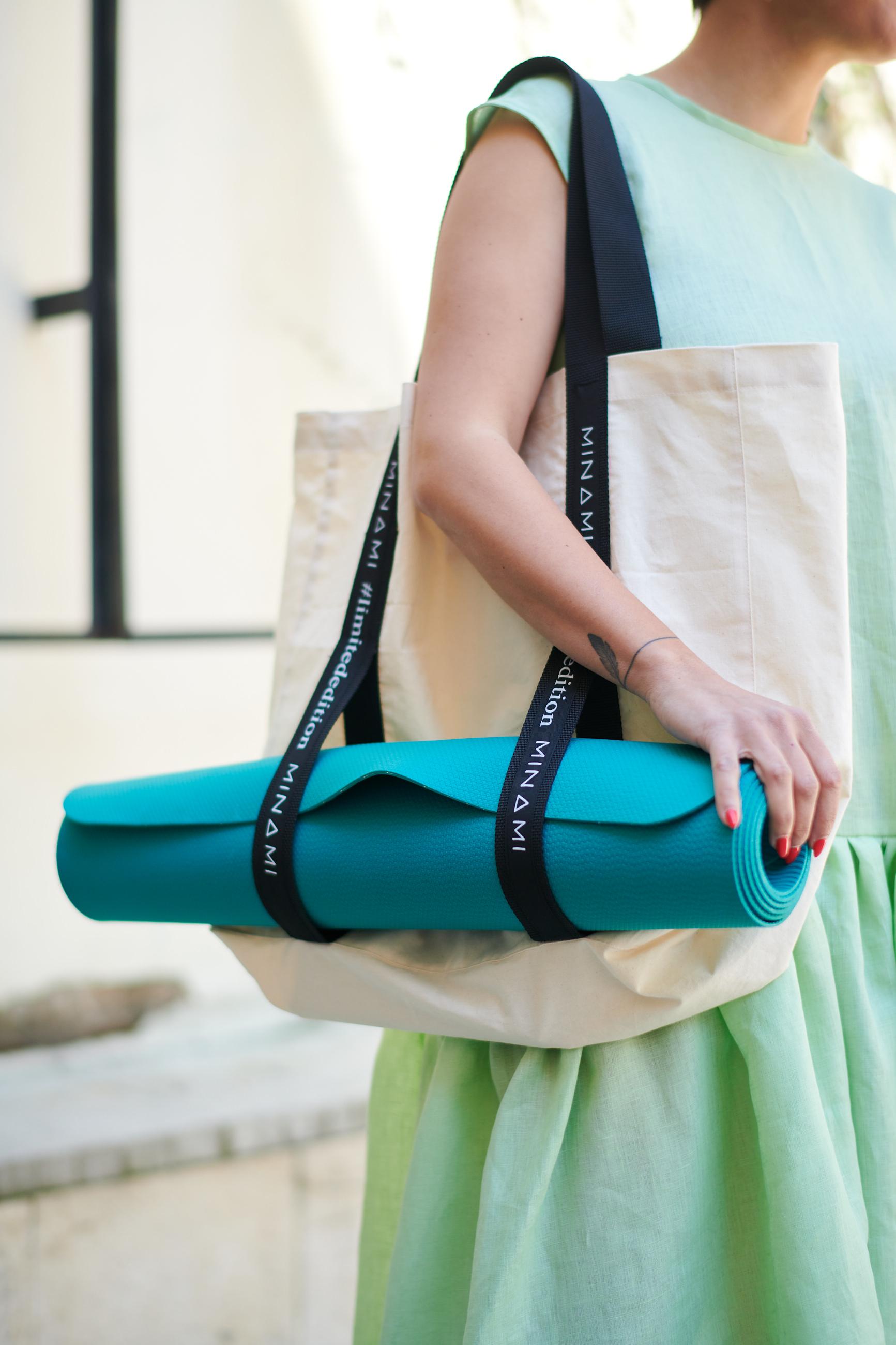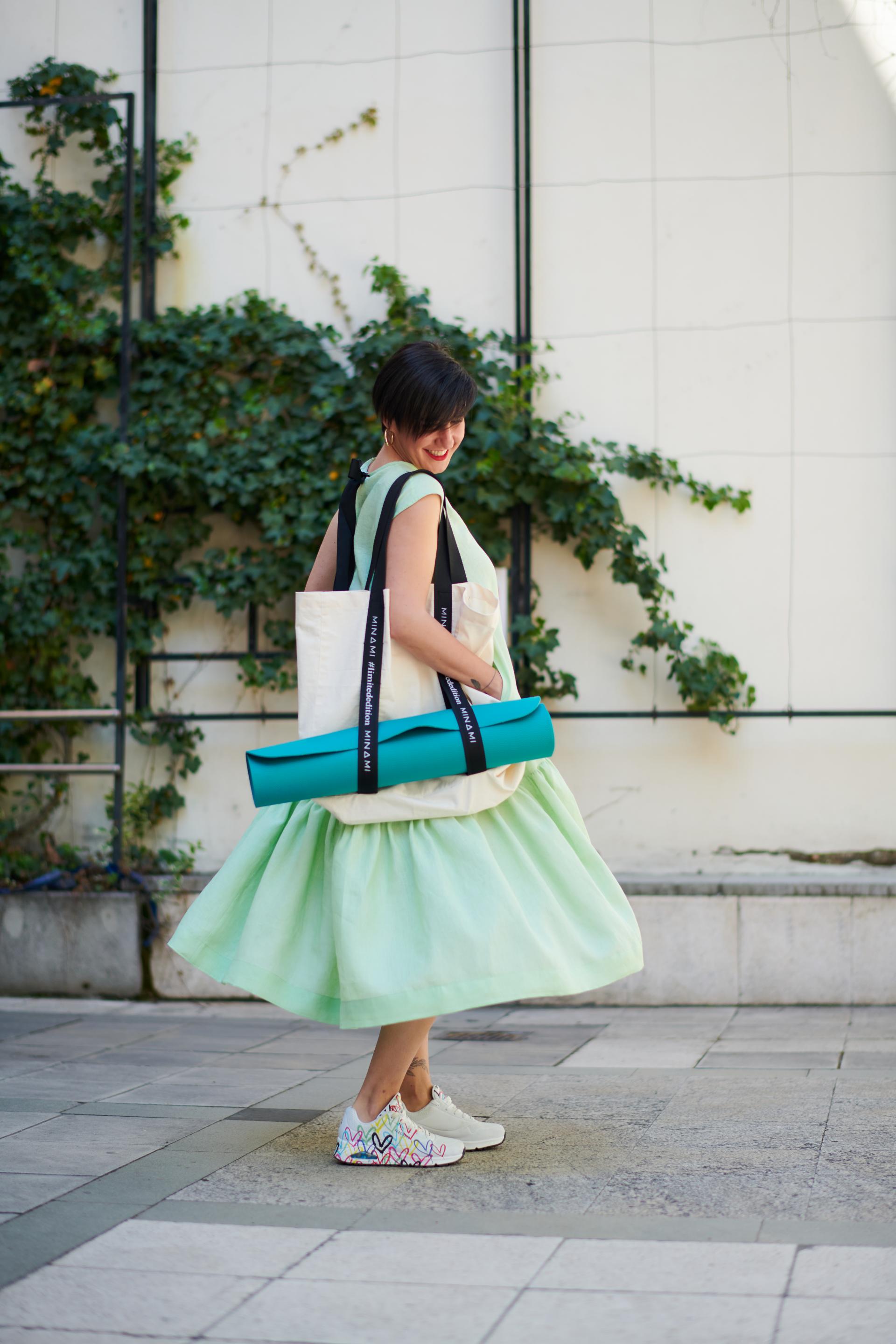 Mini kolekcija za mame donosi dvije krasne lanene haljine s detaljem u obliku volana. Dolaze također u ružičastoj te u boji mente, a tu je i jedna praktična platnena torba velikih dimenzija, s držačem za prostirku za vježbanje koja joj daje dodatnu dimenziju funkcionalnosti.