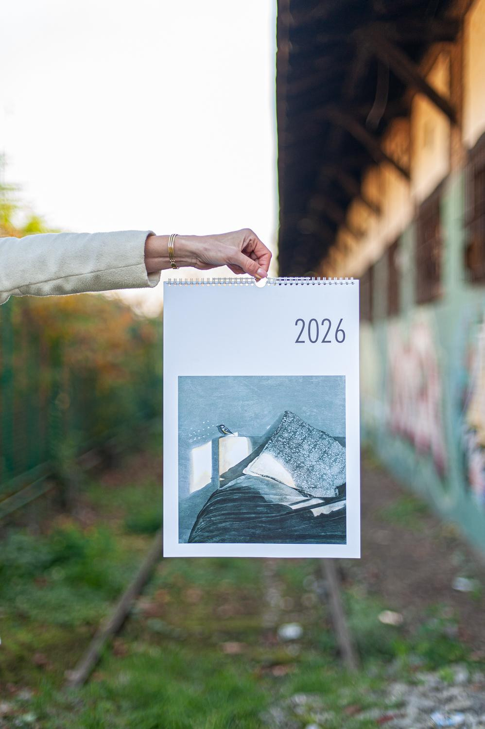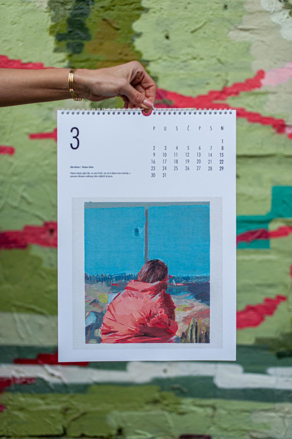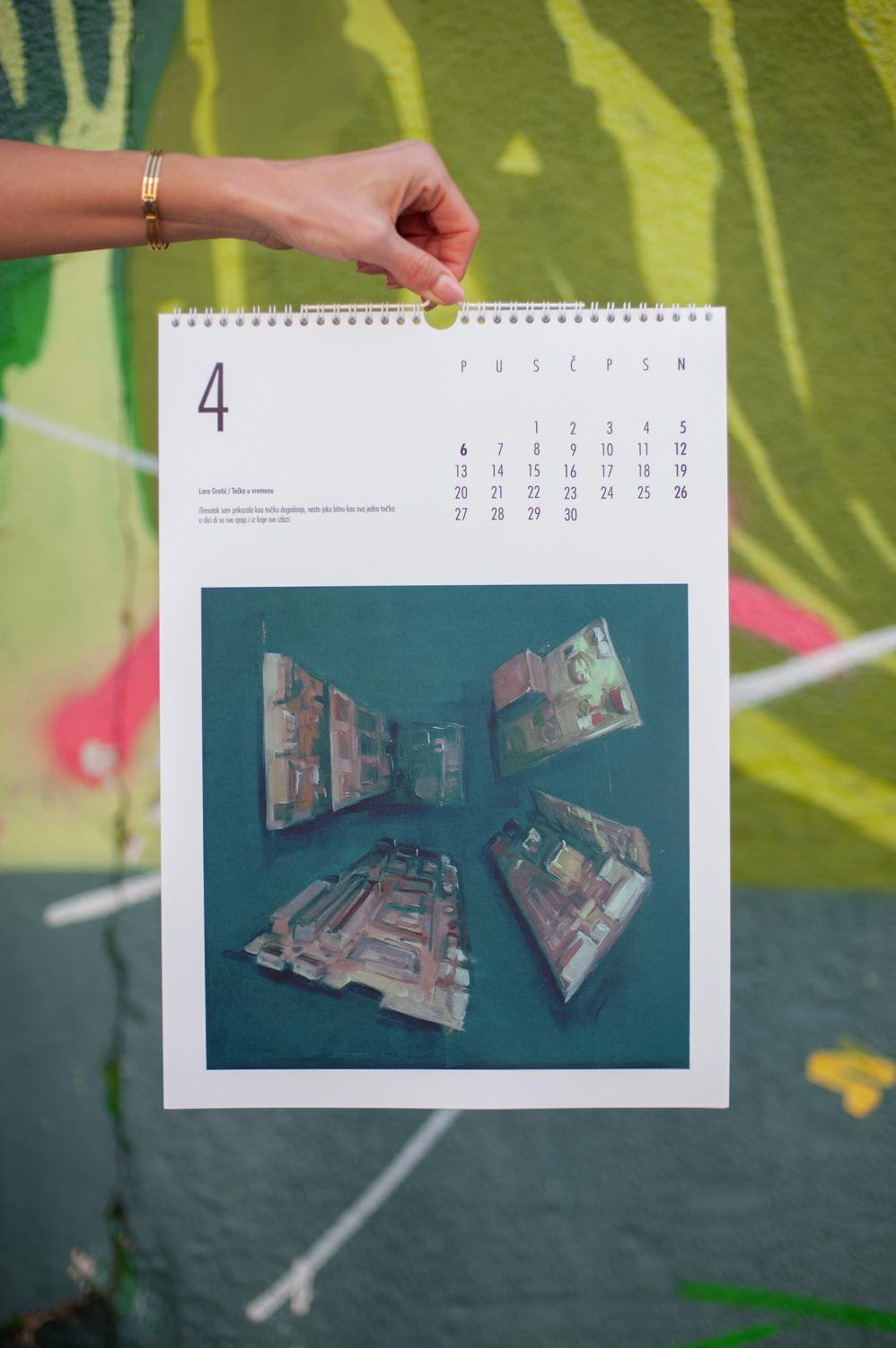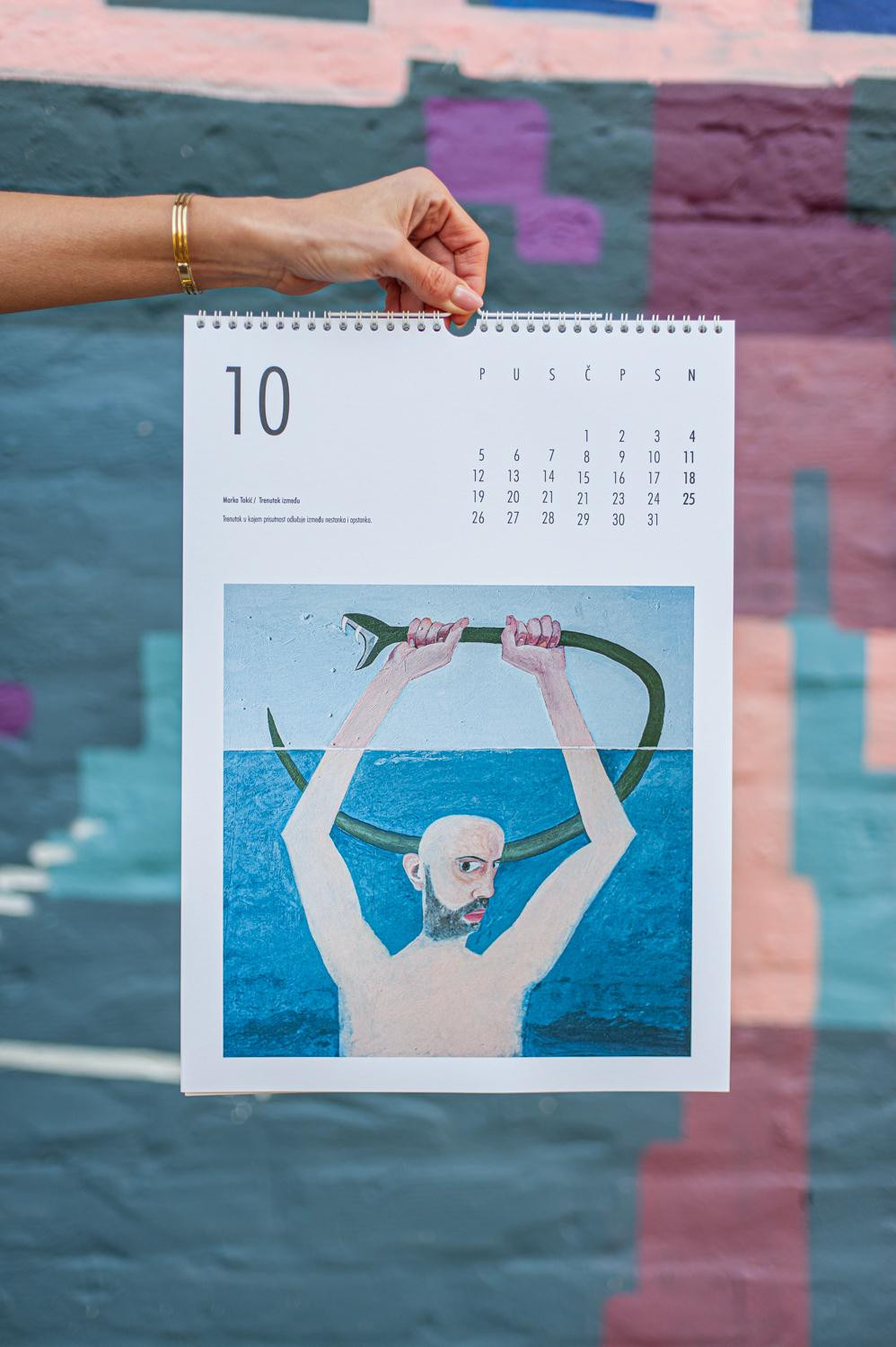 Naslovnicu šestog kalendara ONI 2026 potpisuje Mihael Bađun s radom "Jutro", zaustavljenim trenutkom iz spavaće sobe obasjane suncem, a ovogodišnje izdanje donosi izuzetno raznoliku postavu autora, poetika i stilova. Siječanj otvara Marcela Gjoni svojim radom "Tiranija trenutka", kroz koji upozorava da trenutačna kultura ubrzanosti ugrožava prostor mašte potreban svakom umjetniku. Veljaču obilježava "Susret" Juraja Mihalkea, minimalistička scena dvaju cilindara koji istražuju krhkost prolaznosti. U ožujku Alba Miočev predstavlja rad "Gledam Seline", promišljajući kako vrijeme mijenja sliku, fizički i simbolički. Travanj donosi rad "Točka u vremenu" Lare Grotić, koja trenutak vidi kao epicentar događanja, sjecište iz kojeg sve izlazi i u koje se sve vraća. Svibanj obilježava mitski, gotovo ritualni rad Helene Nemeš "Trenutak stvaranja mašte", njezin prikaz onog fragilnog, magičnog impulsa koji rađa stvaranje. U lipnju Ivonna Grlić donosi introspektivni rad "You Are Not There", gdje folija simbolizira nemogućnost bijega od sjećanja, izolacije i nostalgije. Srpanj pripada Adrianu Krmpotiću (BODI), čiji rad "Iznenađenje" secira trenutak straha i olakšanja. Kolovoz i Jakov Pašalić povezuju trenutak i sjećanje u radu "Most", a Marcela Bencek u rujnu predstavlja izuzetno slojevit rad "Liminalni plodovi", koji istražuje prijelaze, rast, propadanje i psihološke kodove utkane u prirodne oblike. Listopad donosi snažno simboličan rad Marka Tokića "Trenutak između", trenutak u kojem se odlučuje između nestanka i opstanka. Studeni pripada Brunu Butorcu i njegovom radu "Iza zida Anouk Aimée", mentalnoj igri optimizma koja iza pukotina zida pronalazi daljnji put. Godinu zatvara Hrvoje Majer s radom "Amsterdam Nights", slikarskim pokušajem stvaranja lažnog sjećanja na mirise nizozemskog baroka.