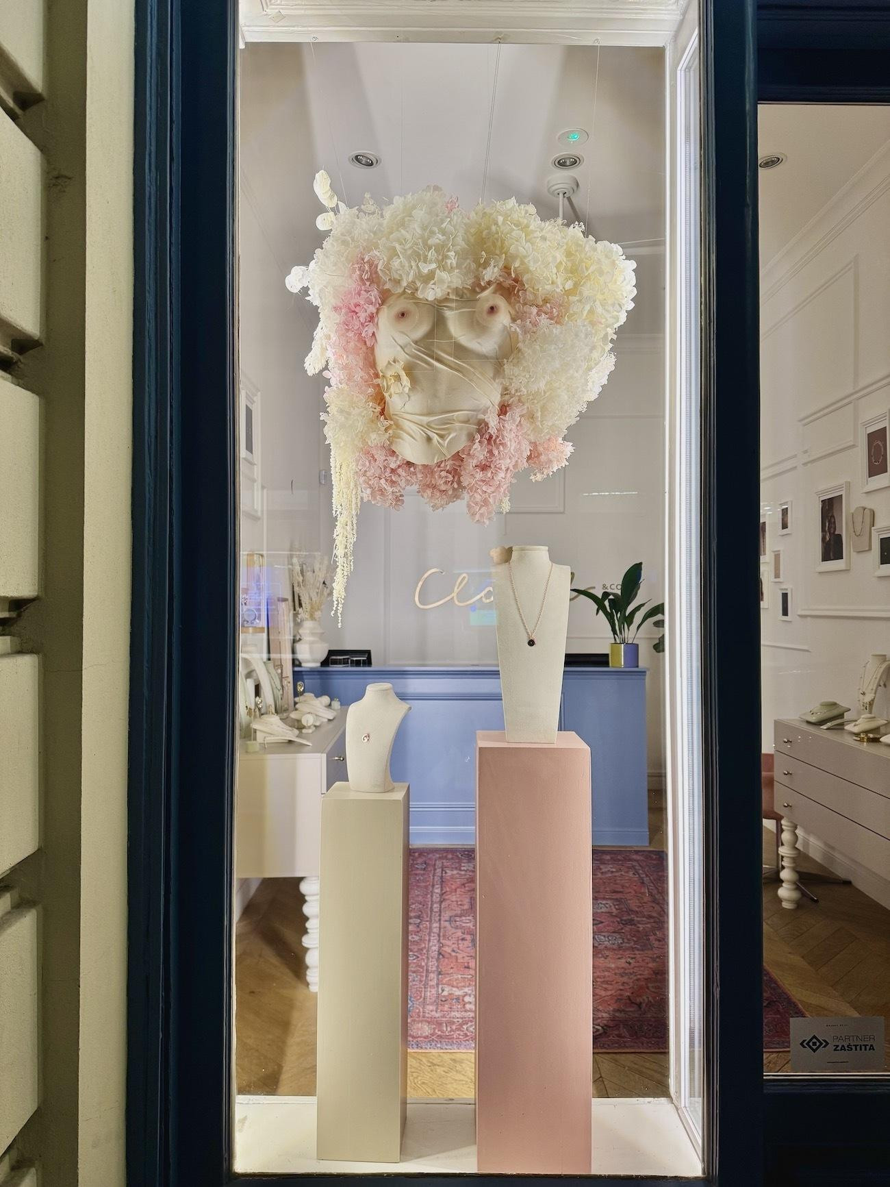 - Izlog smo osmislile Željka Molnar, koja dugi niz godina surađuje s brendom na izlozima i kreativnim rješenjima, i ja, te smo kontaktirale dizajnericu Mihaelu Štimac Rojtinić, vlasnicu brenda Maykl, koja izrađuje predivne korzete koje smo odlučile nekako uklopiti u taj ženski izlog. Isto tako, bile smo sigurne da će Lana iz Tulipa savršeno zaokružiti cijelu priču cvijećem. Marijine silikonske areole smo na kraju odlučile staviti na stakla da stoje ispred samih korzeta i kreiraju dojam kao da su one na tijelu, ali odvojene. To daje tu dodatnu simboliku stvarnosti da te areole žene stavljaju posebno, mogu skinuti i iako su dio njih, odvojive su - ispričala je Katarina.