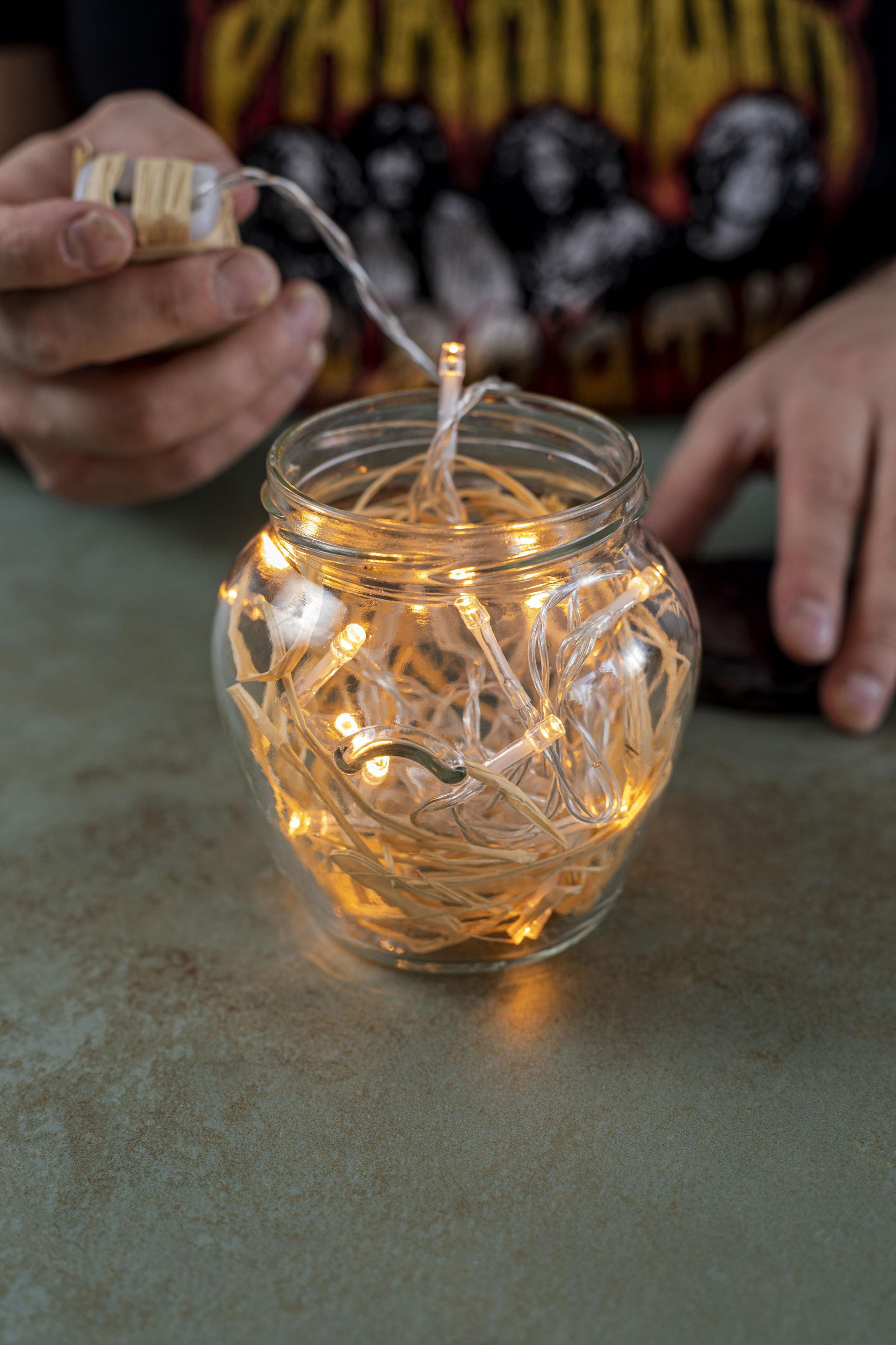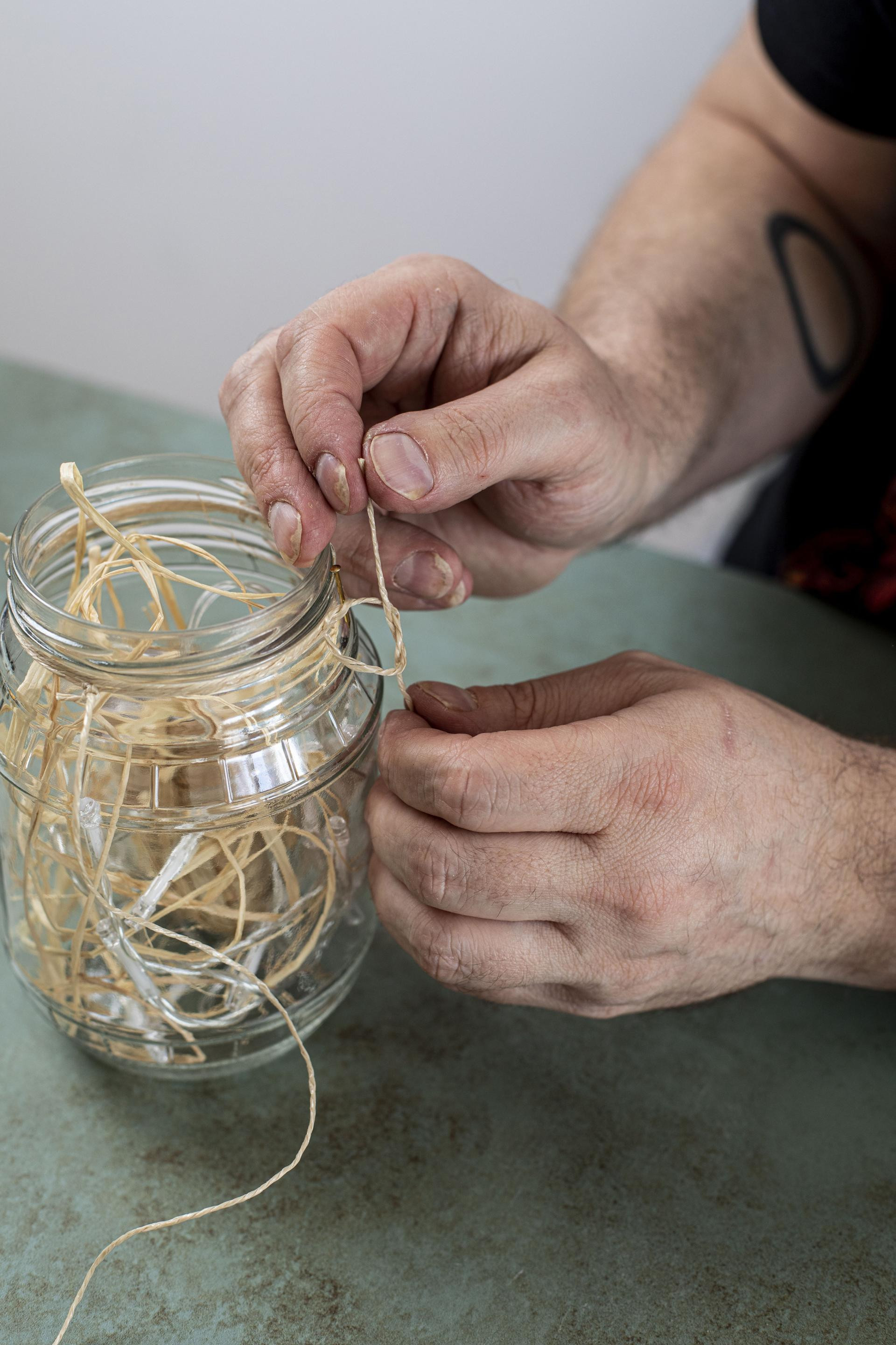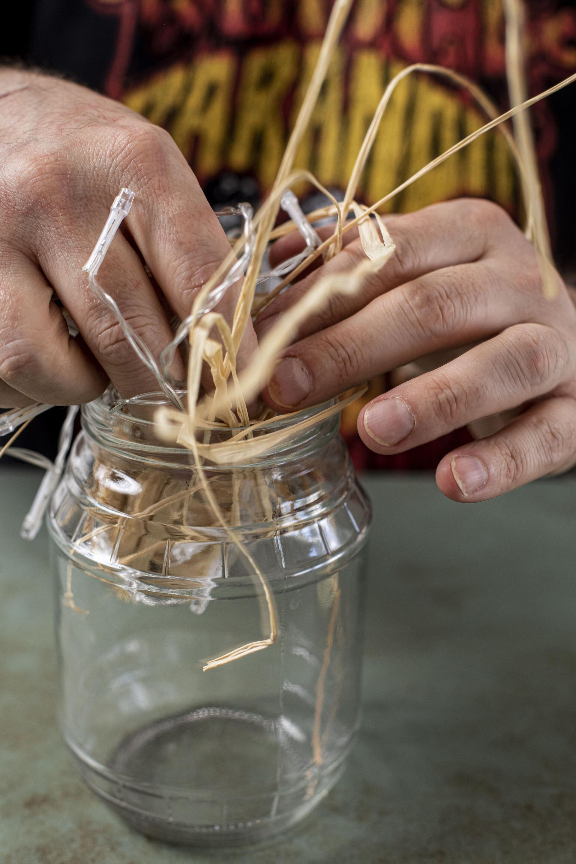 Korak 2: Uzmite šaku rafije i promiješajte je s nizom lampica. Sve ubacite u teglicu, ali nemojte jako pritisnuti. Prema potrebi dodatno rasporedite unutar teglice. Rafija nema drugu ulogu osim toga da se raspored lampica odnosno sadržaj svjetiljke učini dinamičnijim i atraktivnijim.