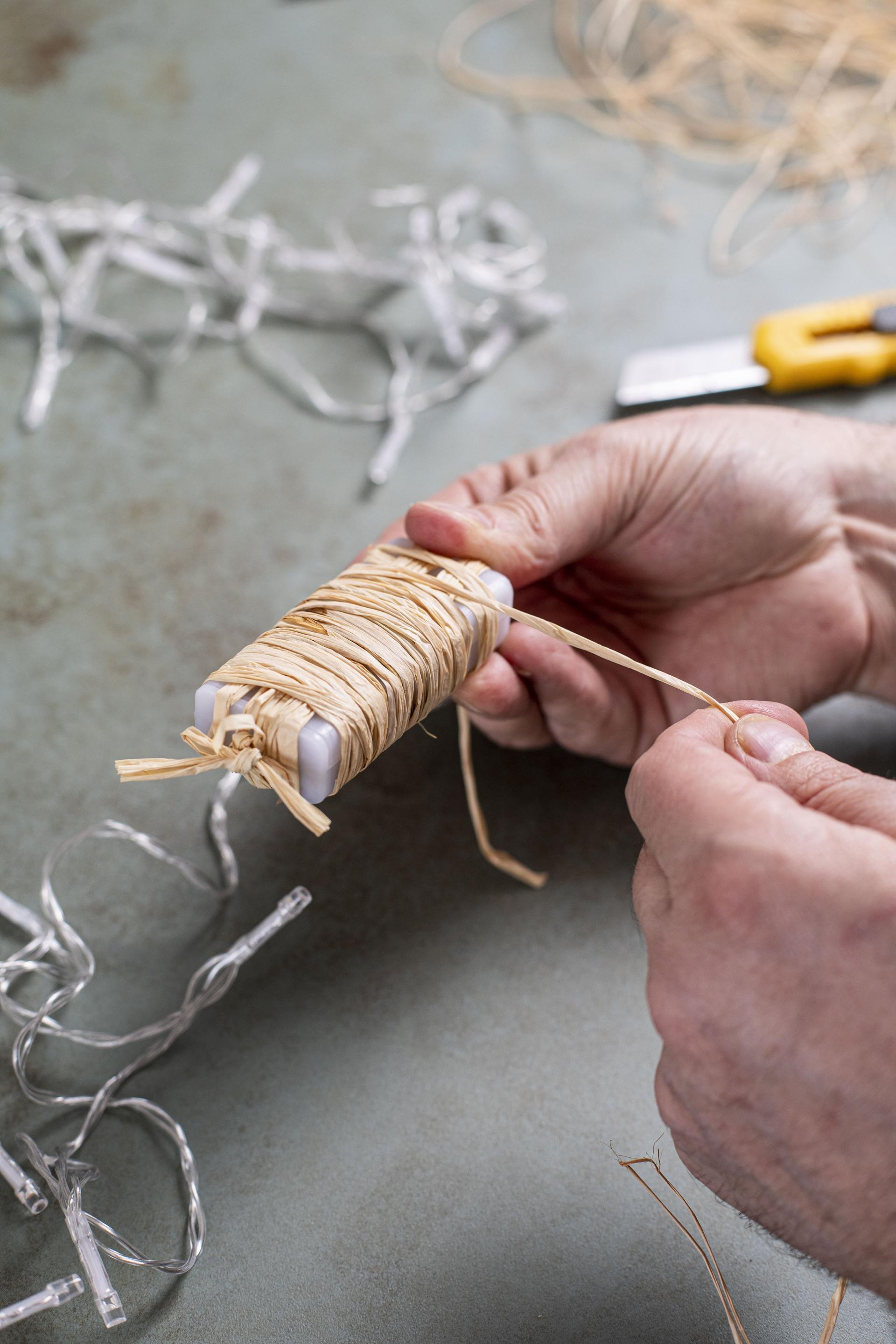 Za varijantu s LED svjetlima potrebni su špaga, rafija i LED lampice s baterijom.
