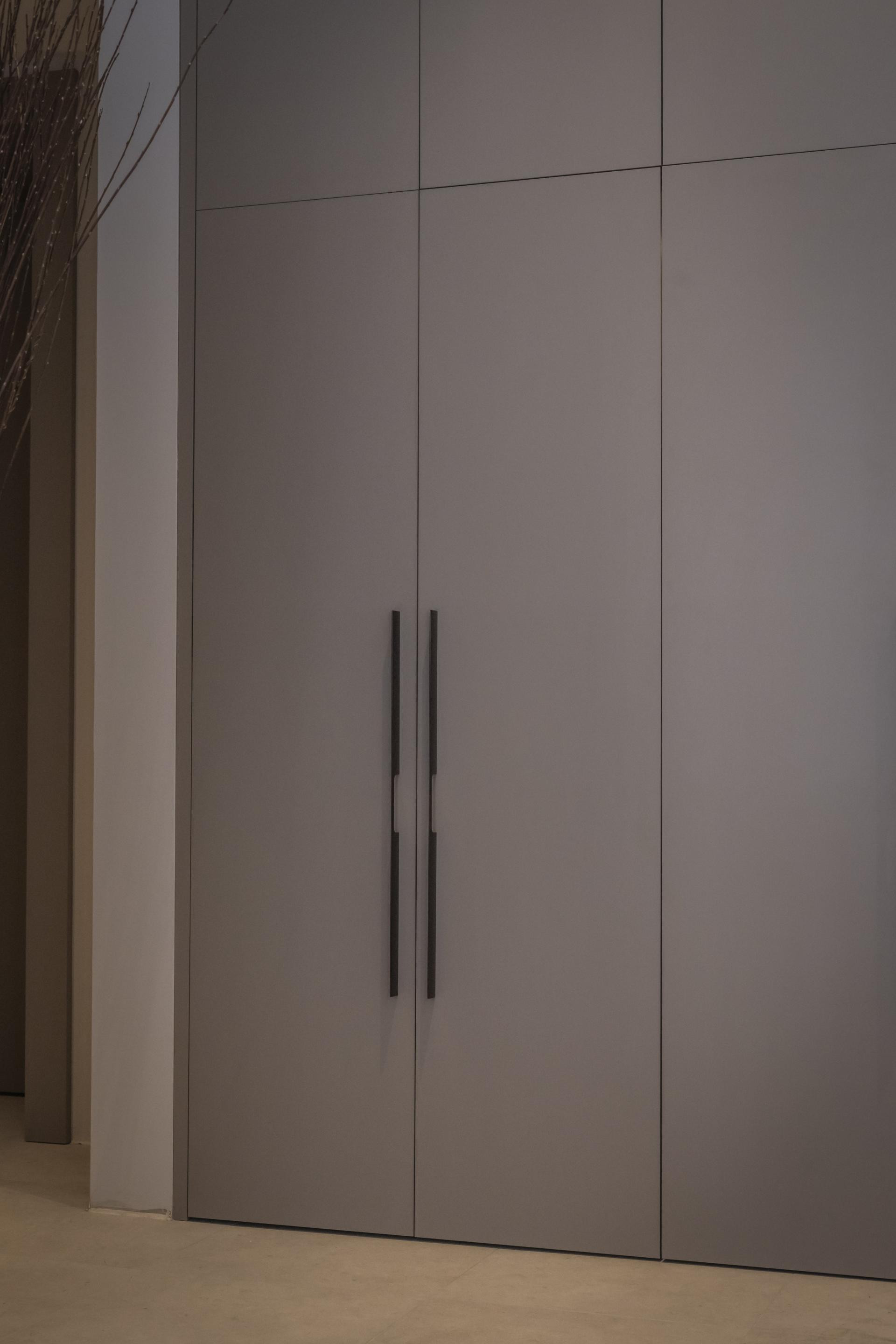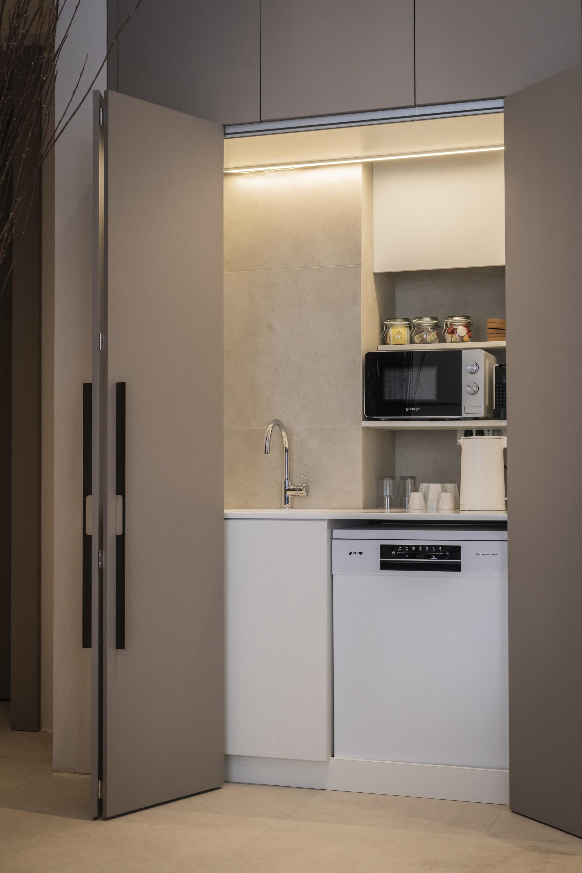 U zajedničkom su dijelu kuhinja skrivena u ormar te elementi s policama od masivnog drva. Naručio ih je iz Belgije, a za decentno razigravanje izmjenjuju se dvije nijanse. Tako osiguravaju da prostor ne djeluje sterilno, a detalji složeni na njima unose dašak svakodnevice. Iako na prvi pogled neobična tlocrta, ovaj ured od 83 kvadrata se u samo nekoliko jednostavnih zahvata može prenamijeniti u stambeni prostor ili drugačiju formu ako ga bude koristilo više zaposlenih.