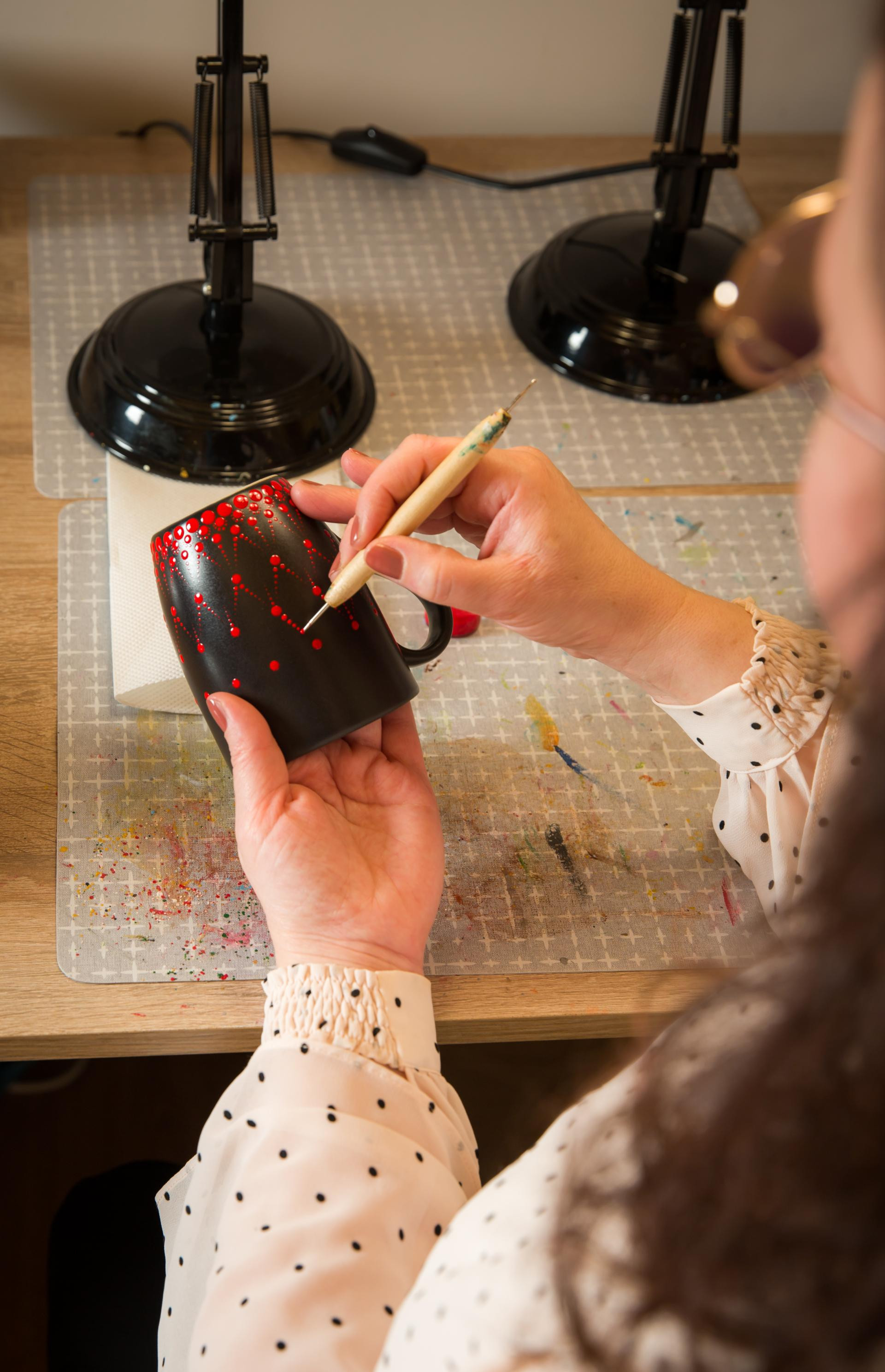 "Kupac izabire proizvod koji mu se sviđa na webshopu, pa krećem s radom. Uzimajući čistu šalicu u ruke, najbitnije je dopustiti da kreativnost preuzme glavnu riječ. To je ujedno najljepši dio stvaranja. Točkam večerima, radim s posebnim alatima - svaki na vrhu ima drugu veličinu kuglice za oblikovanje željene točke", govori Martina. Nakon završetka i još jedne doze sušenja, boja se 30 minuta fiksira u pećnici na 150 stupnjeva. Zatim unikatni predmet Martina ručno pere, pakira u tissue papir i kutijicu po mjeri kao gotov poklon. Kupcu isporuka dolazi kurirskom službom, u velikoj petoslojnoj kutiji.
