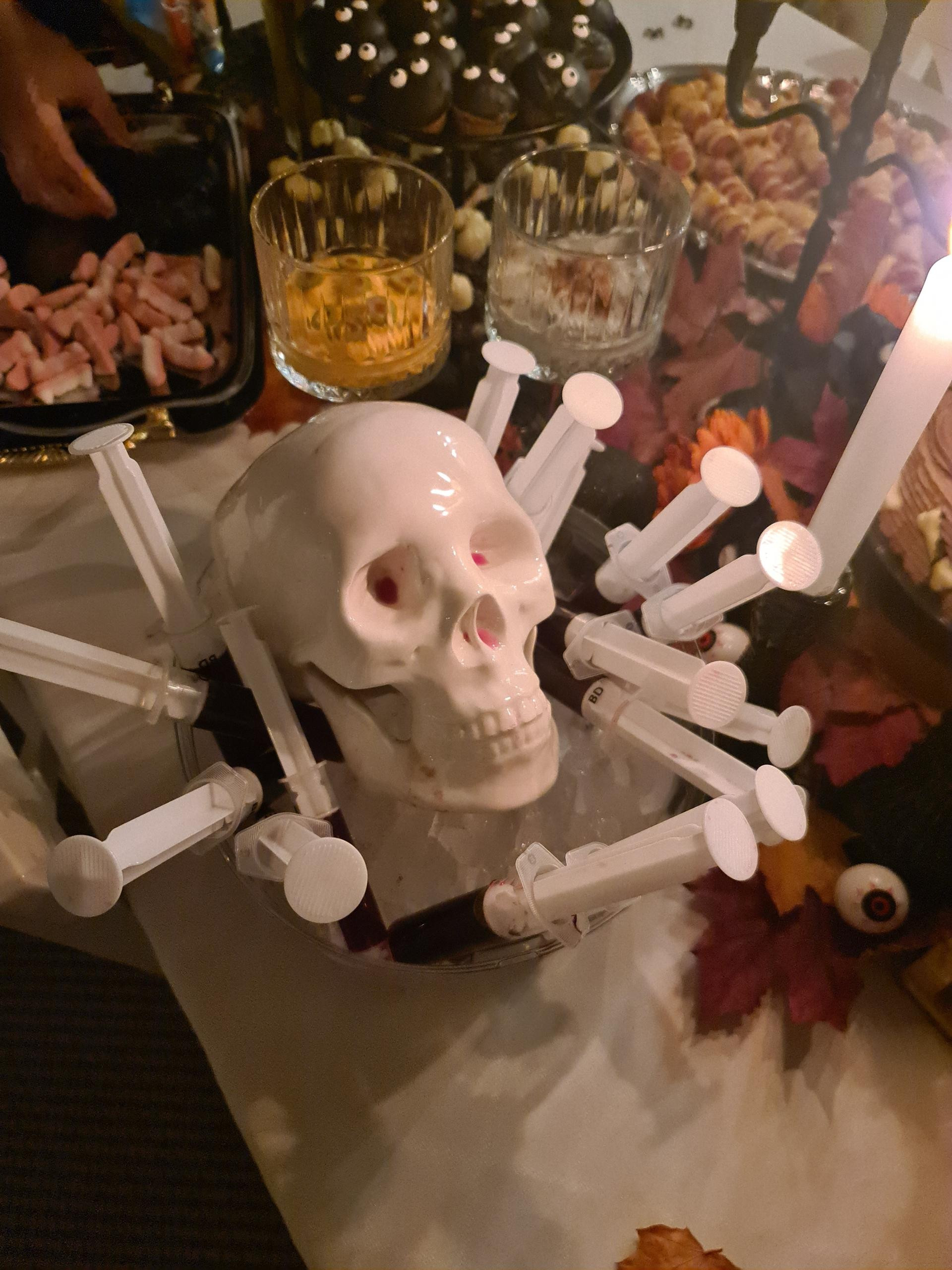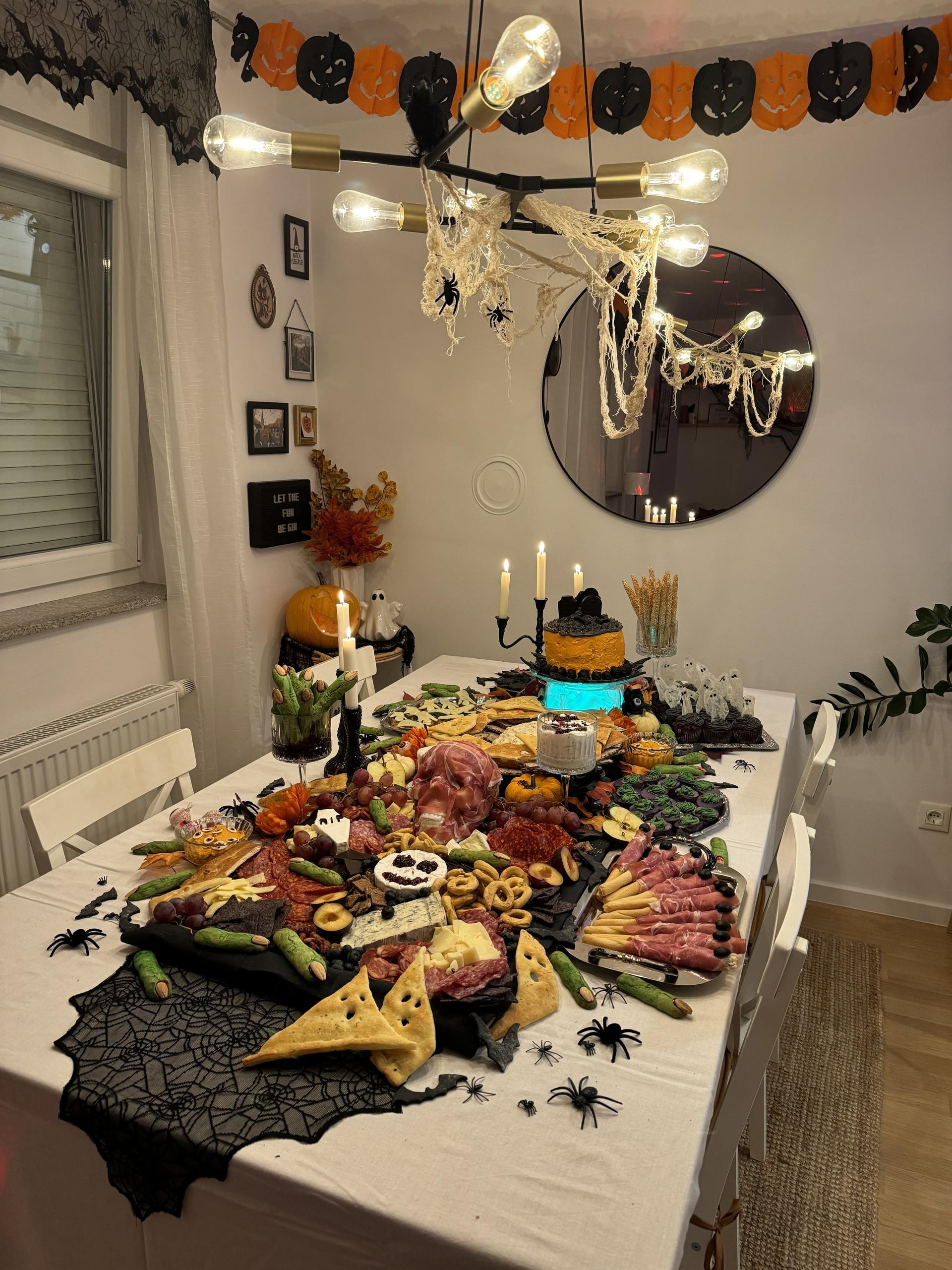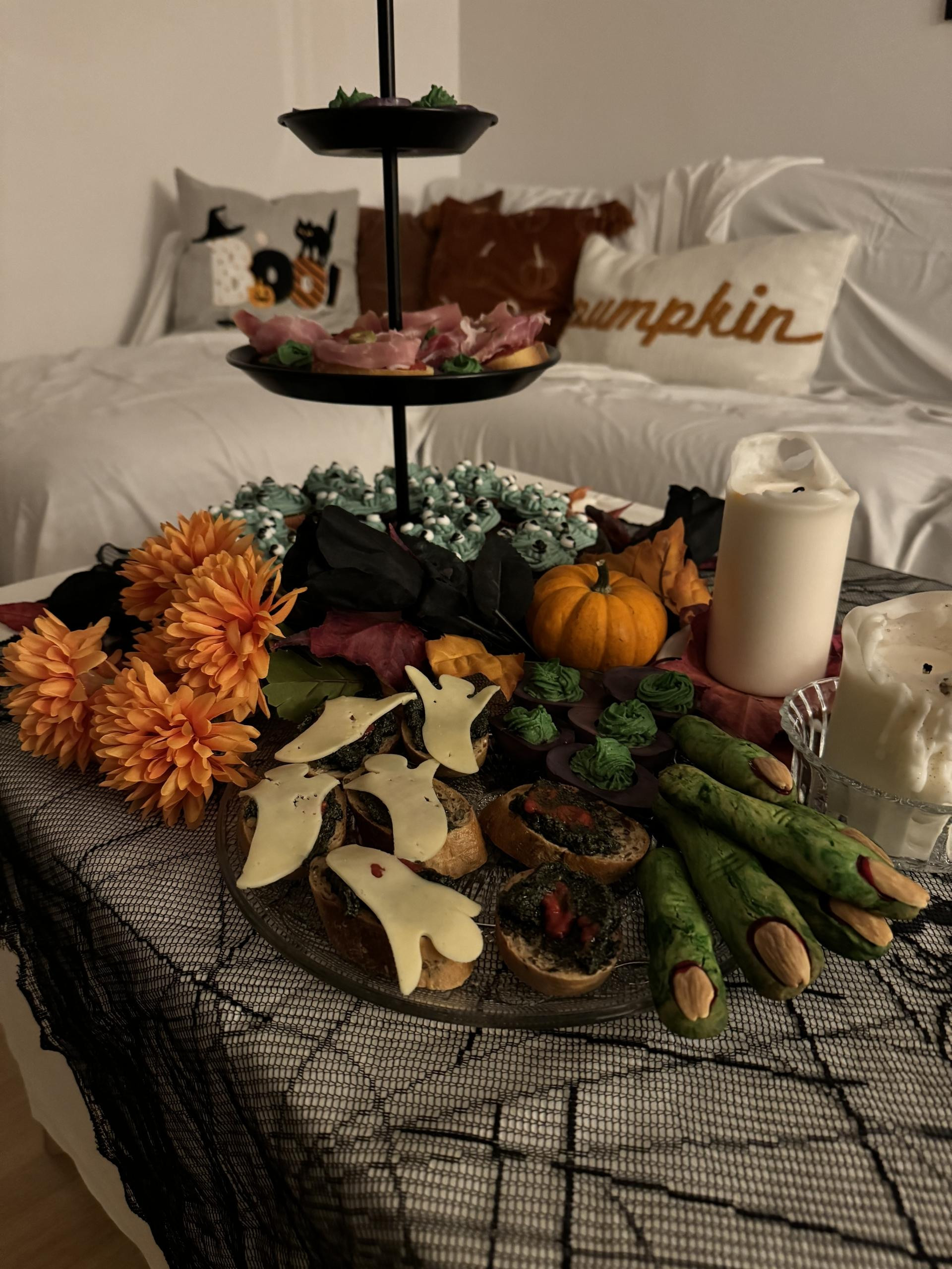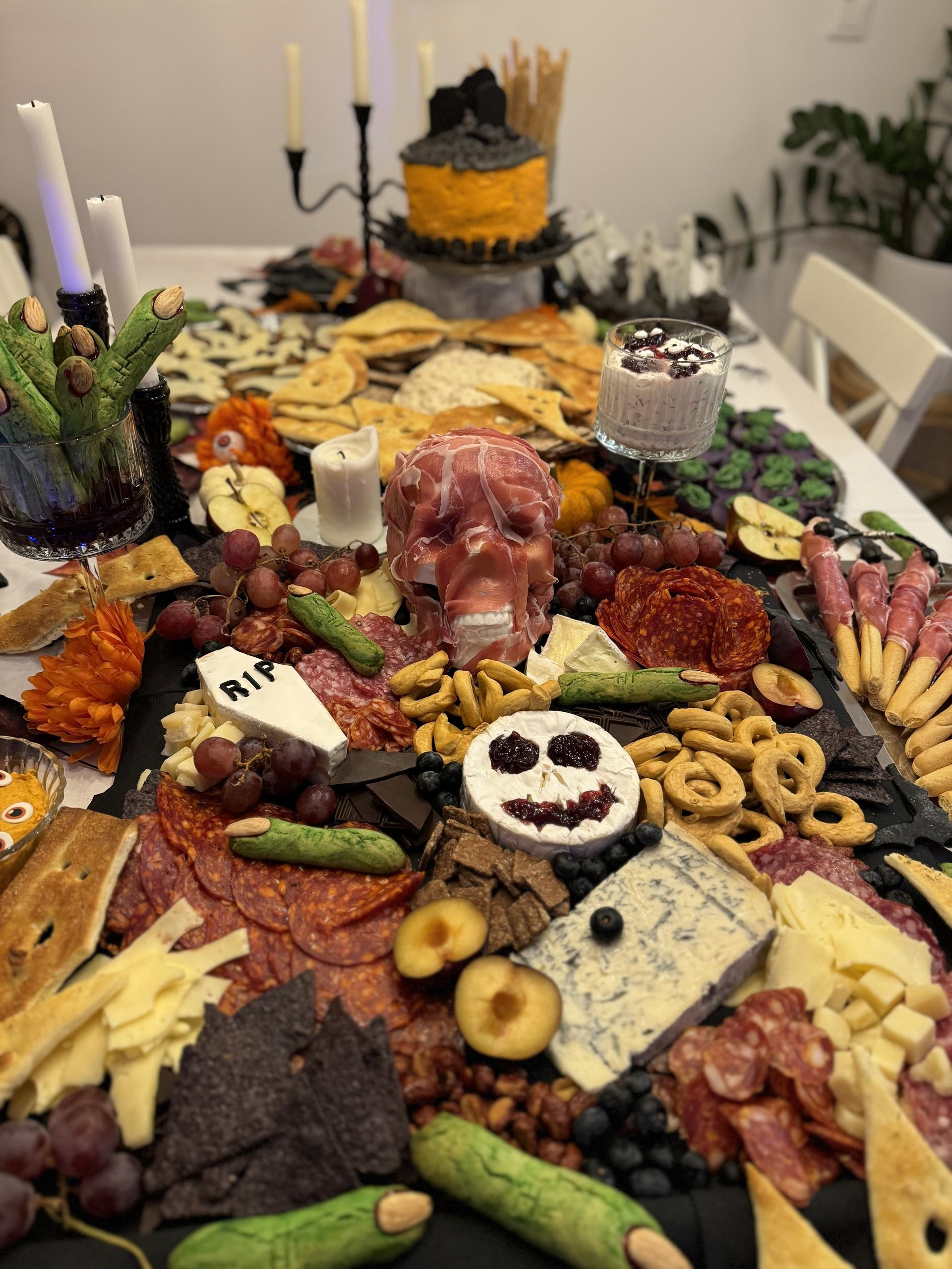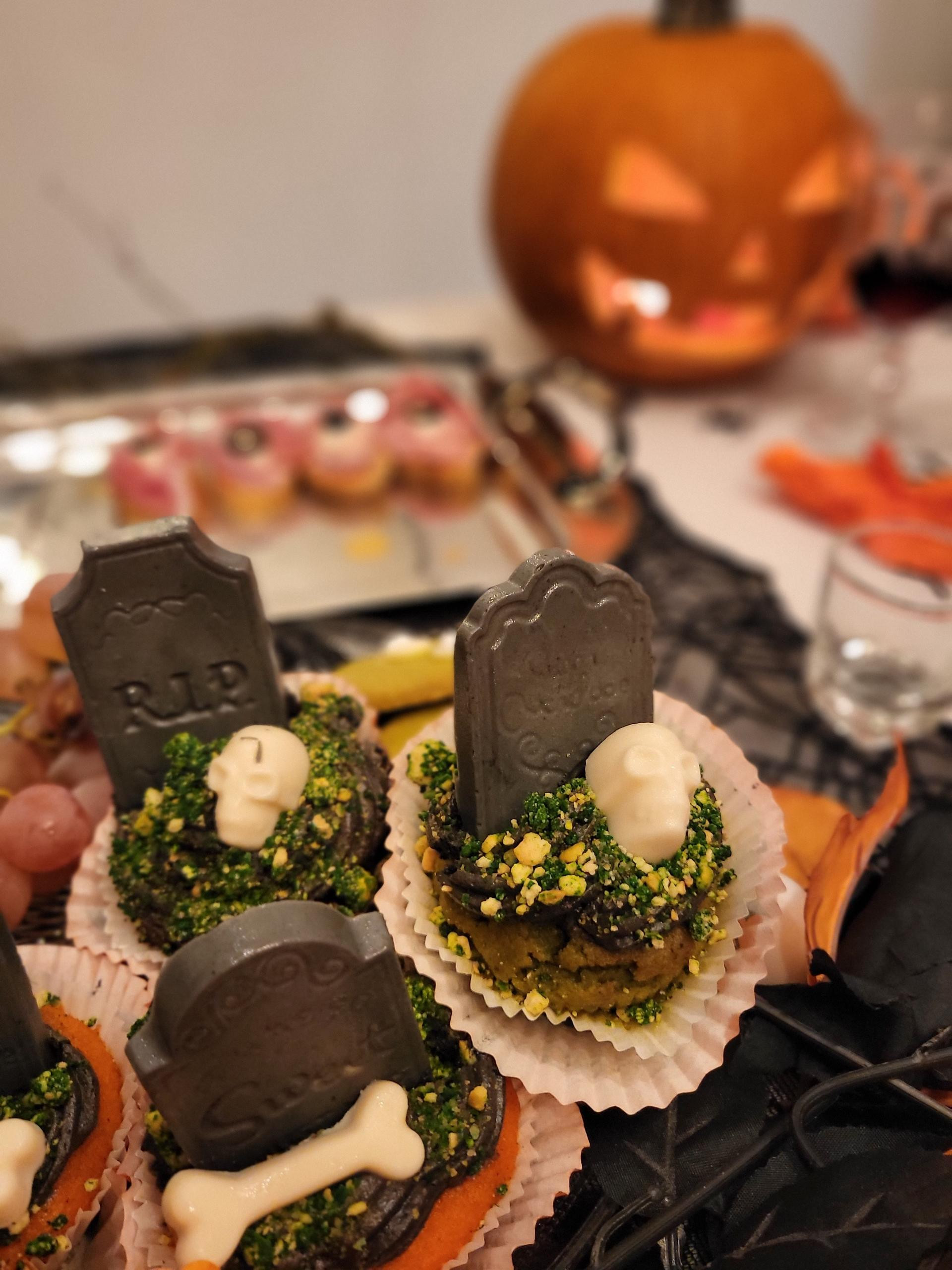 Pokazuje nam i fotografije s prošlogodišnjeg okupljanja, a nama za oko prvo zapne bogat izbor pripremljenih jela. Jestivo nadgrobno kamenje, slatke očne jabučice, šprice punjene tamnocrvenim pićem, polovice krušaka izdubljenih očiju i usta, nalik duhovima, grickalice u obliku zelenih prstića, jedno jelo kreativnije od drugog.