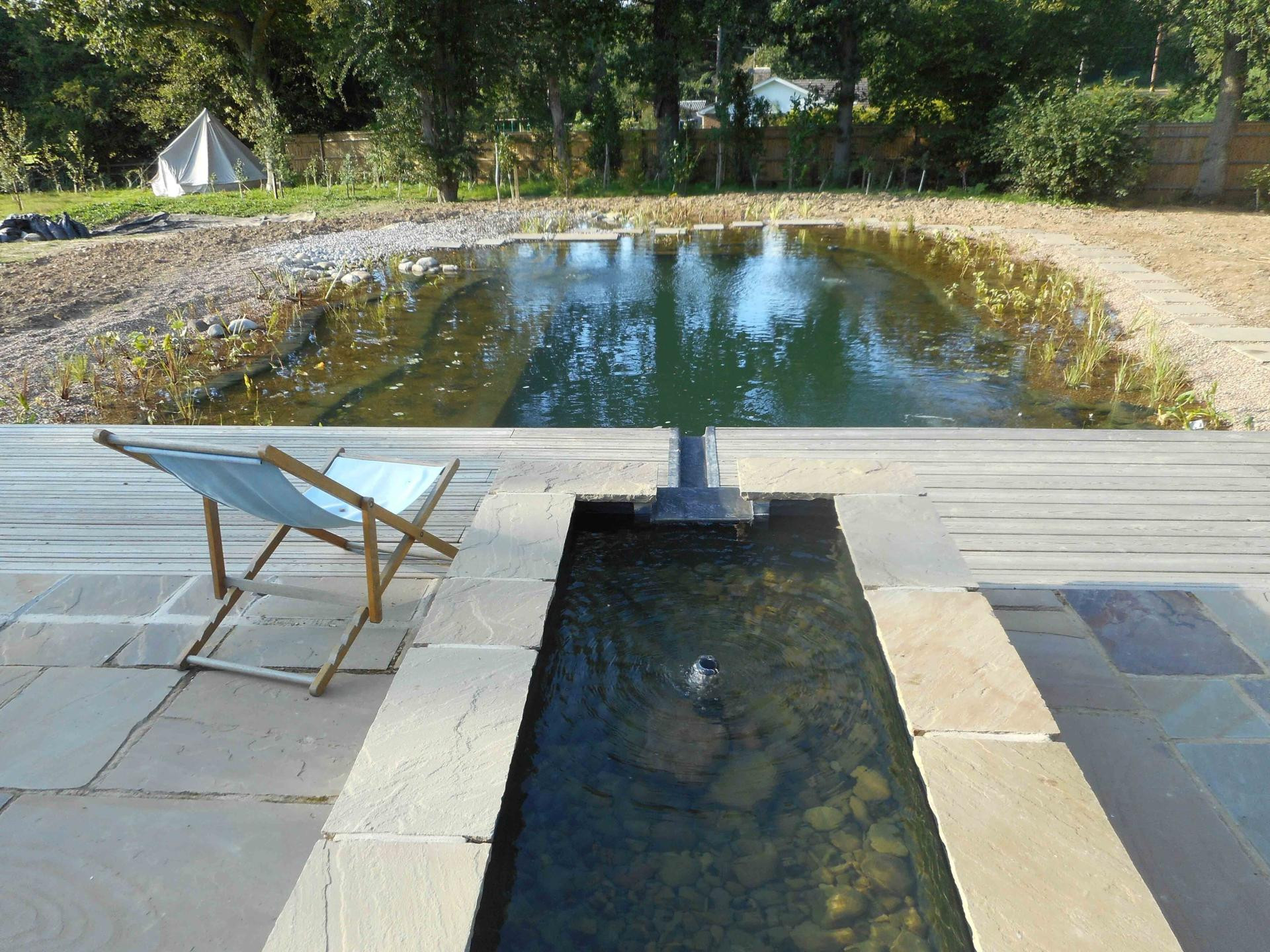 Njegov organski bazen podijeljen je na dvije zone: na dublji, pravokutni dio za plivanje i širu zonu sa sadnicama na kosini, gdje biljke poput vodene metvice, žabljaka i lopoča upijaju hranjive tvari iz vode. Ispod pijeska i šljunka, perforirane cijevi lagano provlače vodu oko korijenja, potičući dodatno pročišćavanje. Korištenje kišnice umjesto vode iz vodovoda još je jedan pametan korak - jer voda iz slavine često sadrži fosfate koji potiču rast algi.