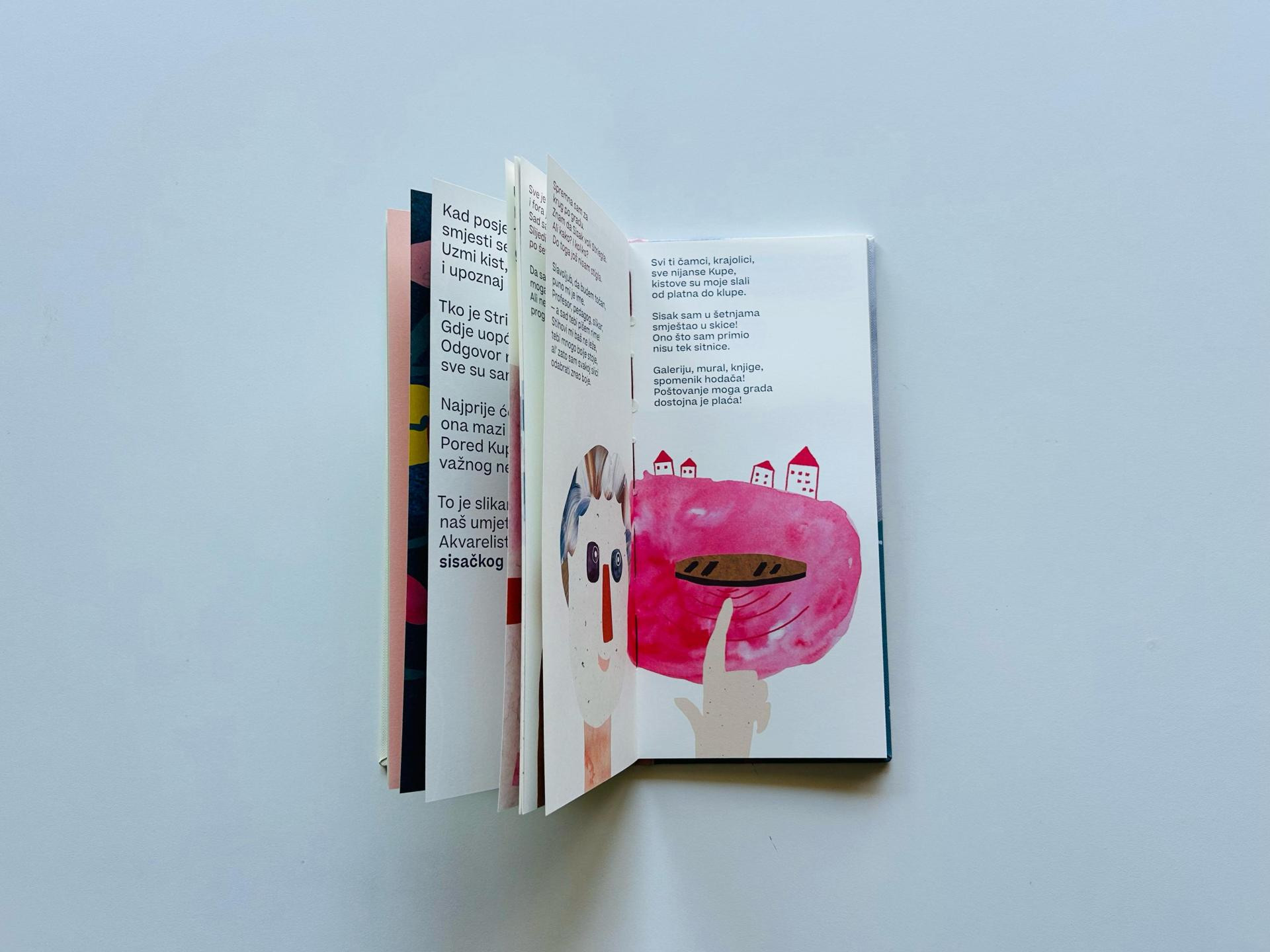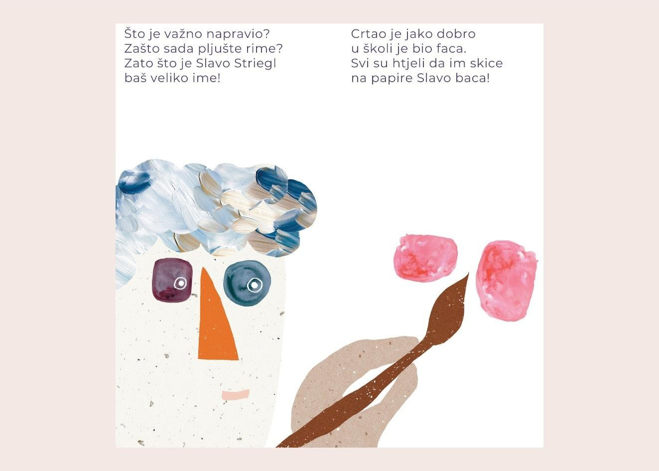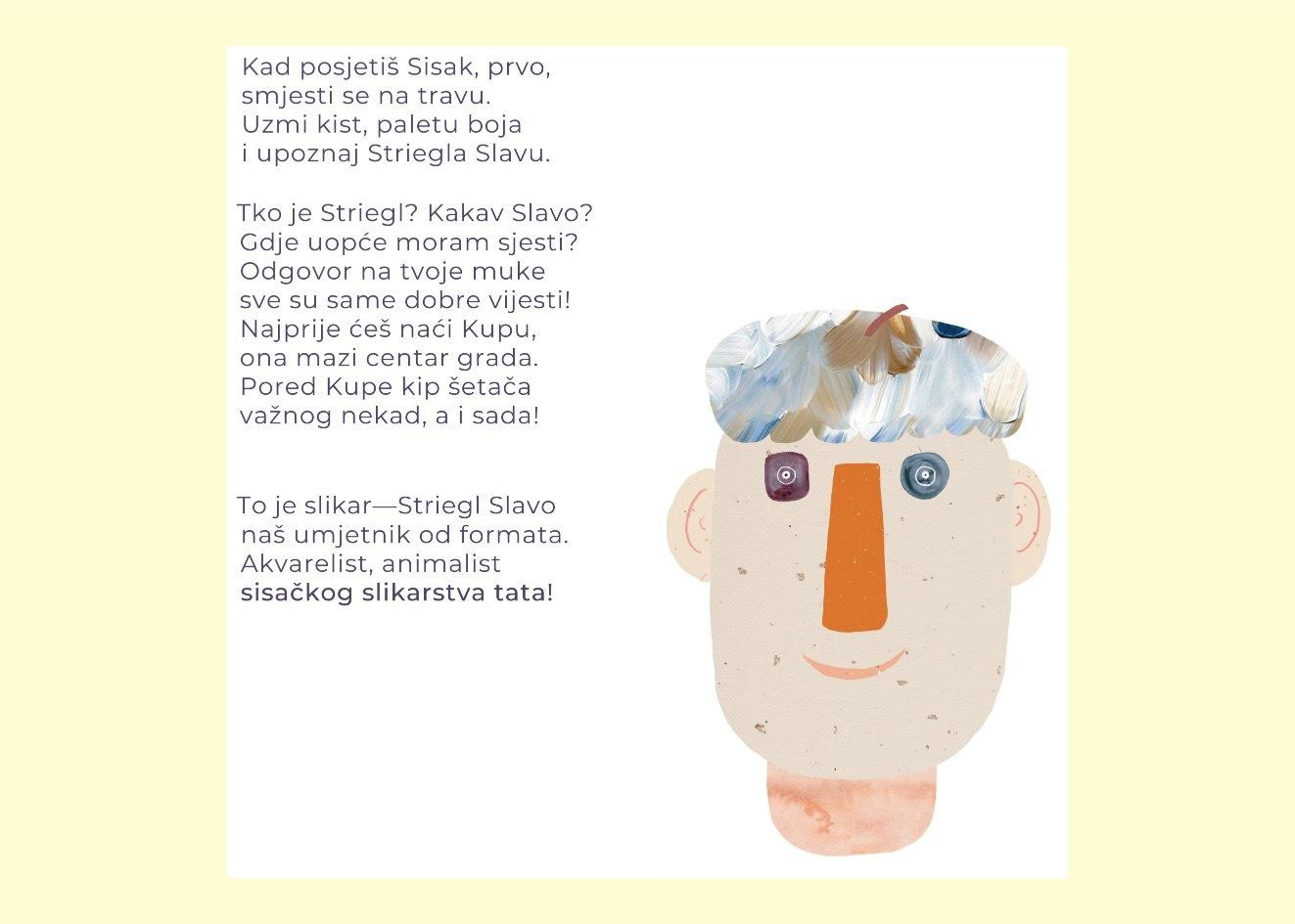 Ovo izdanje namijenjeno je prvenstveno djeci kako bi im se približio svijet umjetnosti i kreativnosti na način koji im je najbliži, a to je igra slike i pitkih riječi. Kroz avanturu čitanja i gledanja djeca na zabavan način imaju mogućnost usvajanja zanimljivih informacija o gradu u kojem žive, ali i o važnosti umjetnosti u njihovoj i našoj svakodnevici. Slikovnica funkcionira kao svojevrstan vodič kroz Sisak okom i perspektivama umjetnika, koji su u ovom slučaju i Striegl i djeca koja knjigu čitaju. Knjiga ima dva segmenta, jedan se odnosi na Strieglvo život ispričan kroz razgovor u stihu između imaginarne djevojčice i Striegla, dok drugi dio donosi zabavne i poučne informacije o Strieglovom djetinjstvu i njegovoj umjetnosti koje su popraćene idejama za daljnje istraživanje i aktivnostima.